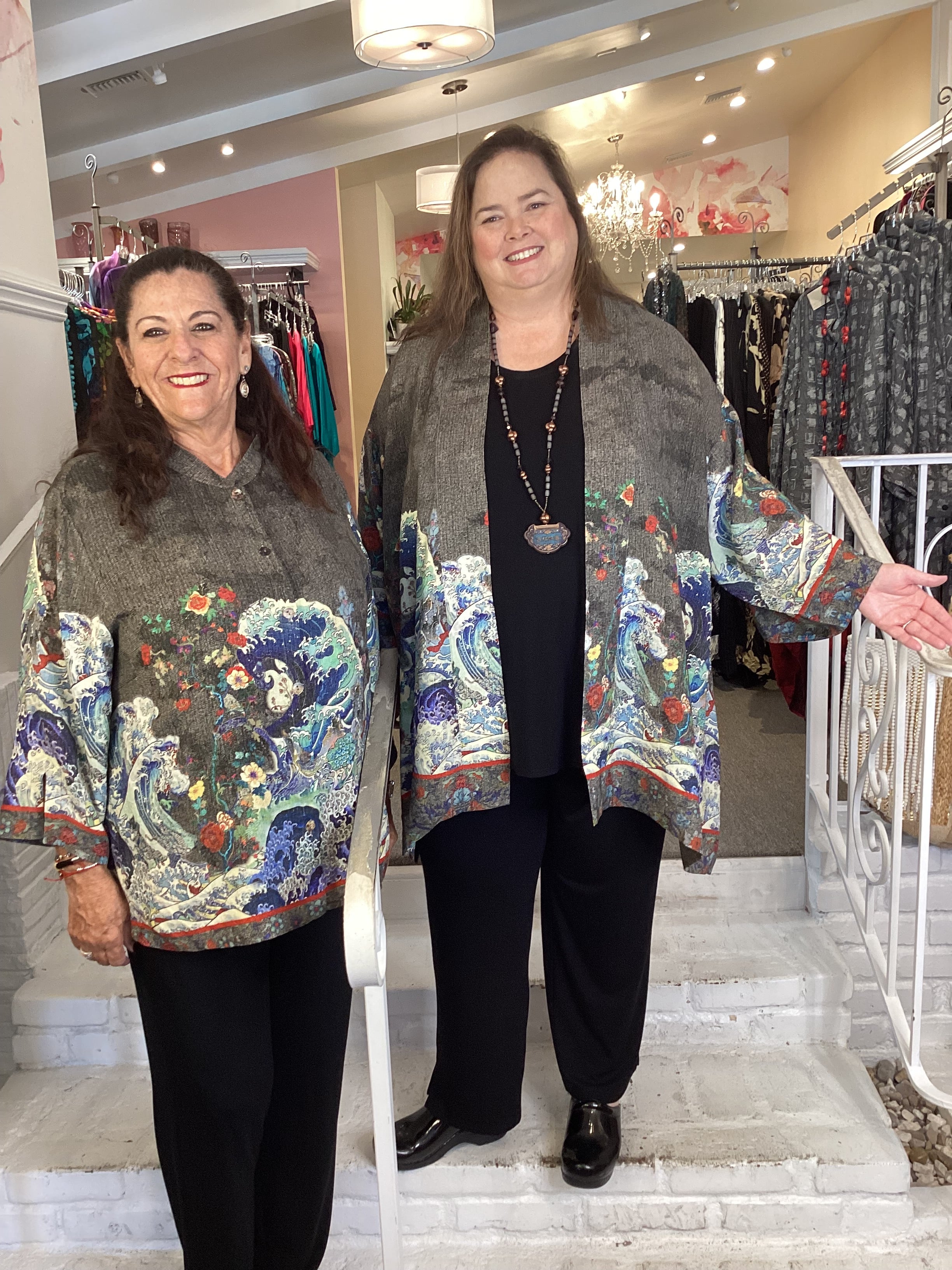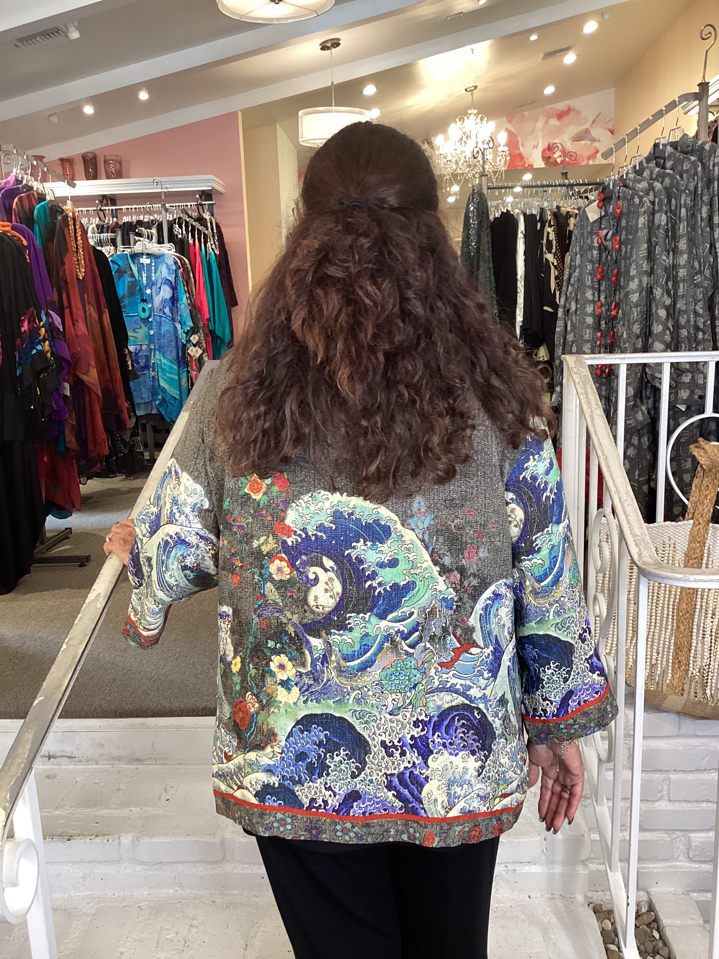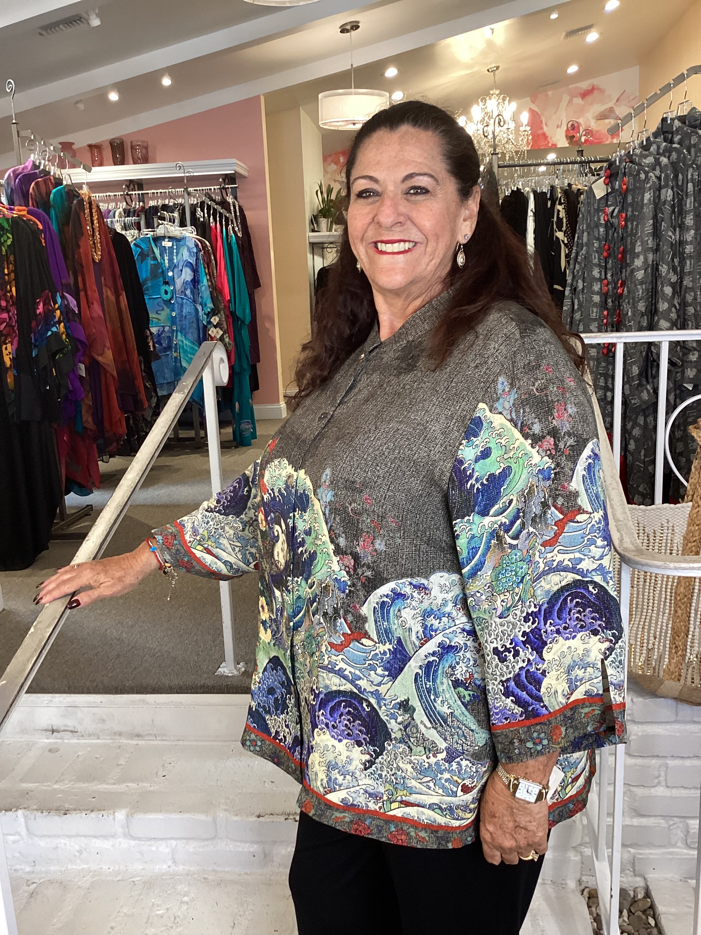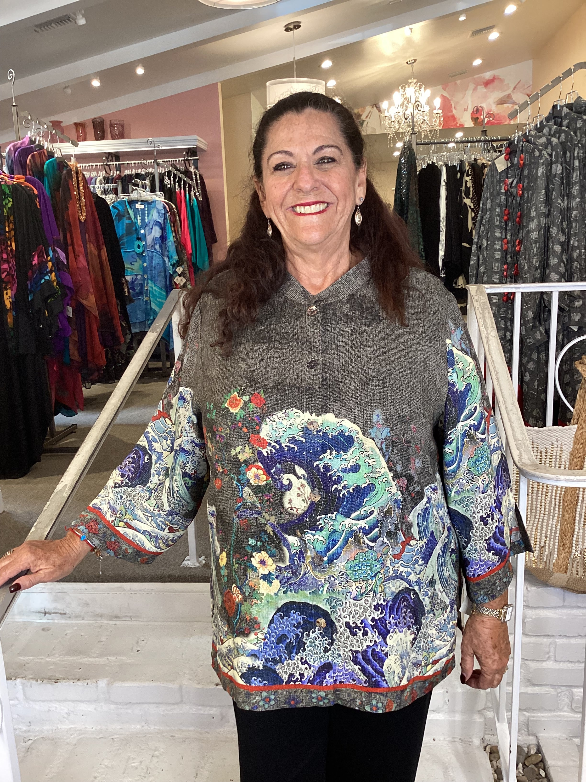 Classic Citron style blouse is styled in our signature Textured Silk. Ocean wave art is beautifully placed against a warm gray-hued background and artfully combined with accentuating red flowers. Matching border on hem and sleeves frames the print. The blouse has 3/4 sleeves with slits, a mandarin collar and is slightly cropped.