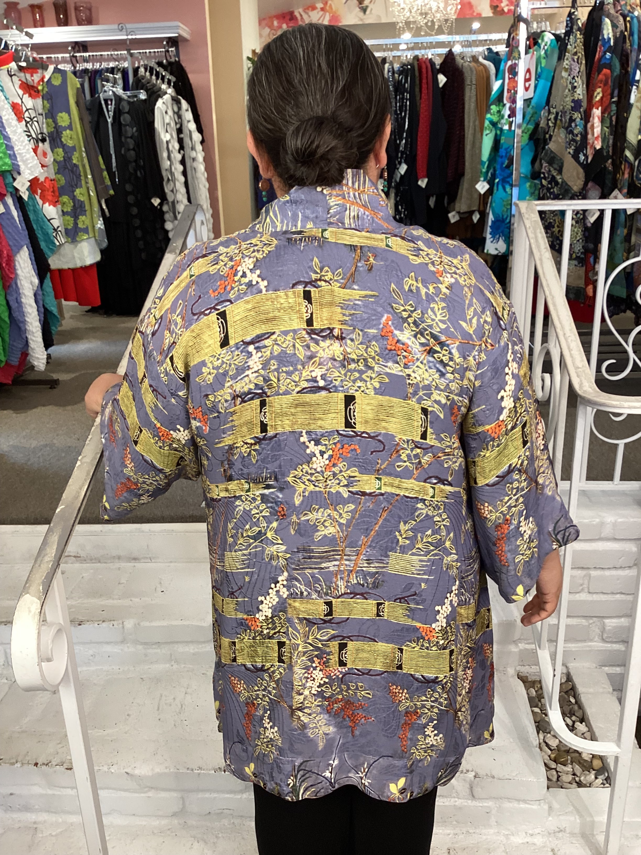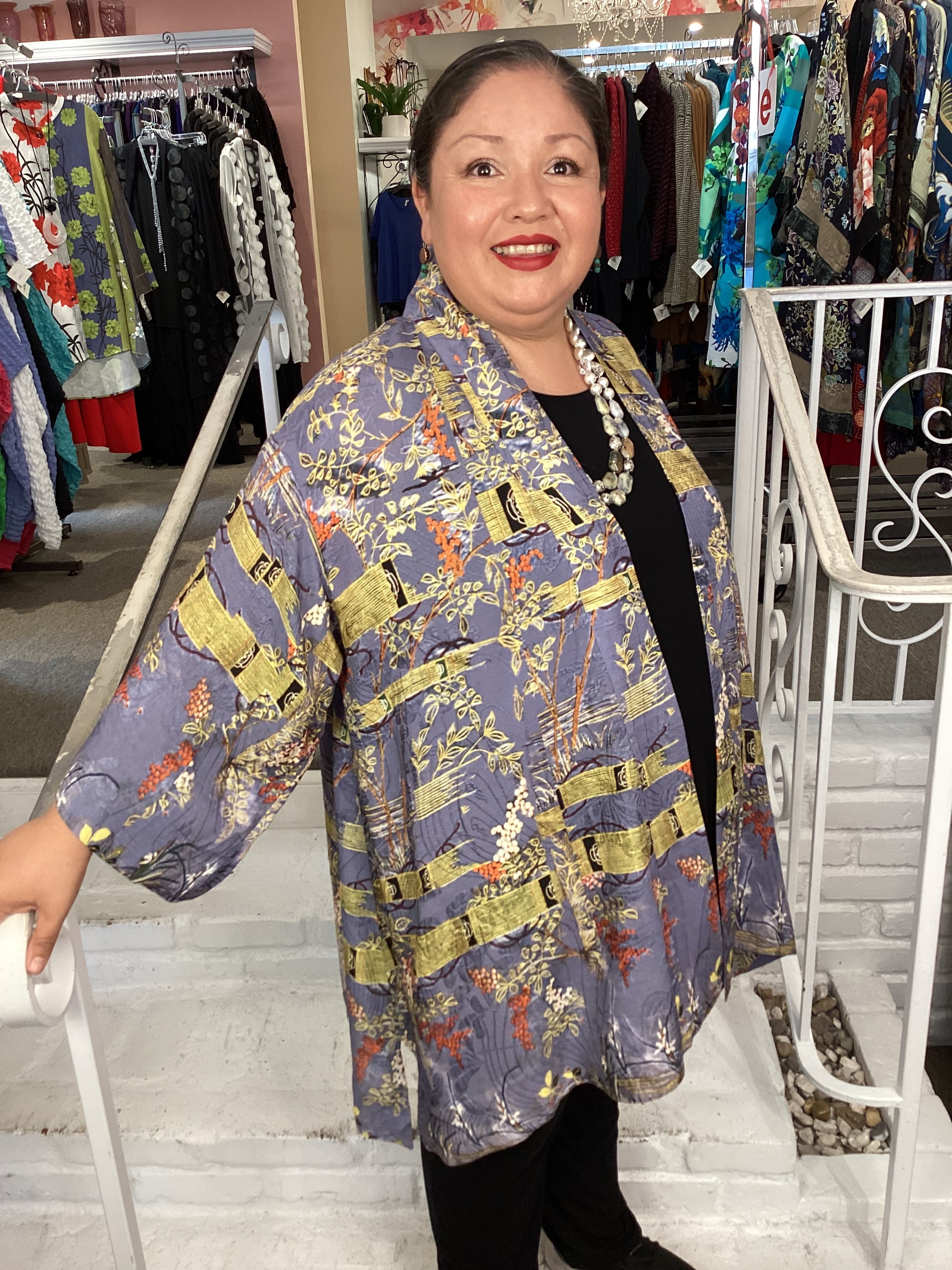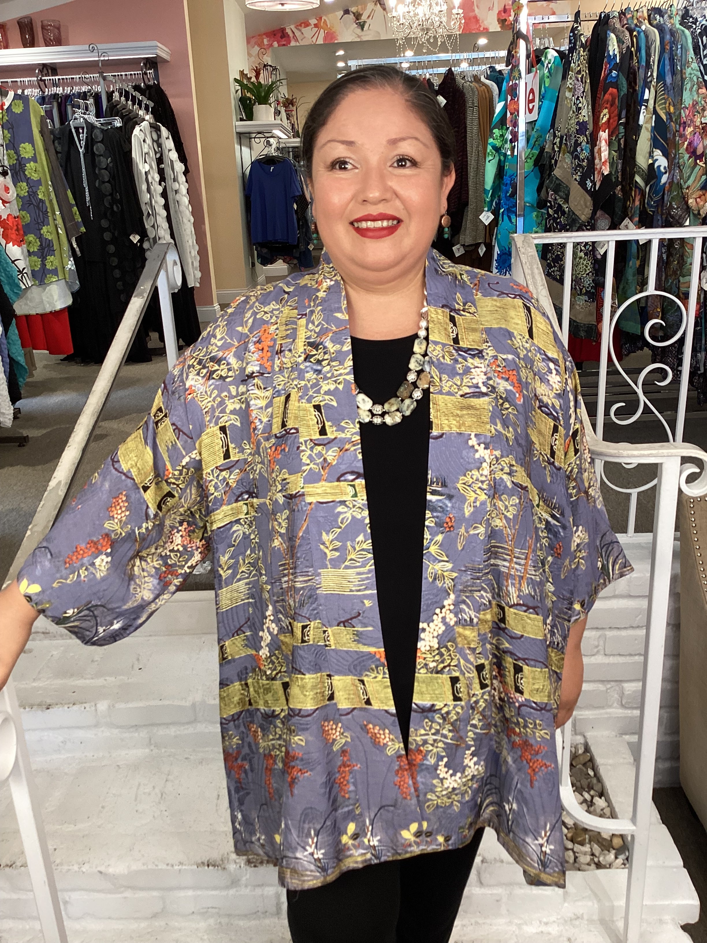 Open front kimono top in our signature Silk Blend fabrication. The print features wisteria with light blue background and floral art infused with accent colors of gold and red. This versatile style can be dressed up or down, making it perfect for any occasion.