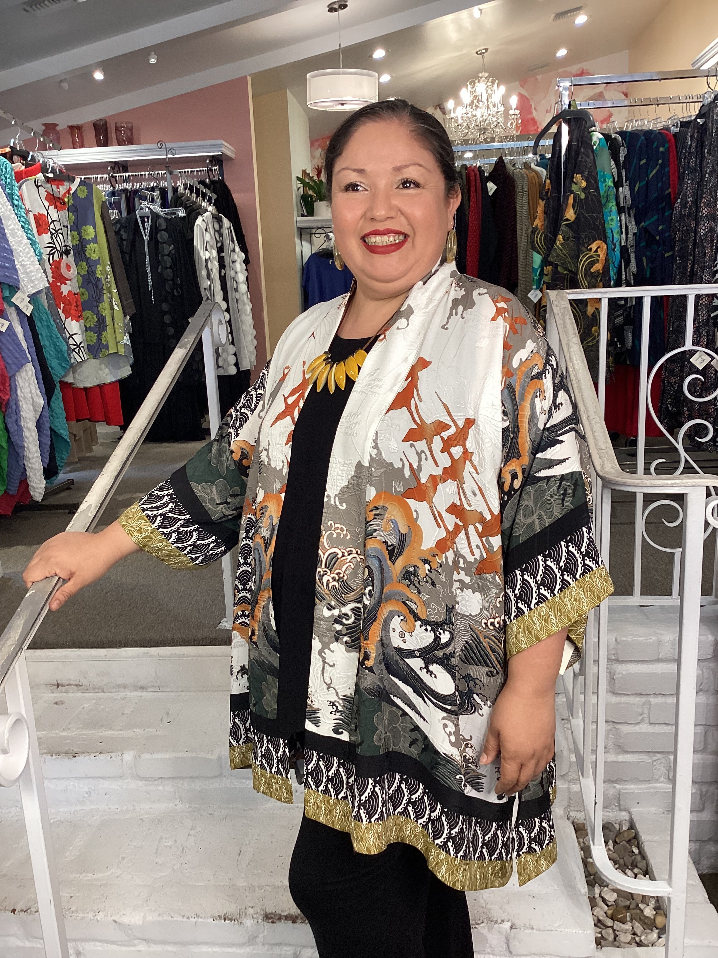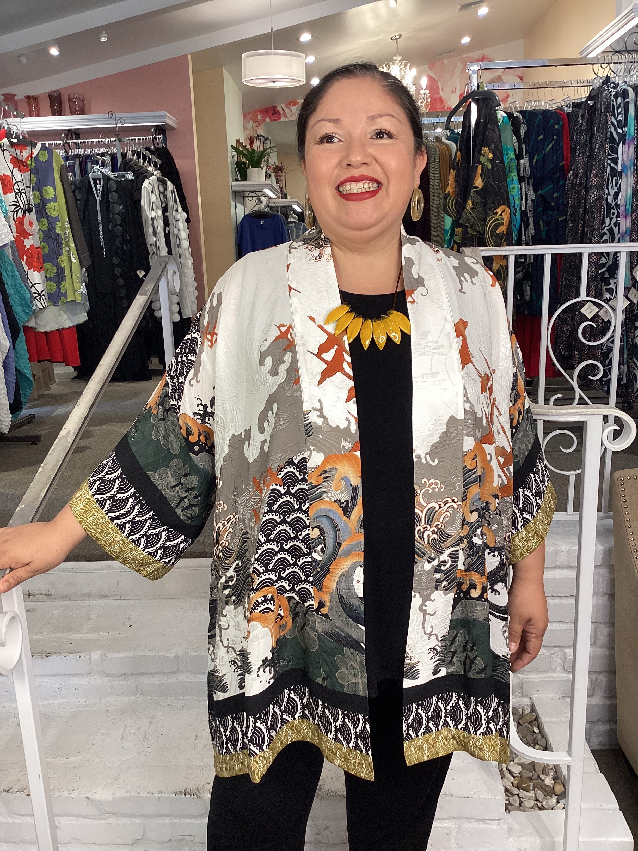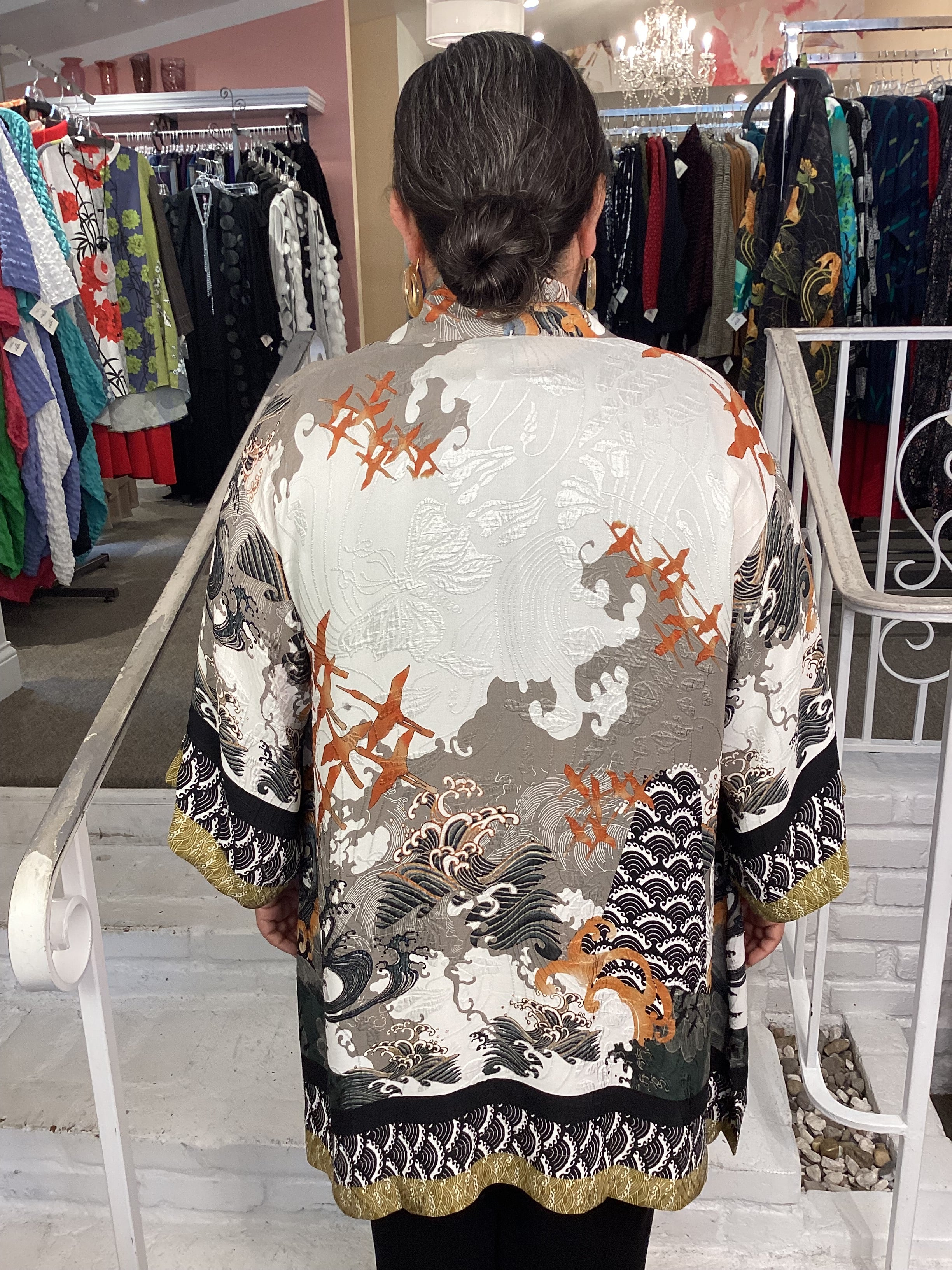 Beautiful open front kimono top in our signature textured Silk Blend fabrication. An intricate pattern featuring waves, cranes and shibori elements in subtle colors with a wide contrast on hem and sleeves. Flowing, 3/4 sleeves, banded lapel. Loose, flowing open front, drapes down on sides.