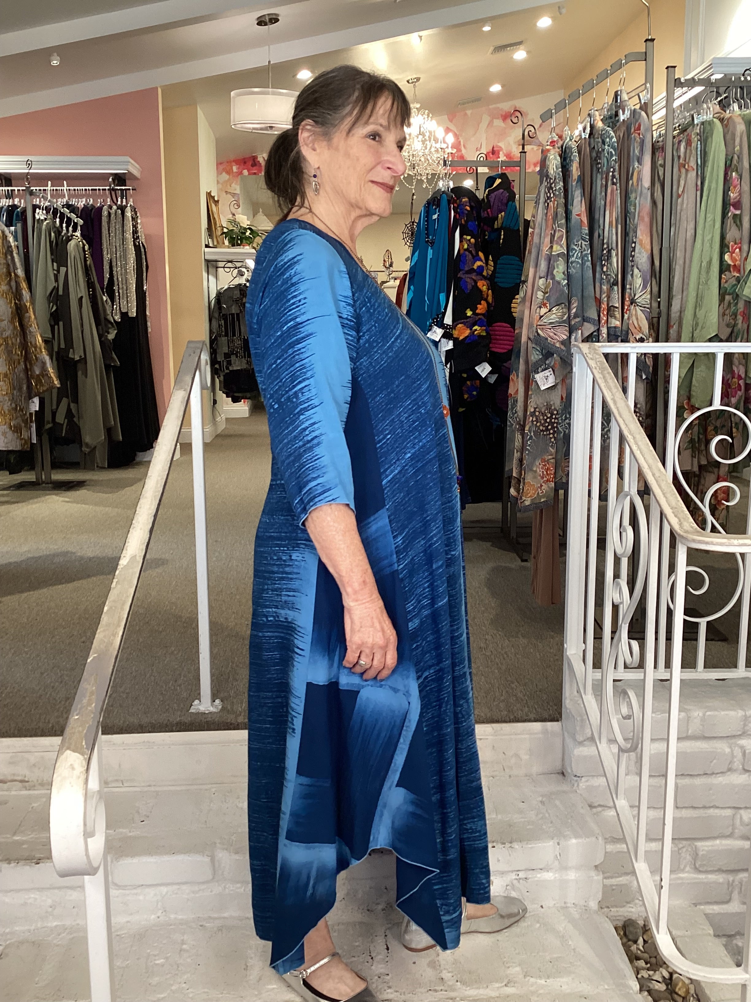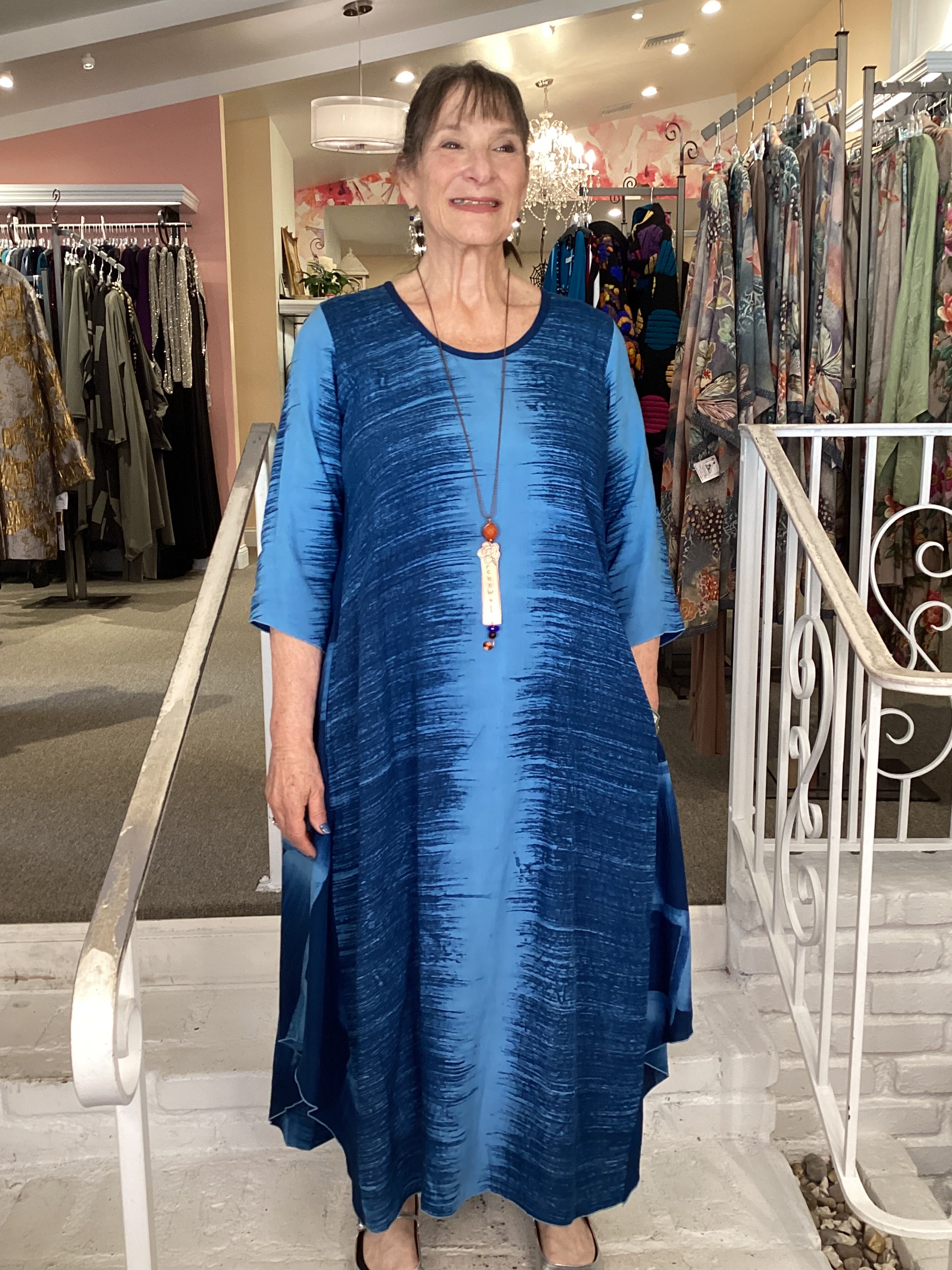 The "AR" dress is an A-line flowy rayon Batik printed dress in turquoise and aqua , Batik print with a round neck and flowy body perfect for ANY occasion.