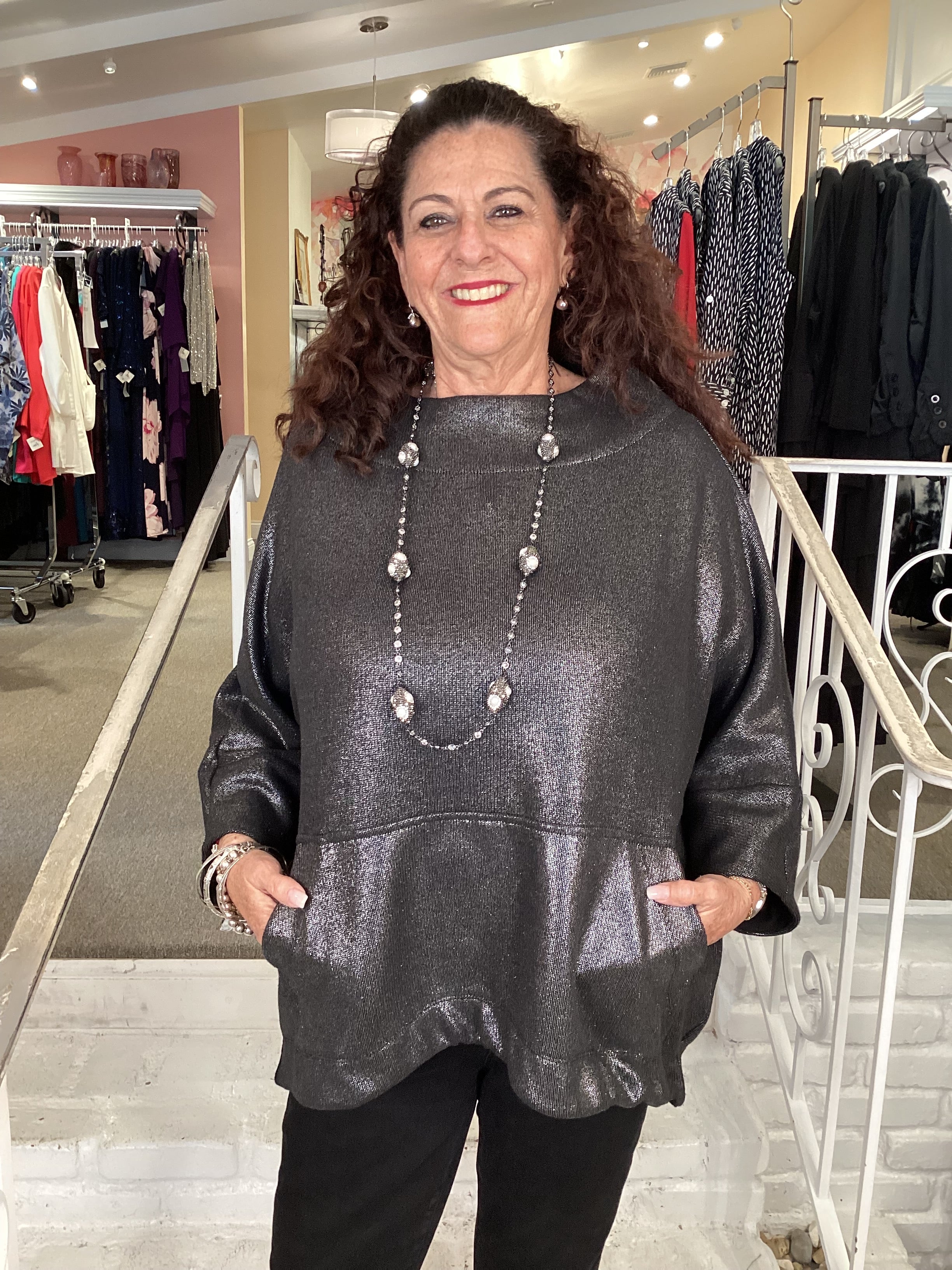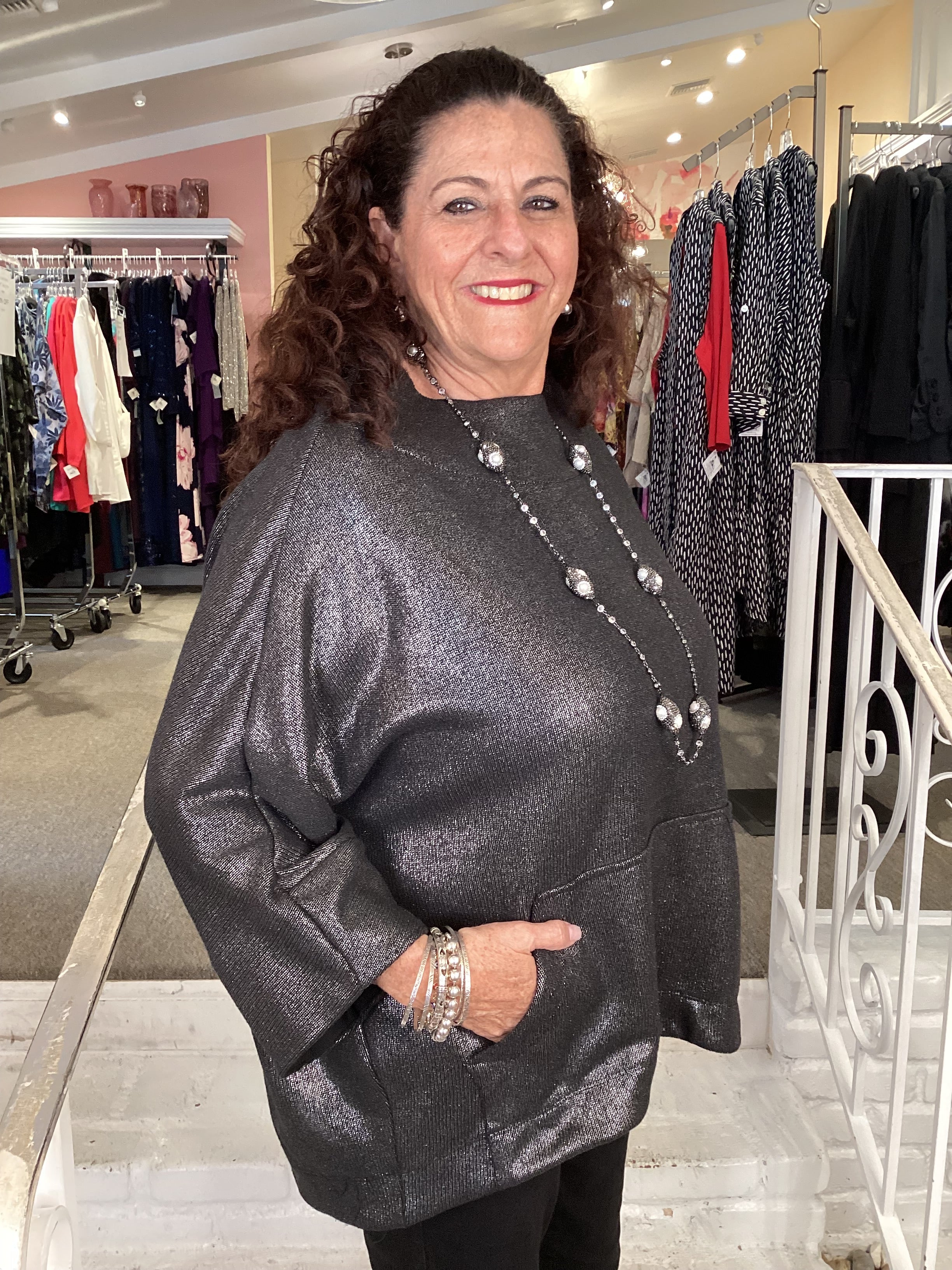 Elevate your everyday wardrobe with the Roxy Tunic, a metallic pullover that blends shine with comfort. Crafted from a soft cotton-blend knit with subtle sparkle, this piece features a rounded silhouette, dolman 3/4 sleeves, and a cozy funnel neck. The kangaroo pocket adds practicality.