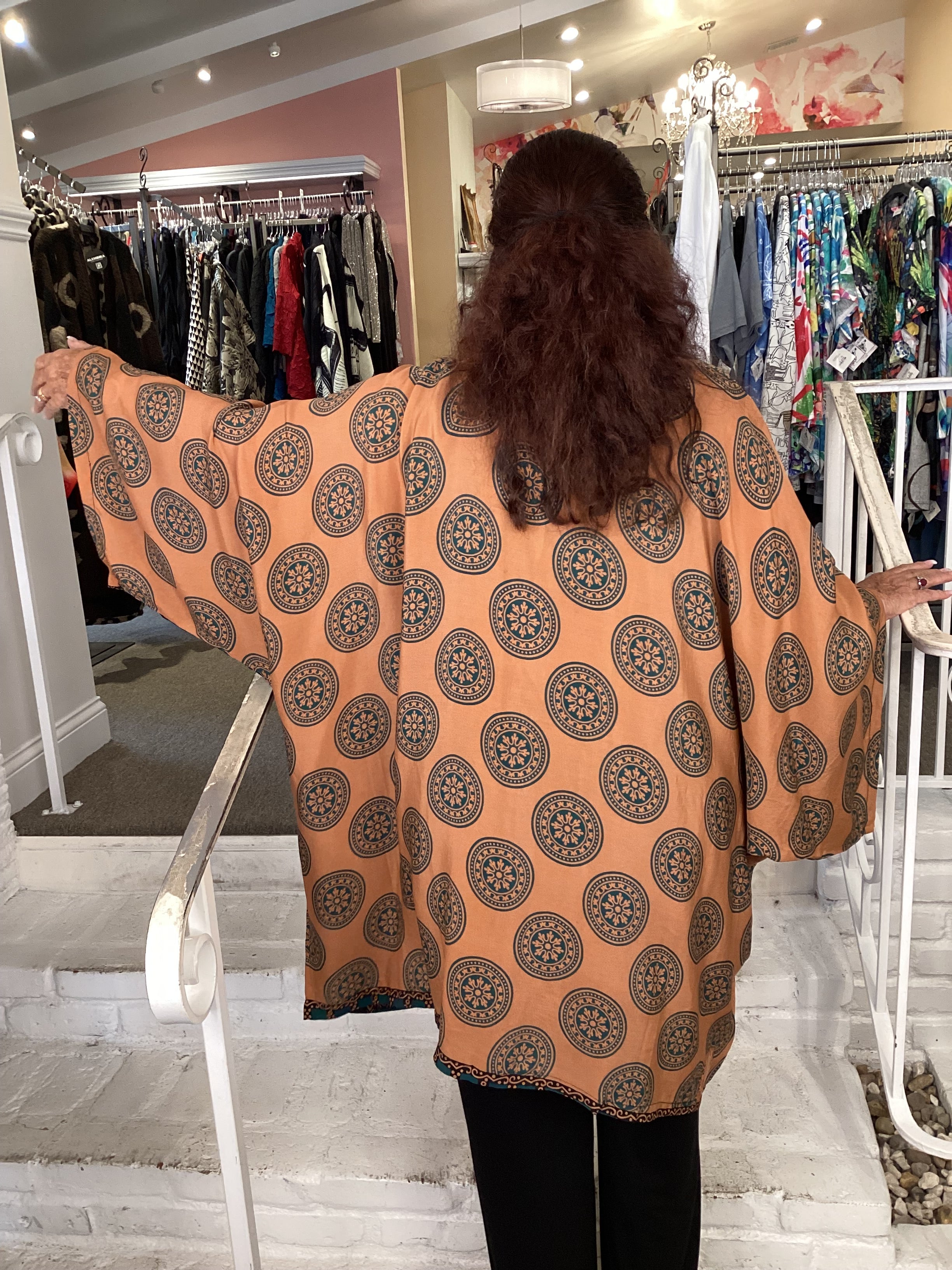 The CREPE GAIA KIMONO showcases an oversized silhouette with gracefully draped kimono sleeves and an open front design. Two functional pockets add everyday practicality to this statement piece. Finished in a vibrant abstract print, this one-of-a-kind layer brings artistic flair and effortless sophistication to your wardrobe.