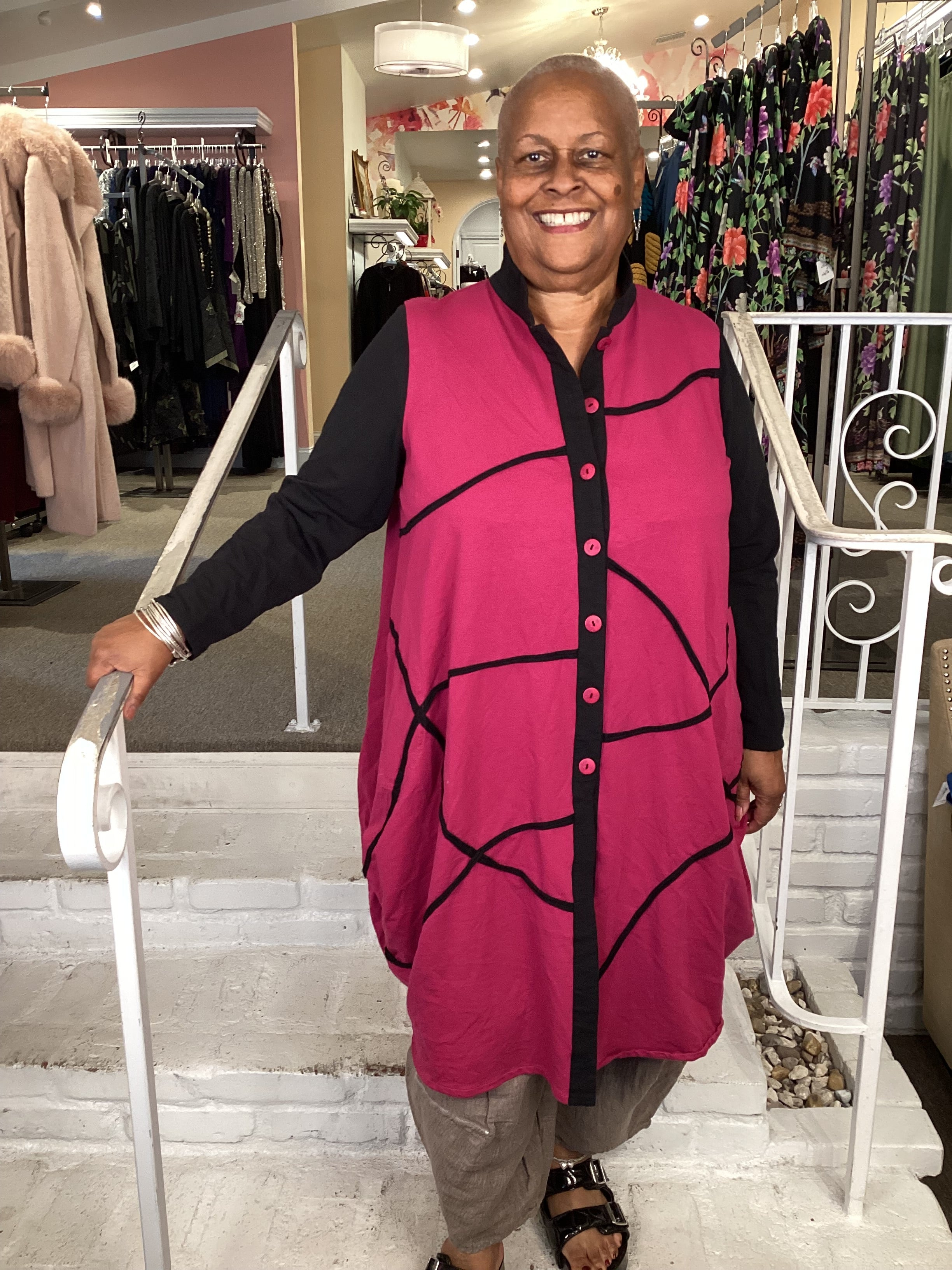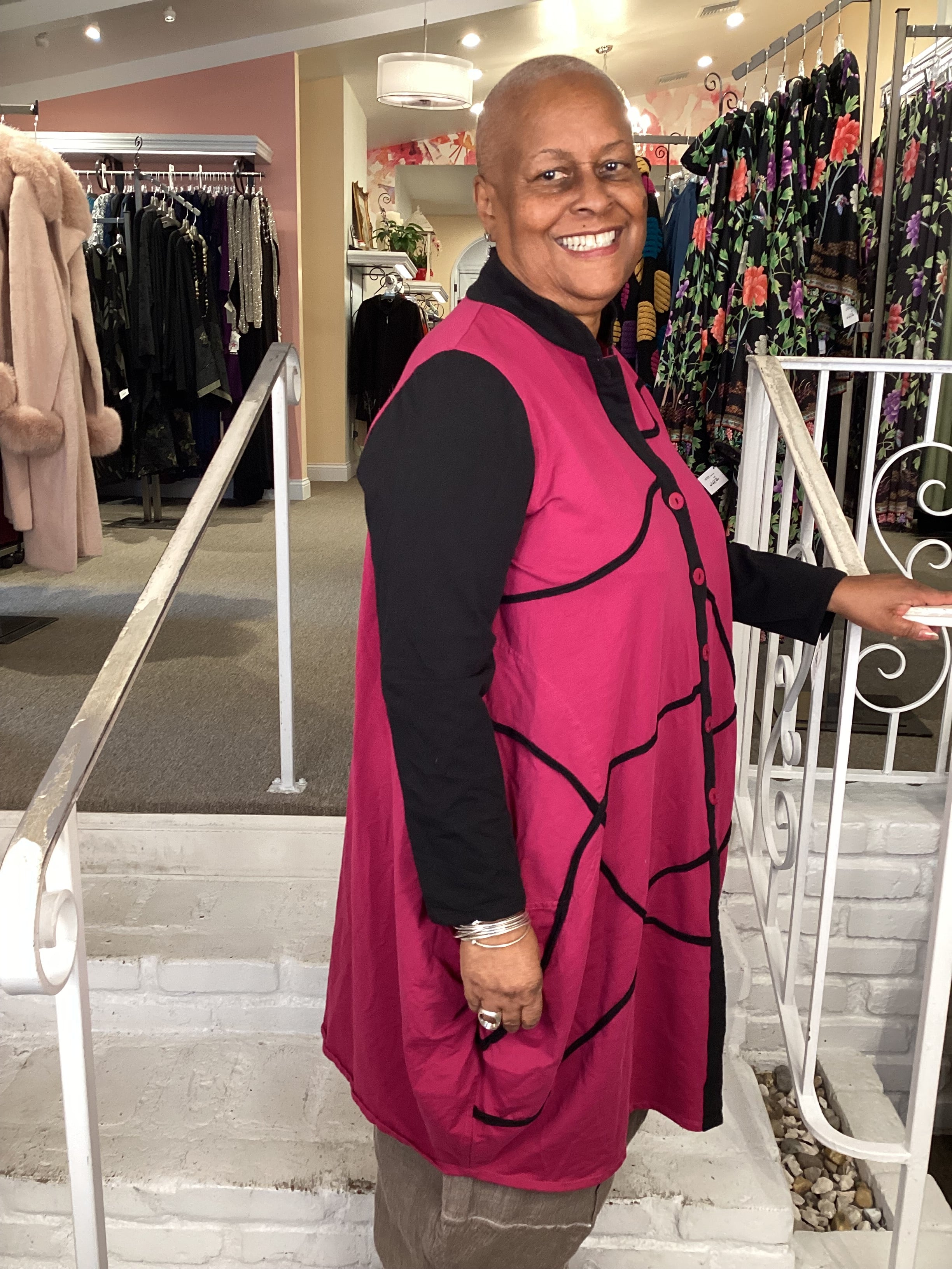 This Cheyenne comfortable, generous and unique "Art to Wear" Front Button, Abstract print Tunic. Designed for a woman who values individuality, originality and comfort. Poly/Spandex blend, machine wash cold.