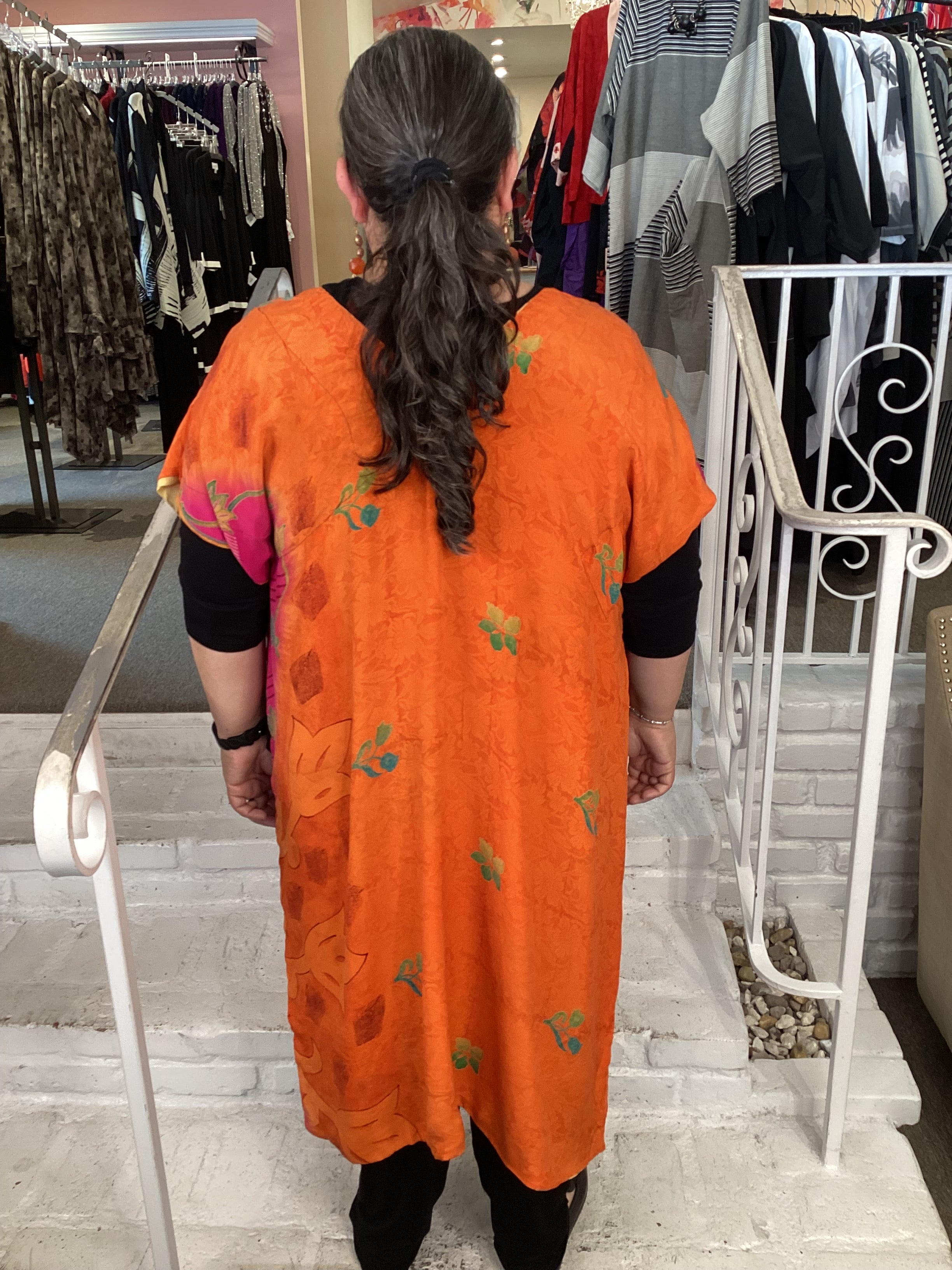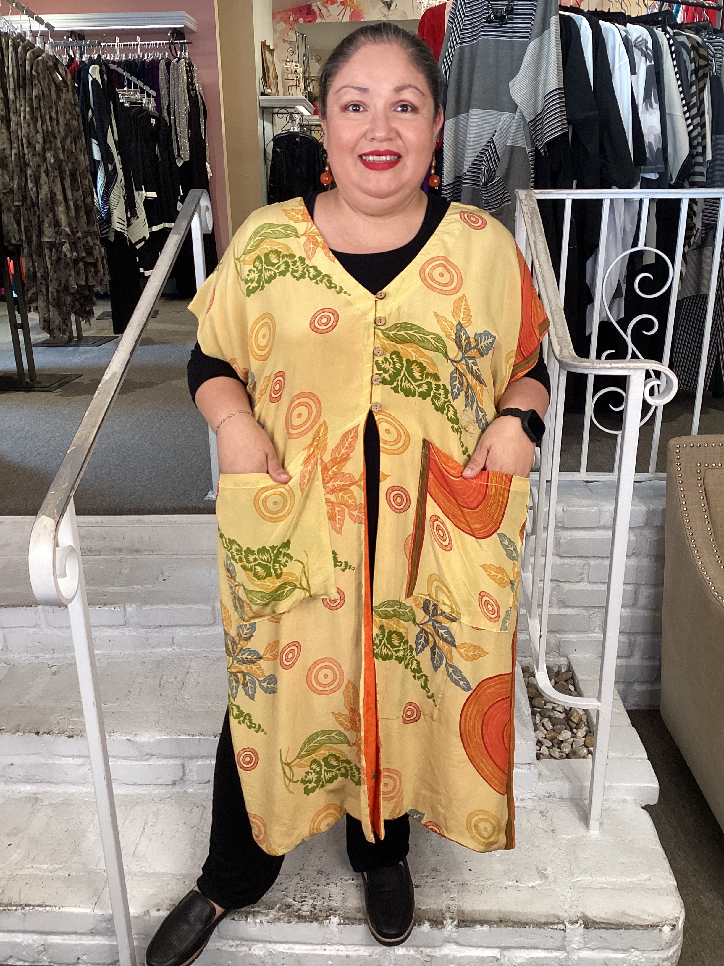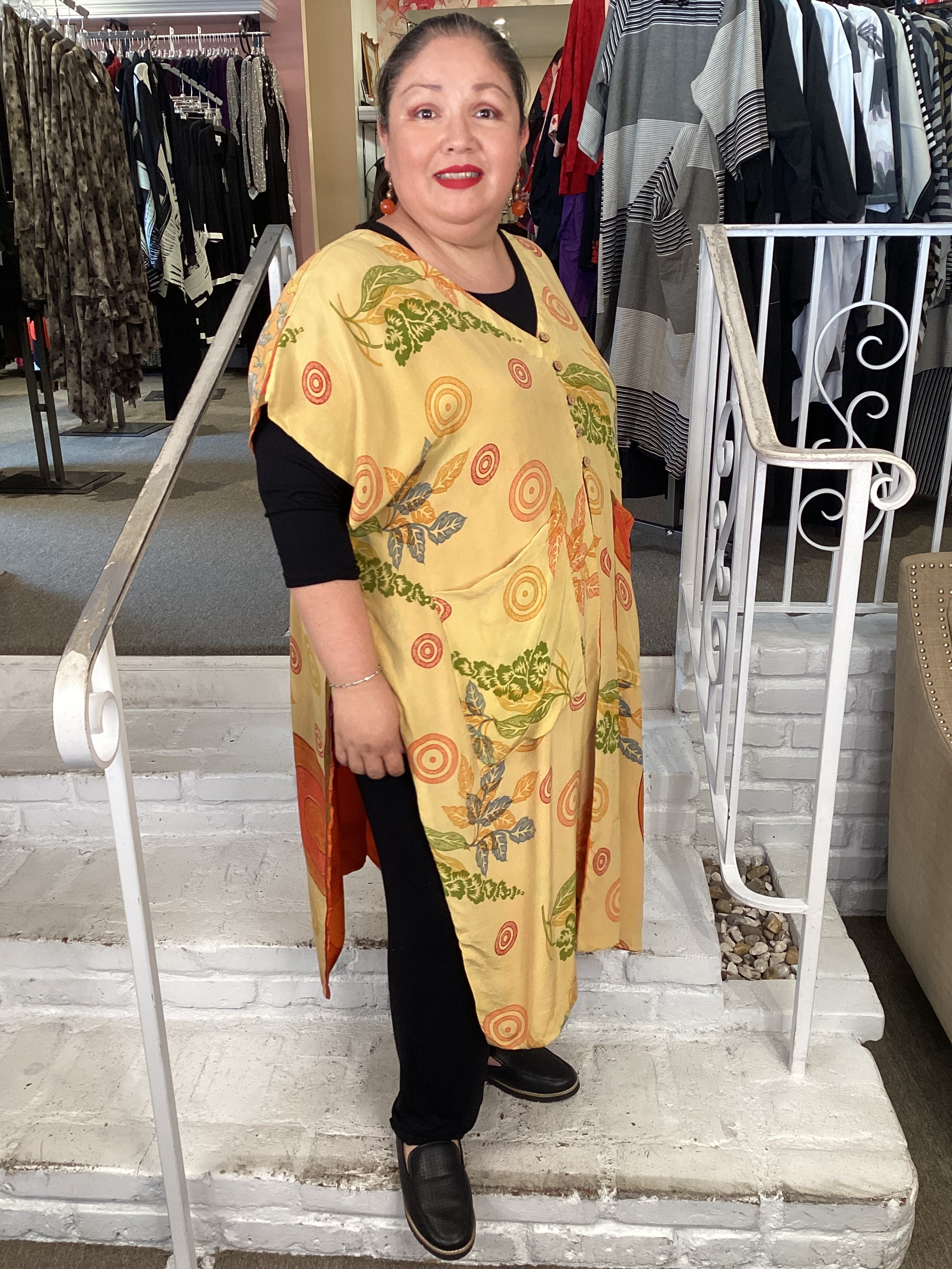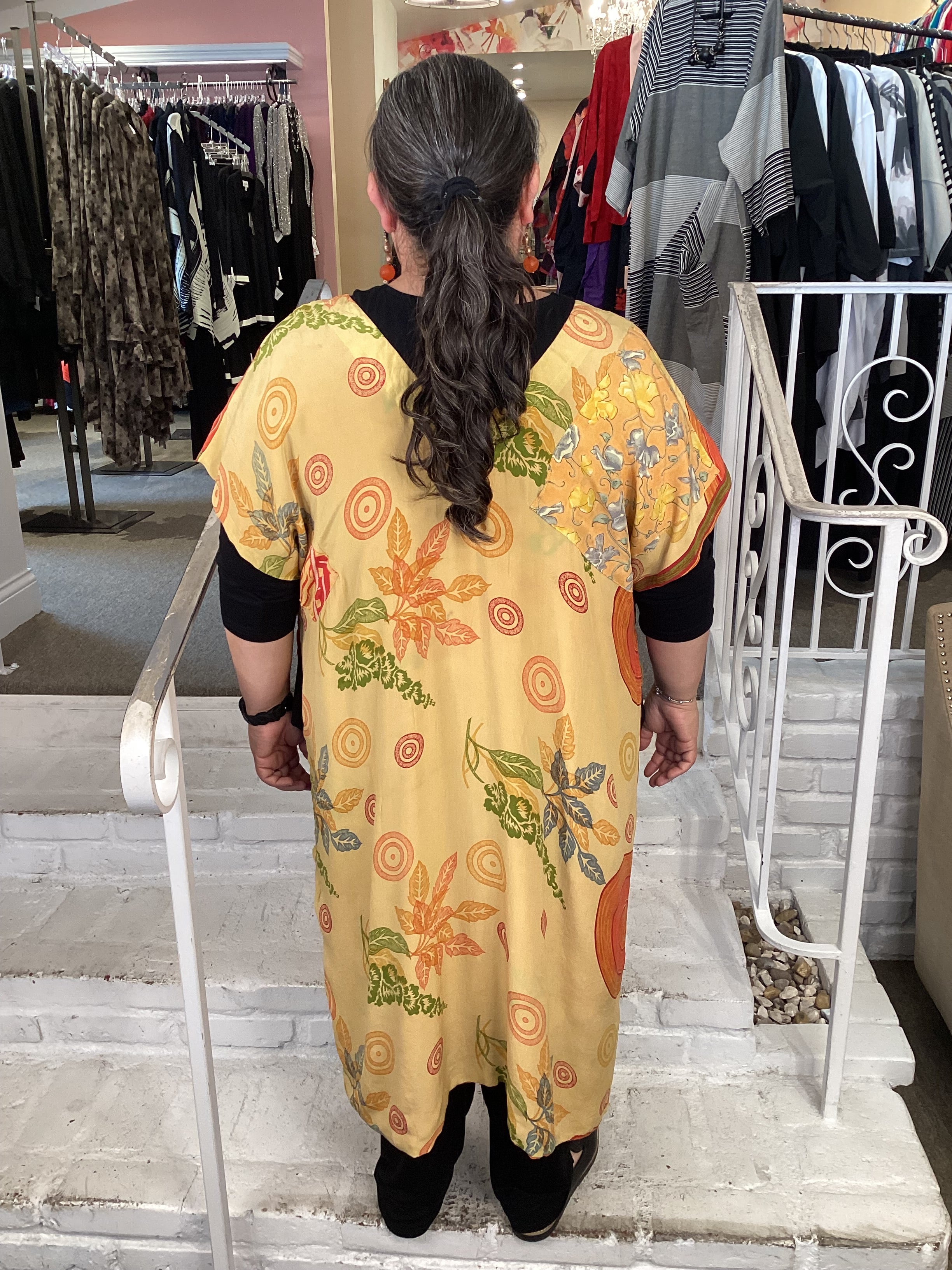 Discover the Duality Split Mumu, where vintage charm meets modern flair. Crafted from double layers of silky crepe, this fully reversible piece lets you switch up your style effortlessly. Functional buttons let you wear it open or closed, while pockets on both sides add practicality. Side slits create a playful dimension, giving your look a breezy, dynamic vibe. Embrace versatility with a wink of vintage elegance.