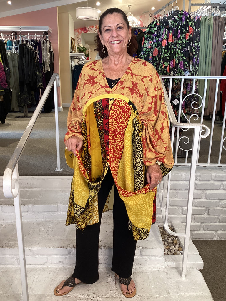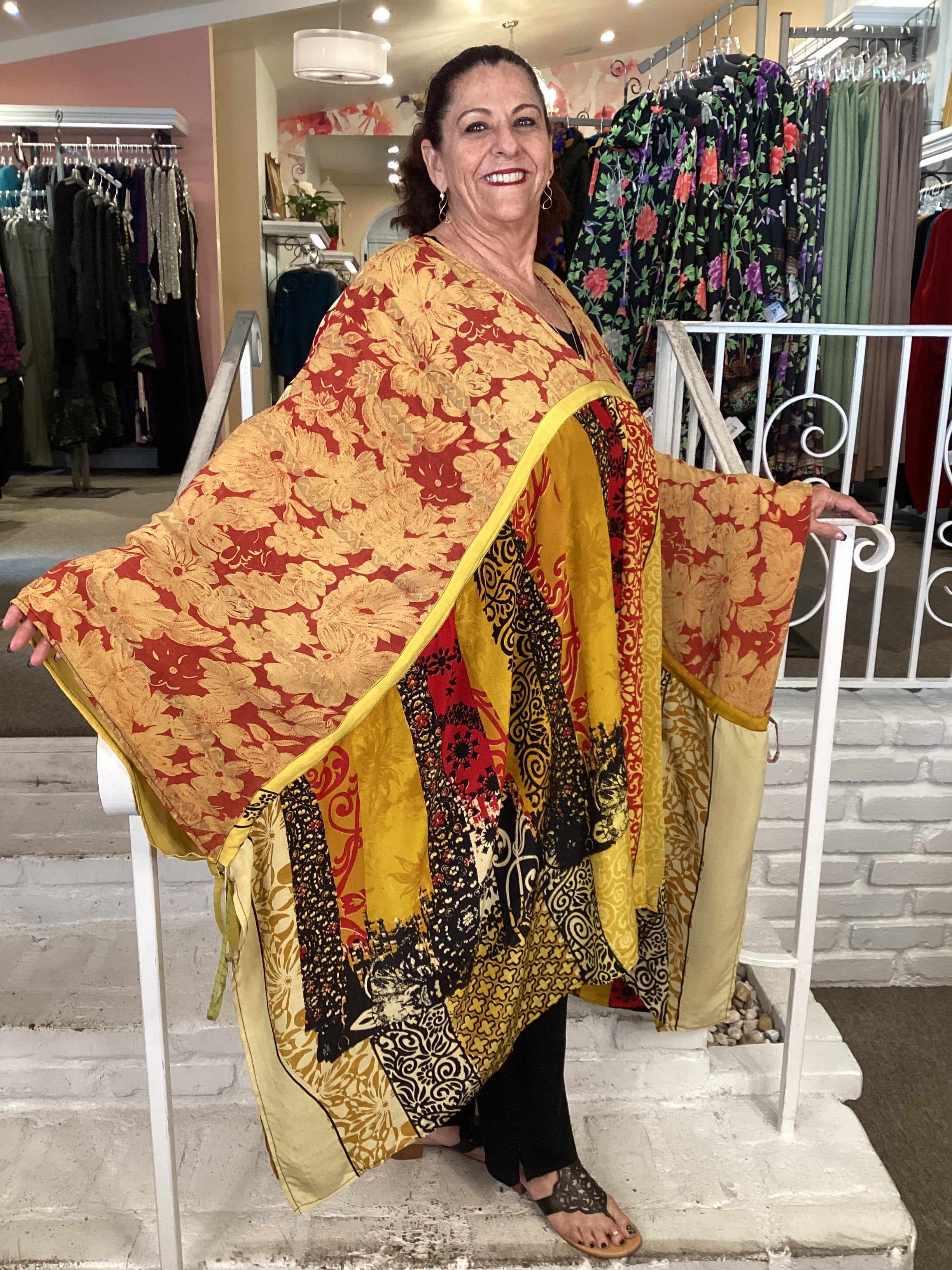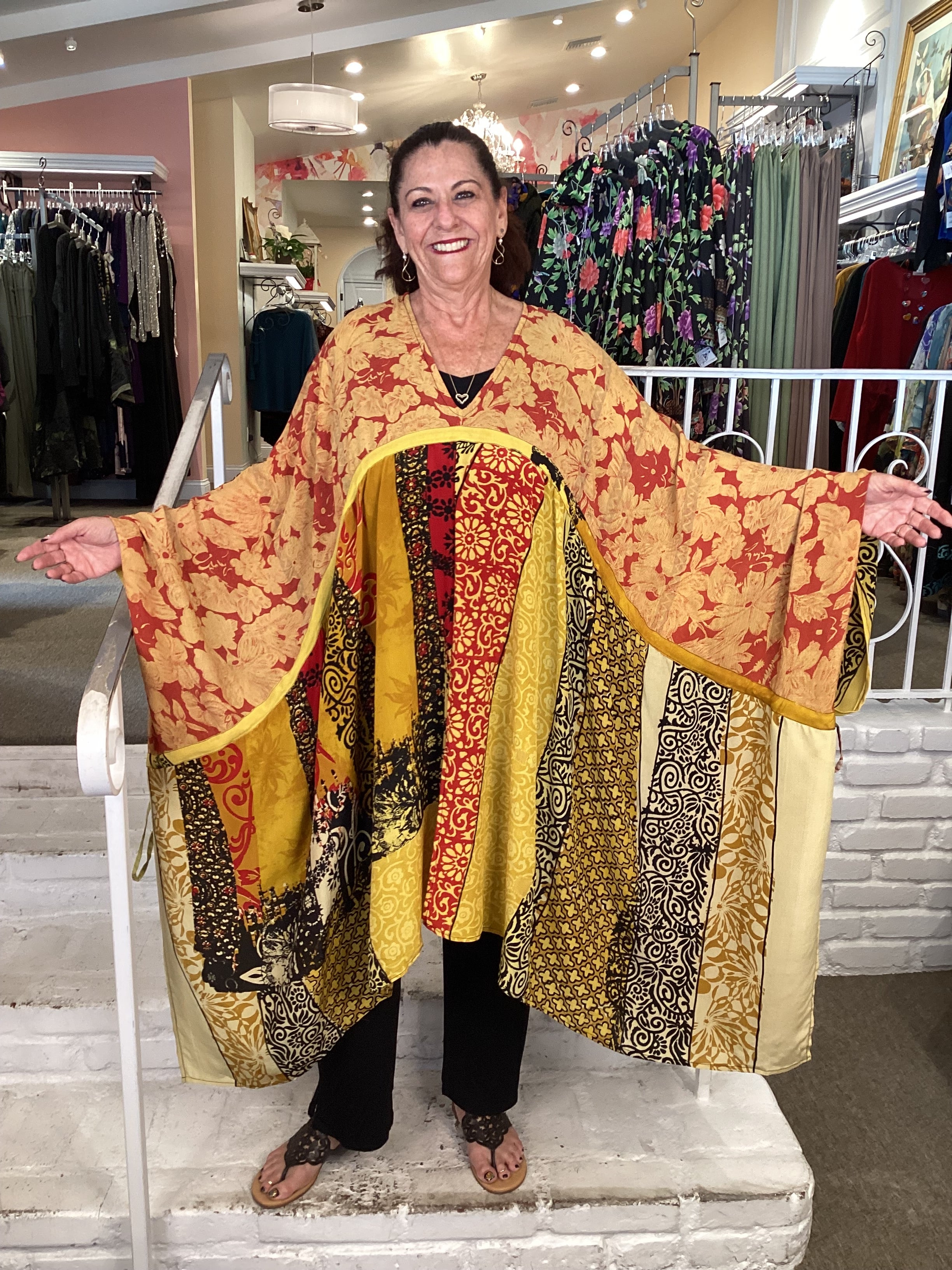 Crafted from ultra-lux vintage crepe silk, the Eclipse Dress 211 blends rich textures and eclectic prints, resulting in a truly artisanal piece. Its flowing silhouette features a deep V neckline and adjustable drawstrings along the sides that allow you to customize both the fit and length—from knee-length to full kaftan. Side vents enhance movement and versatility, while carefully designed gathers at the bust provide a flattering shape. This dress adapts effortlessly to various styles, offering both comfort and sophistication in one elegant garment.