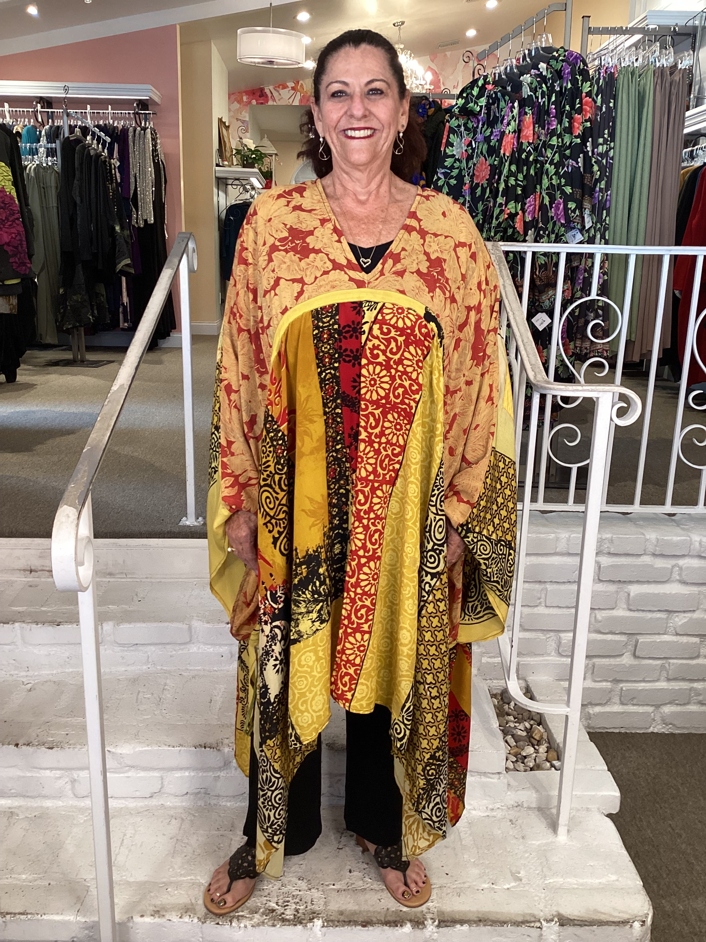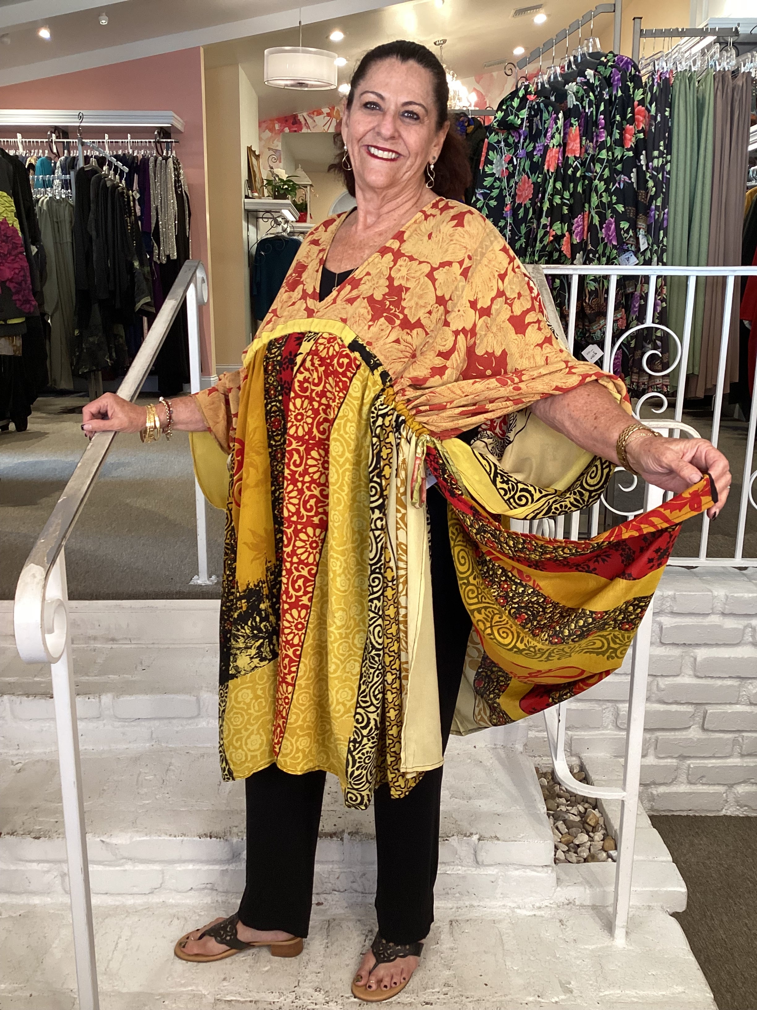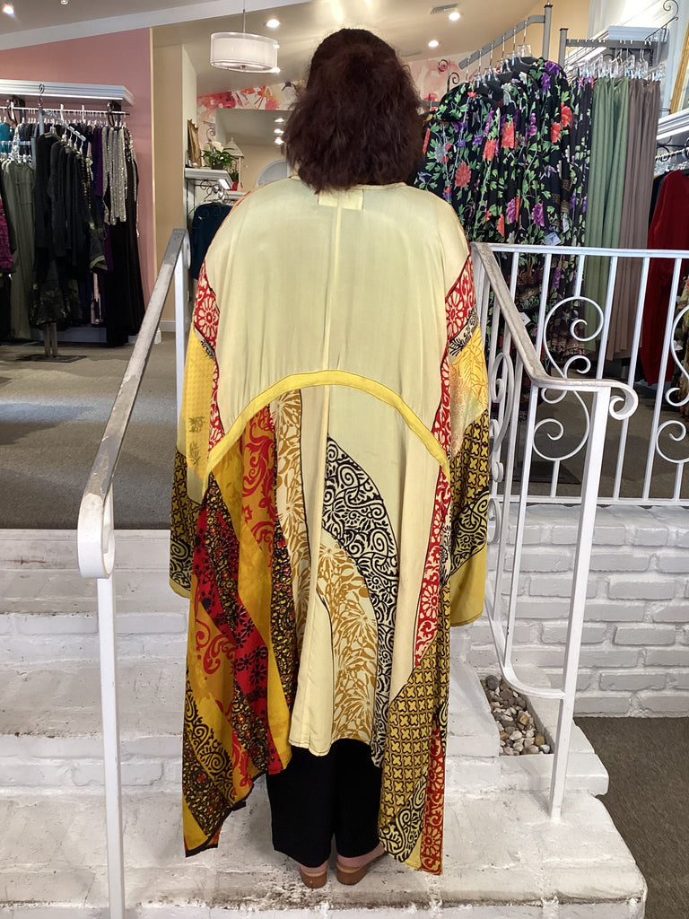 Crafted from ultra-lux vintage crepe silk, the Eclipse Dress 211 blends rich textures and eclectic prints, resulting in a truly artisanal piece. Its flowing silhouette features a deep V neckline and adjustable drawstrings along the sides that allow you to customize both the fit and length—from knee-length to full kaftan. Side vents enhance movement and versatility, while carefully designed gathers at the bust provide a flattering shape. This dress adapts effortlessly to various styles, offering both comfort and sophistication in one elegant garment.