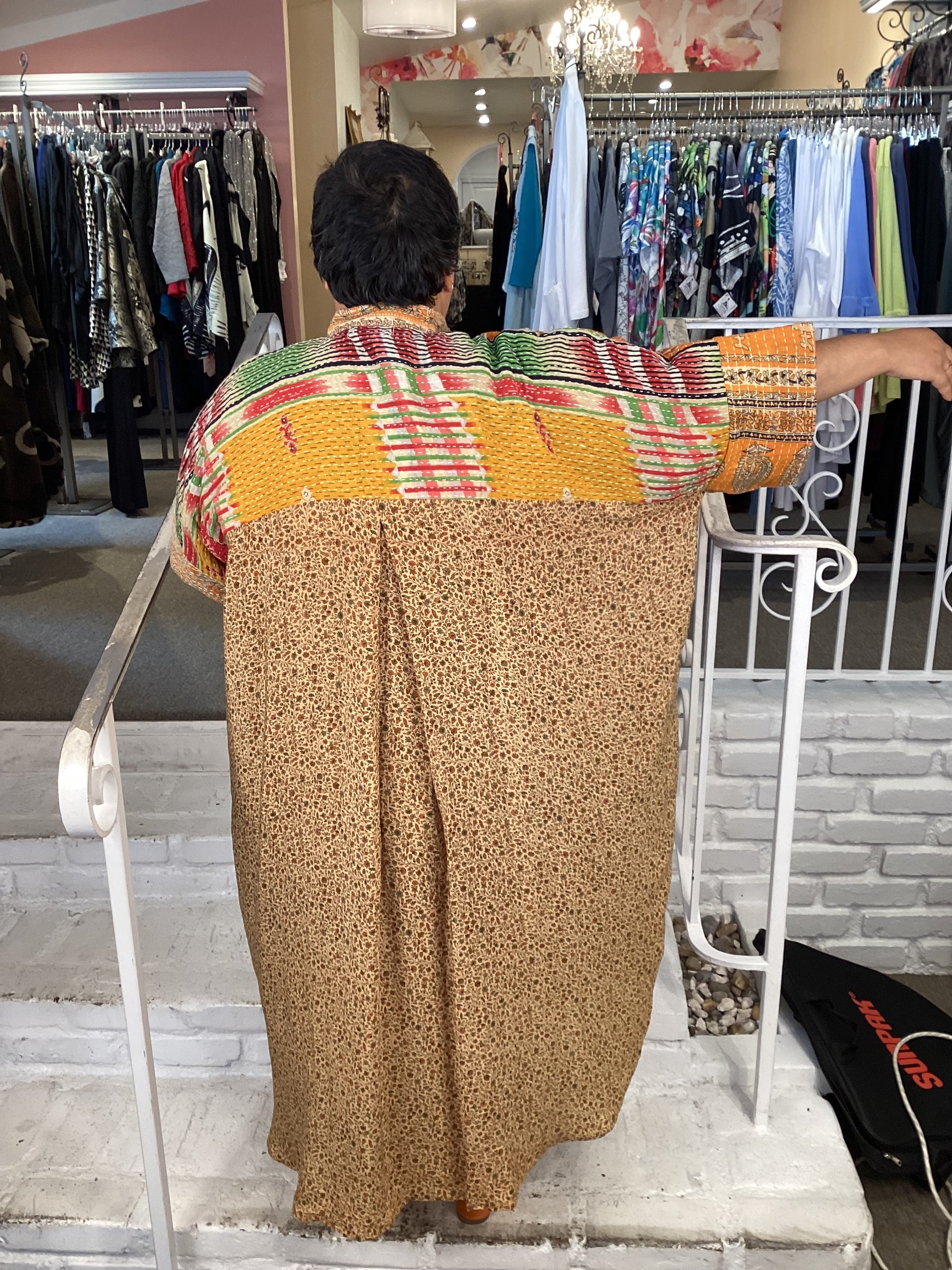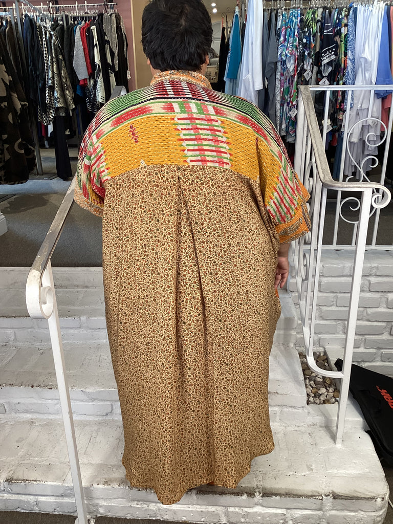 Made from the designer's vintage stitched cotton, this oversized kimono features button front, two deep pockets in the front, a curved shirt style hem and Mandarin collar. Generous sleeve opens the fold back button cuff 20". The back is comprised of stitch cotton yoke with a lower pleated panel of printed poly.