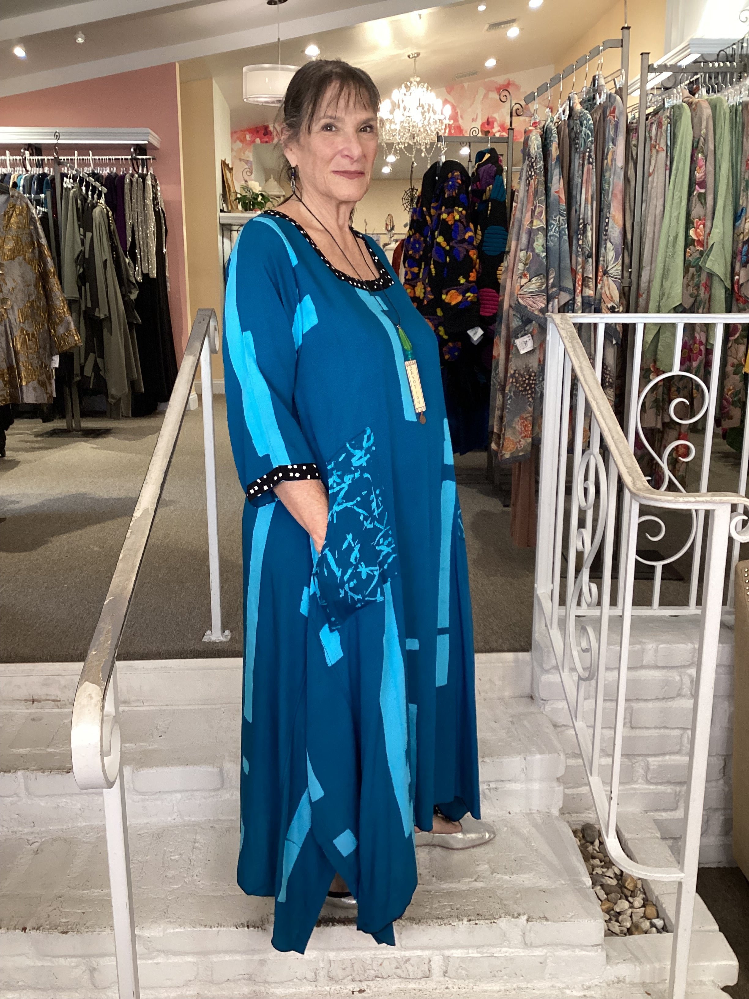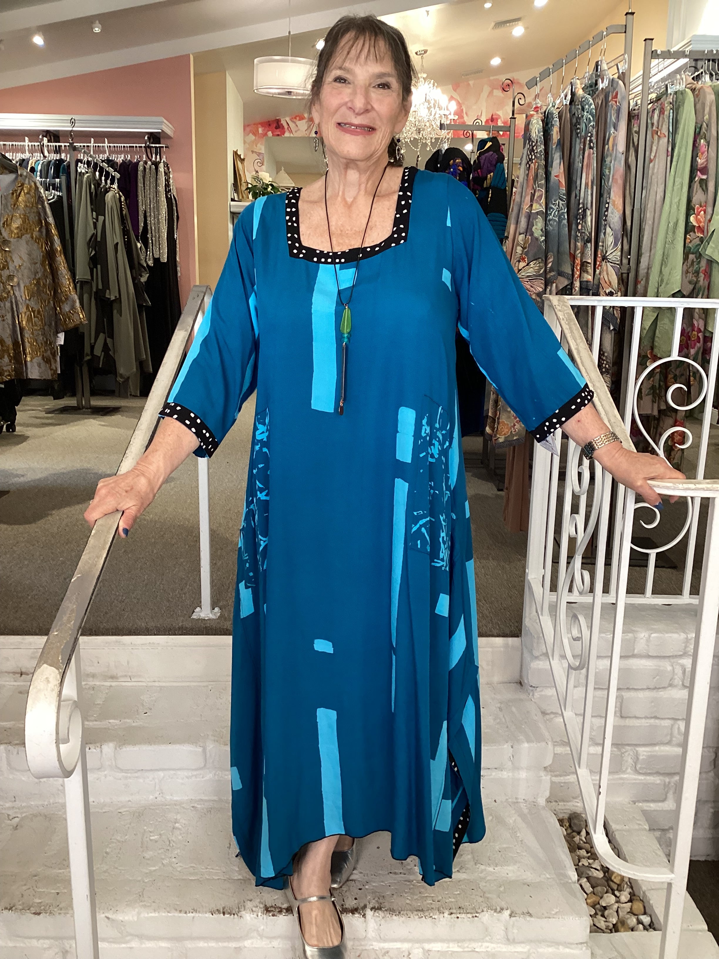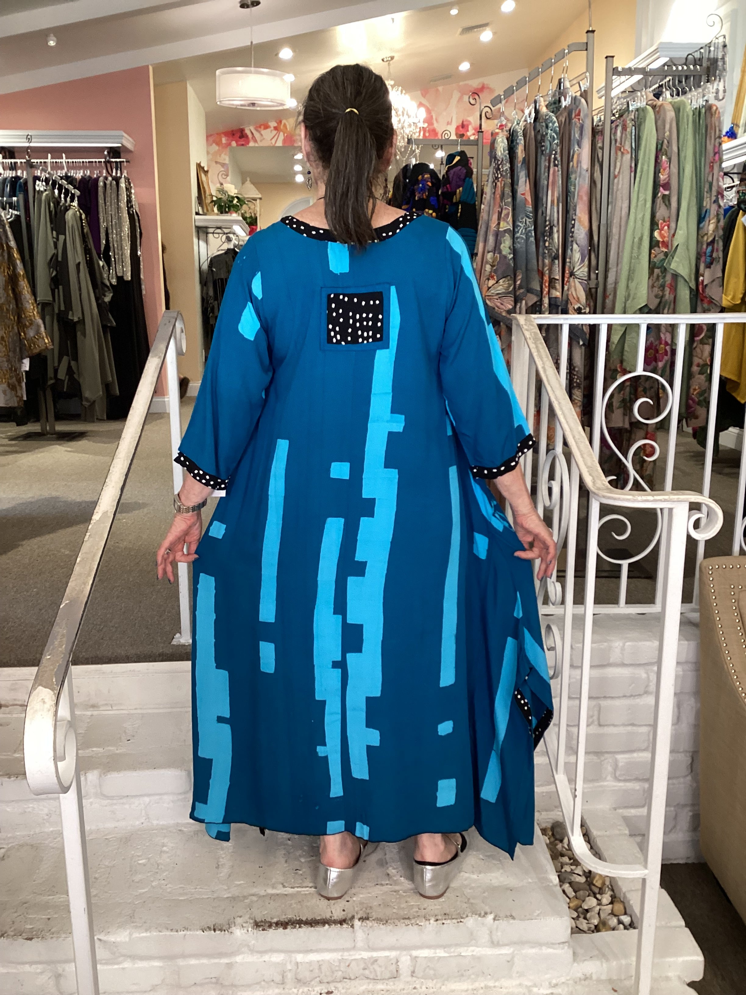 The "Maria dress is an A-line flowy rayon Batik printed dress in turquoise and aqua with black and white black and white dot neckline
