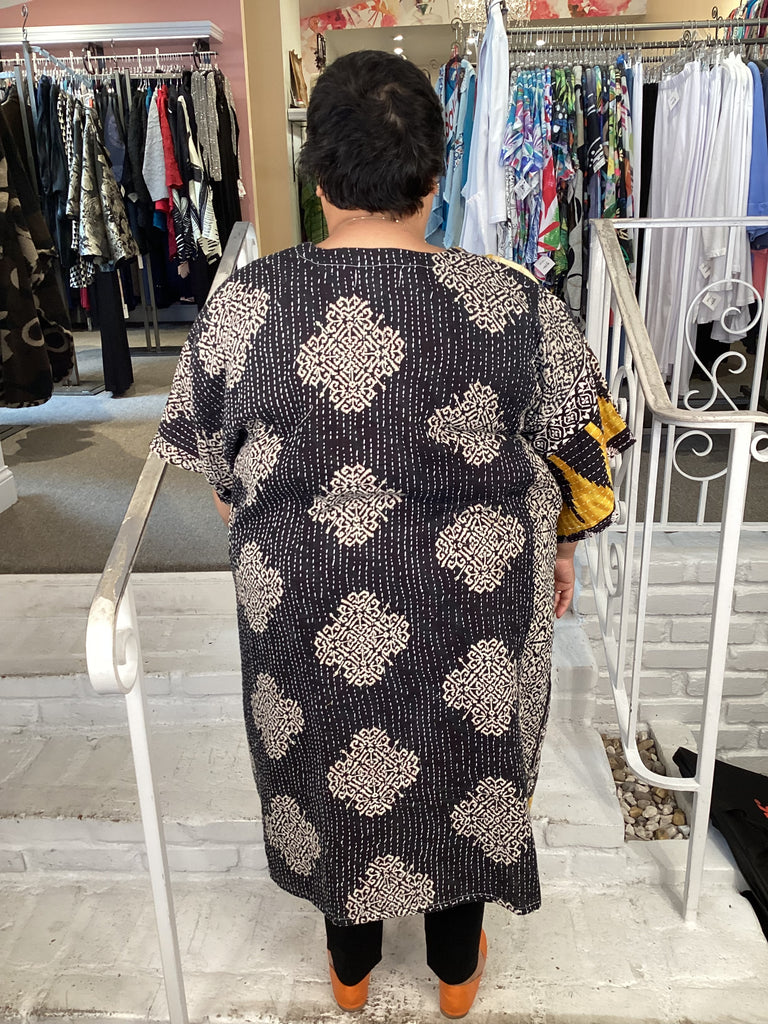 Made from the designer's vintage stitched cotton, this oversized caftan features button front placket, two deep pockets in the front and v-neck. Generous sleeve opening.