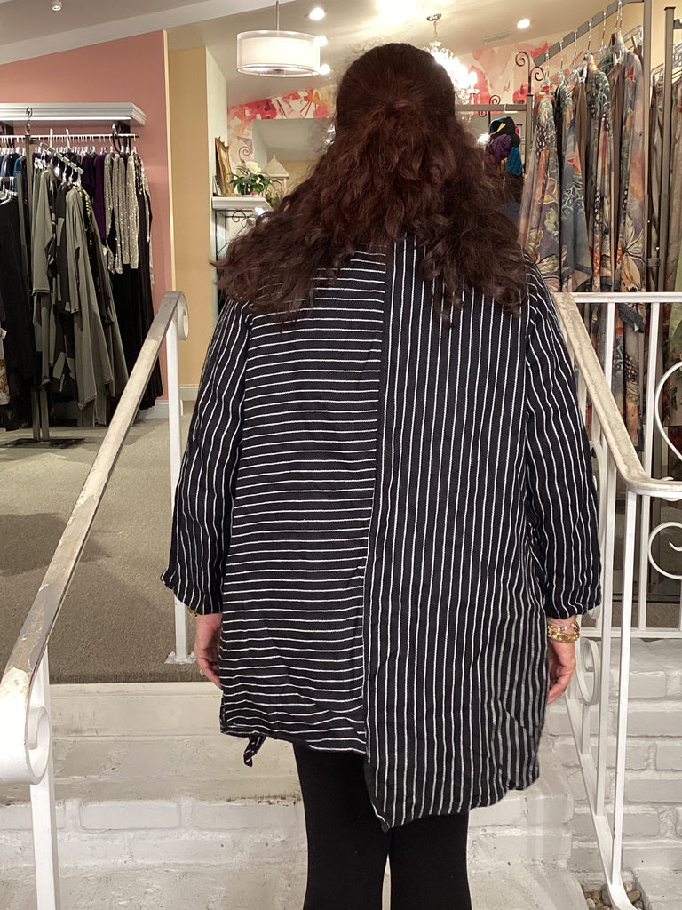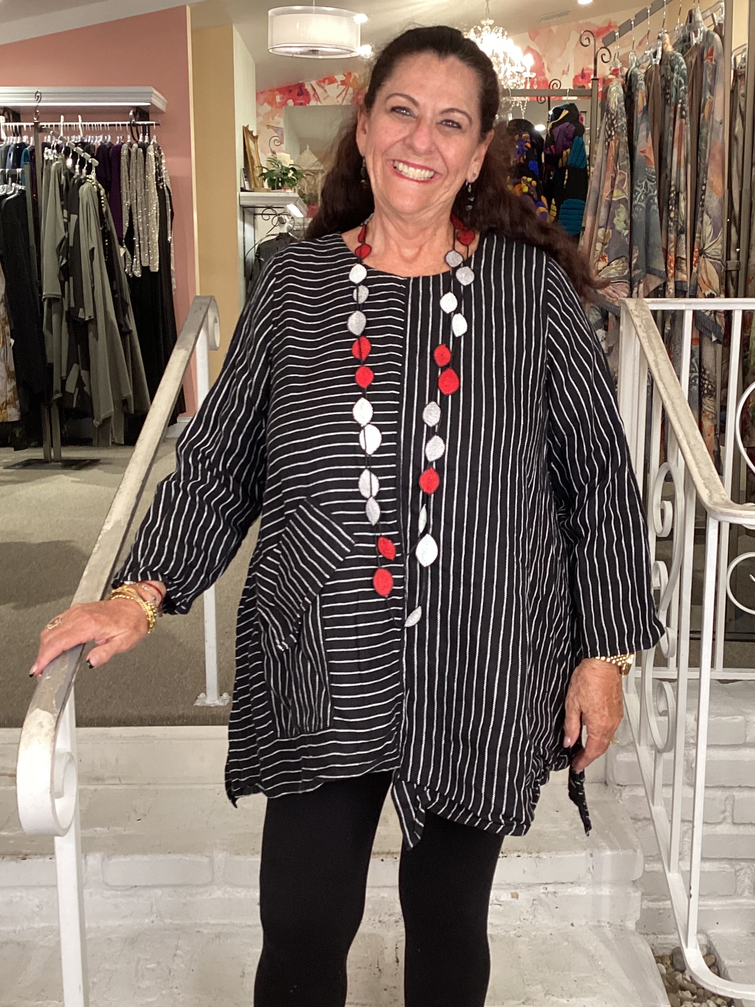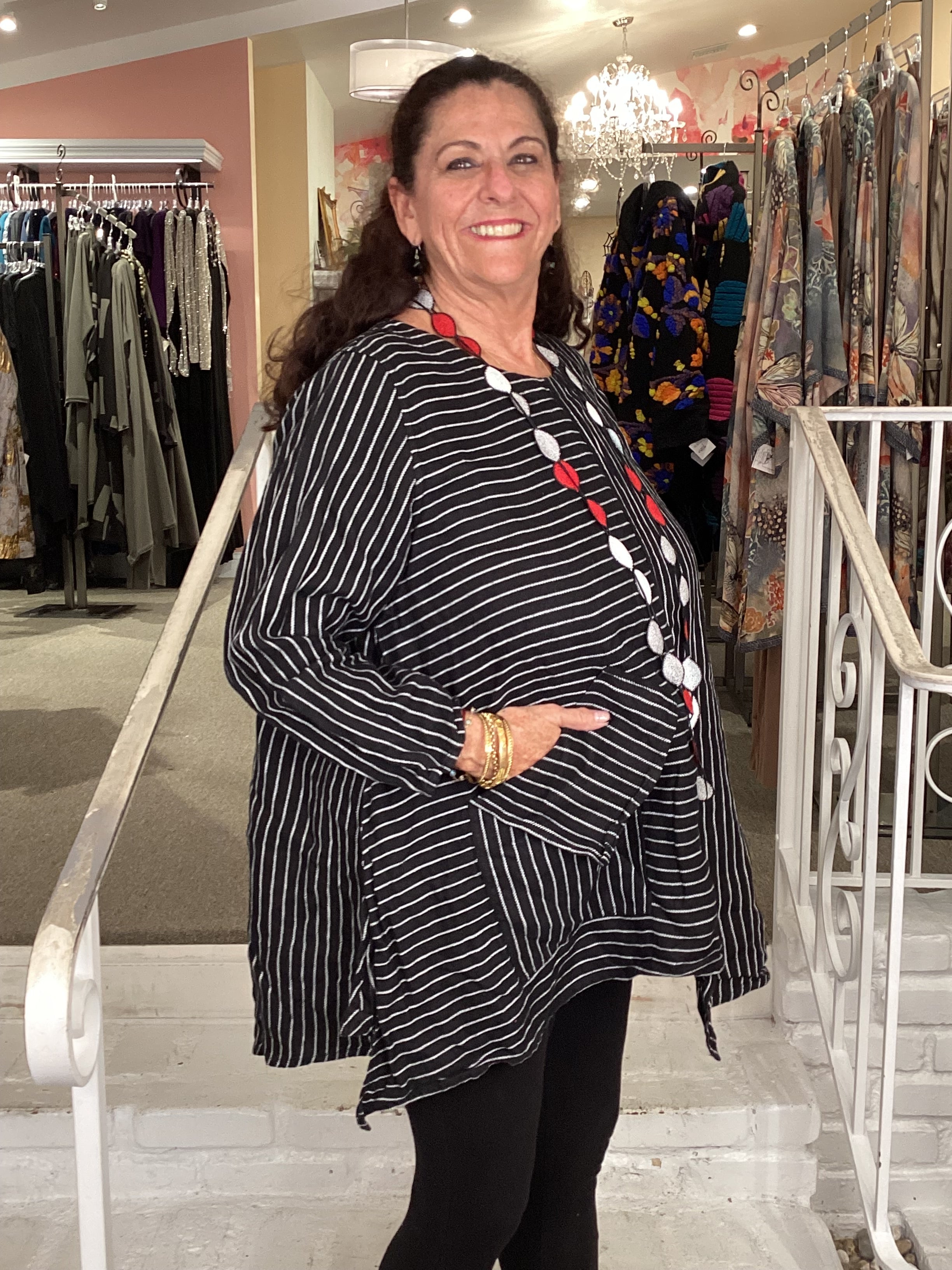 Discover the ultimate blend of comfort and style with our 1 flap pocket Tunic - Black. Made of 100%, linen fabric and featuring 3/4 length sleeves. This top provides a breezy, relaxed fit. The contrast stitching and uneven hem add a touch of unique flair to this versatile piece. Elevate any outfit with this must-have addition to your wardrobe.