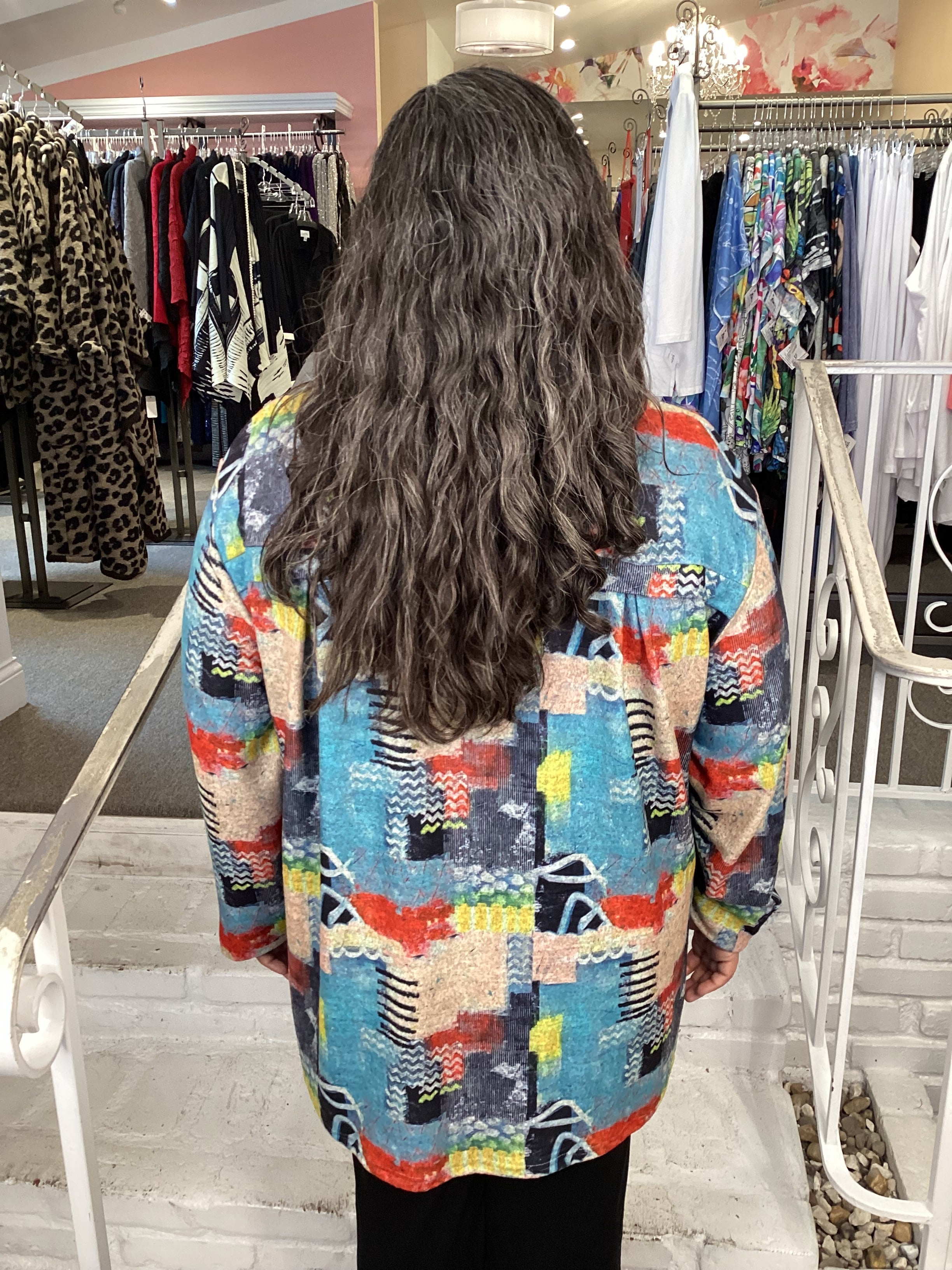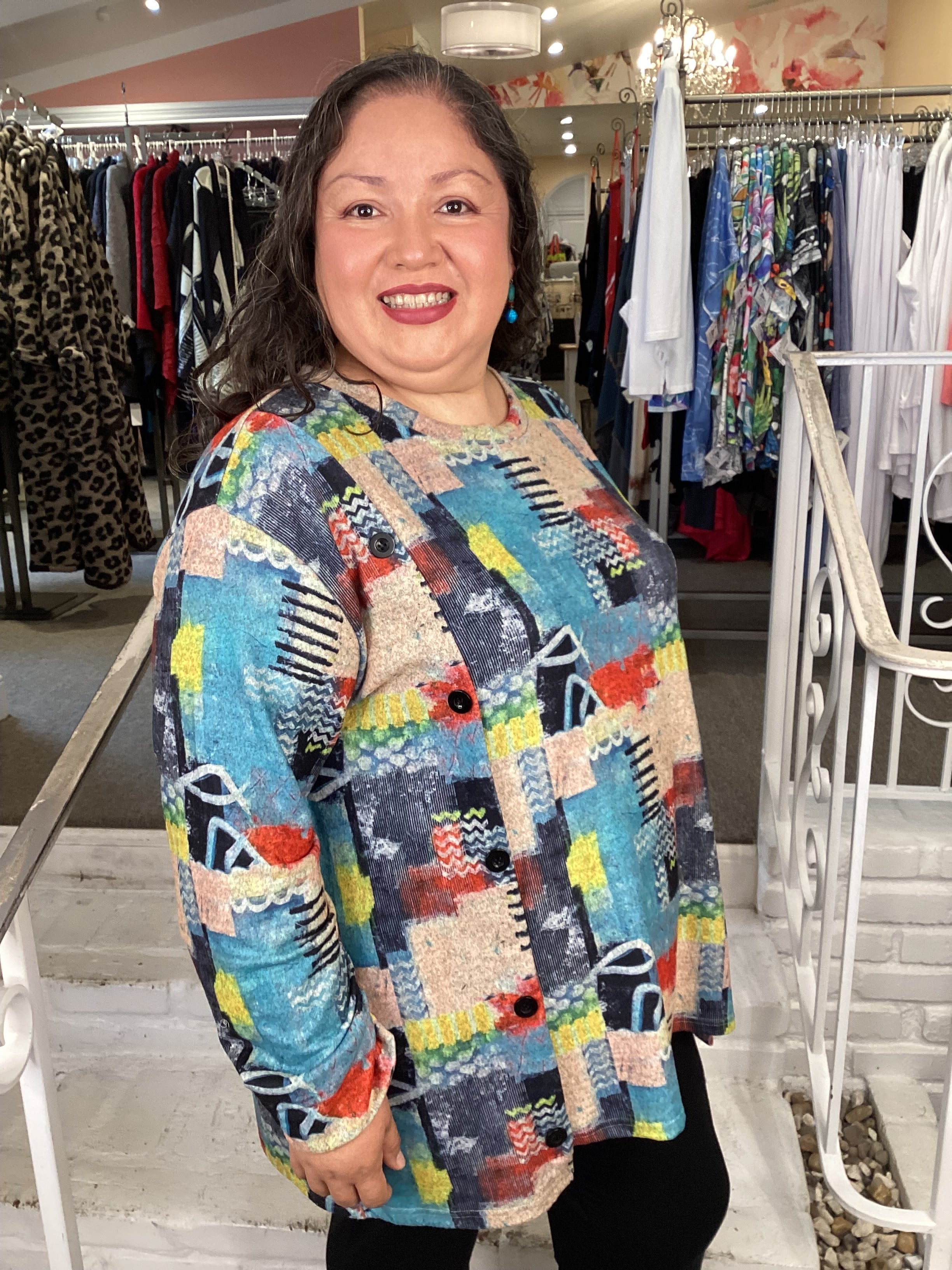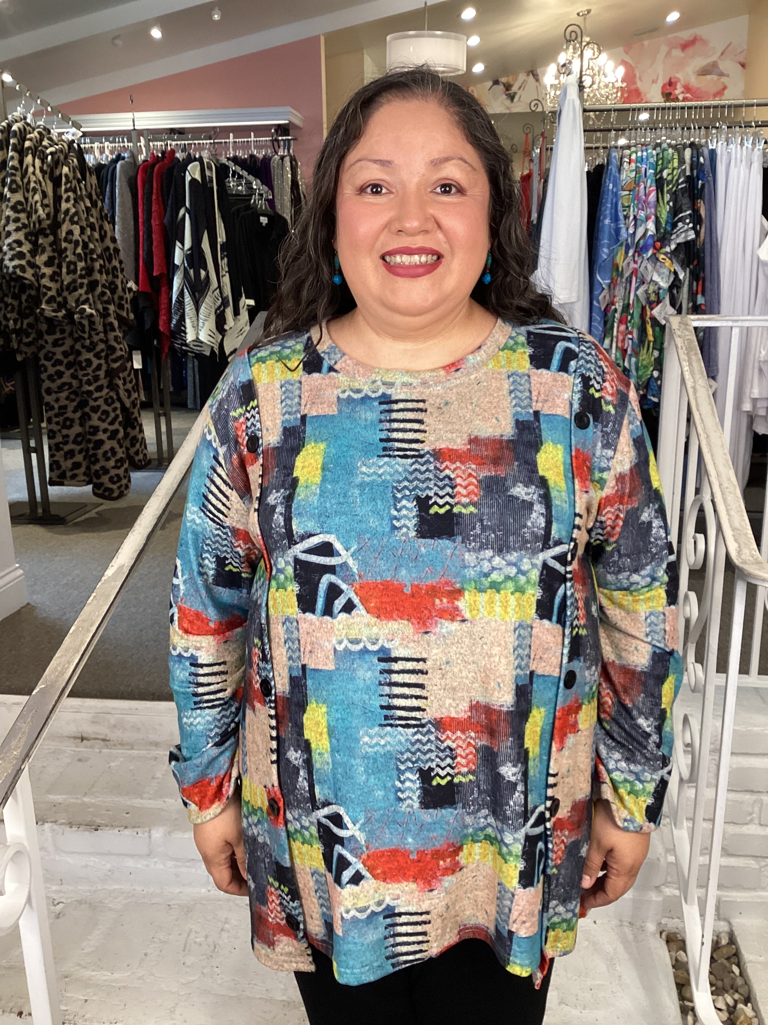 Experience the elegance of this unique tunic. It's colorful abstract print and soft brushed knit fabric are complemented by long sleeves and a button detail for a touch of sophistication. Enjoy exquisite style this fall with cozy comfort. Model is wearing 2X.