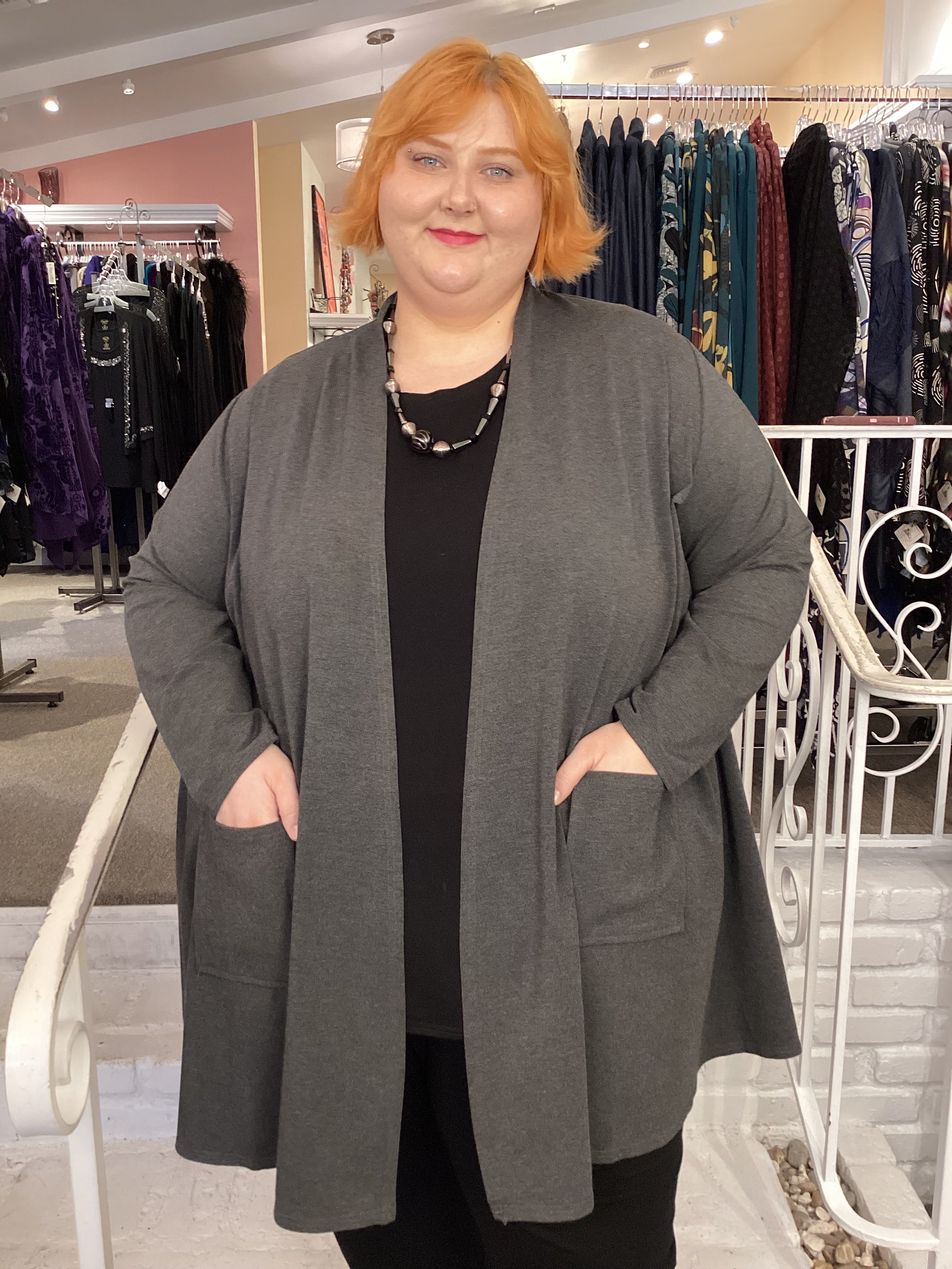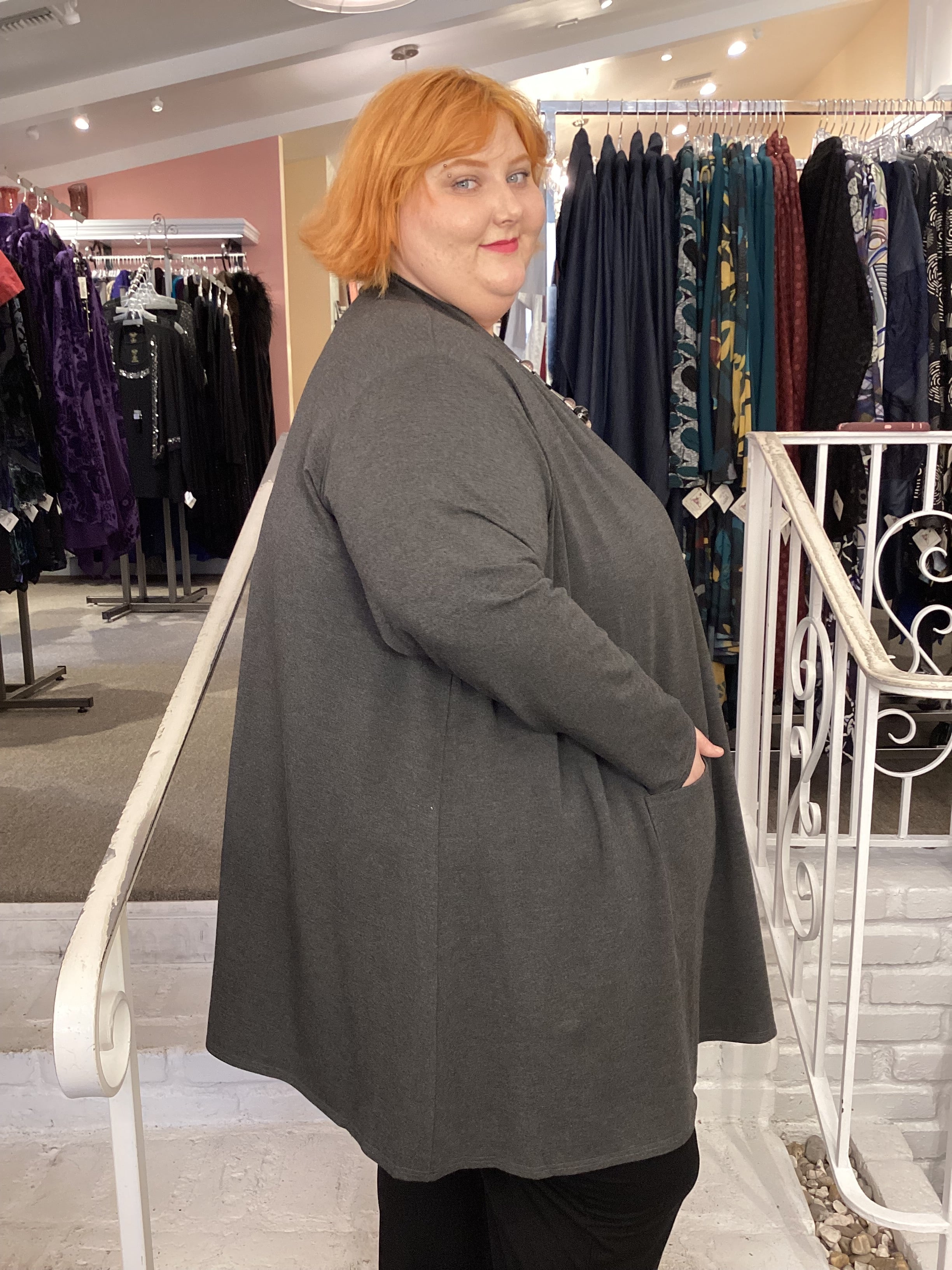 Enjoy casual to dressy with this versatile. Soft bamboo knit, a-line silhouette, and front panel pockets on this jacket that hits just below the hips. Our model is wearing the 4X. As always, this blue