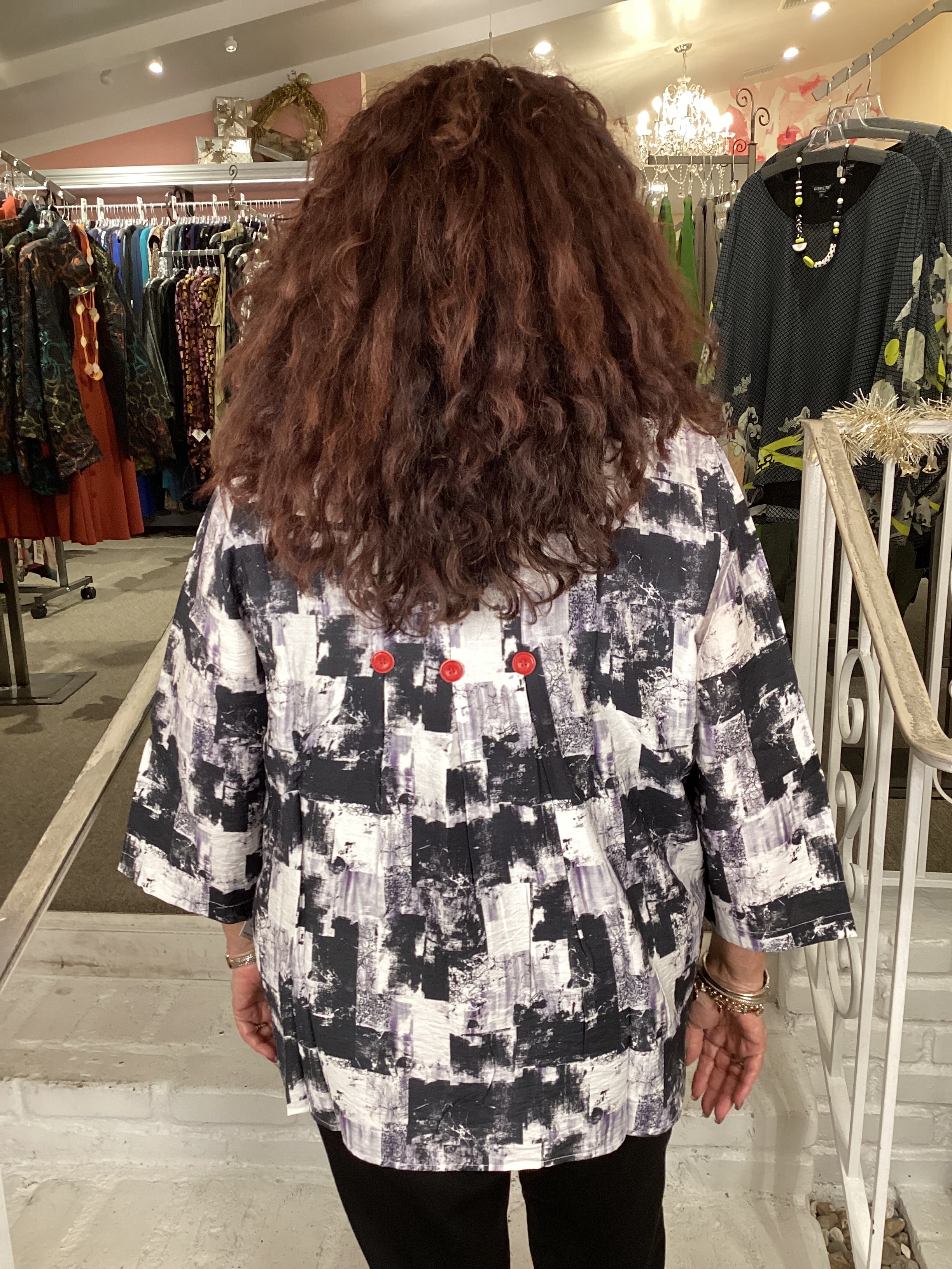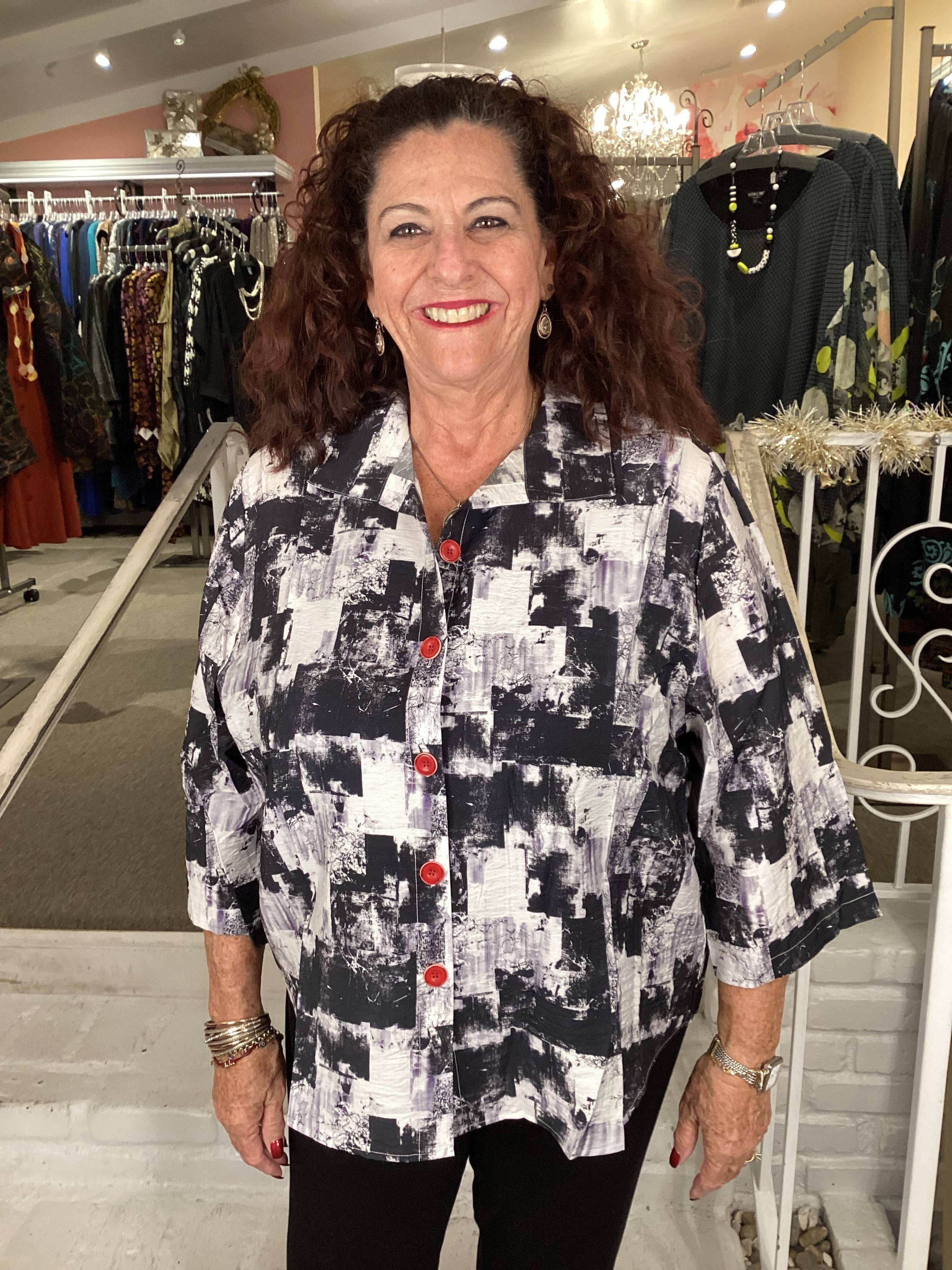 This striking collar shirt makes an impact with its bold black and white print and vibrant red button closures. Elegant back pleats add dimension and movement, creating a refined silhouette with contemporary flair. A versatile statement piece that brings personality and polish to any occasion.