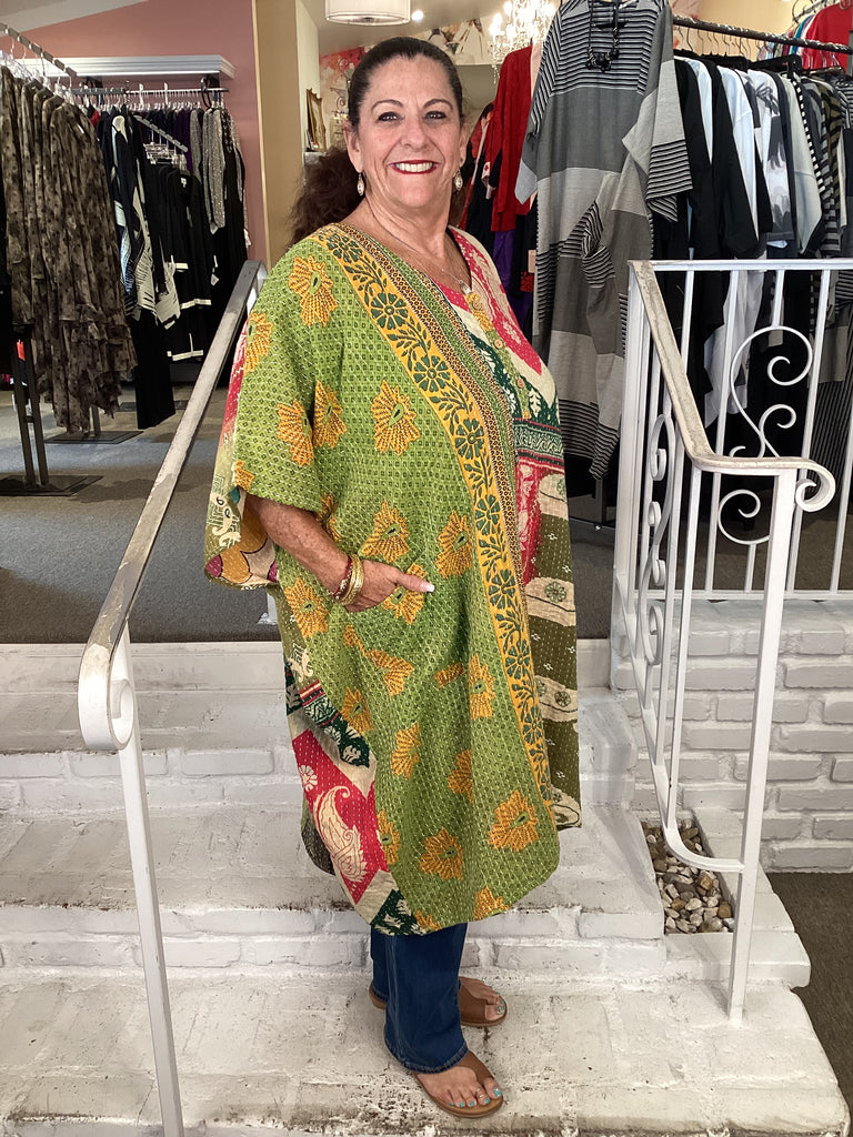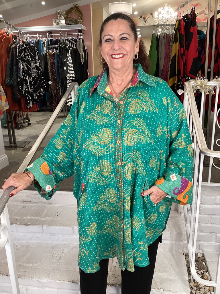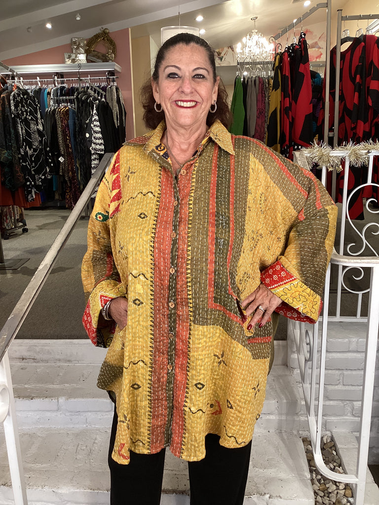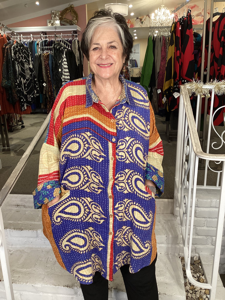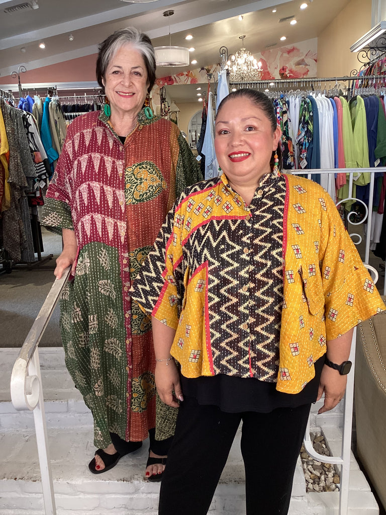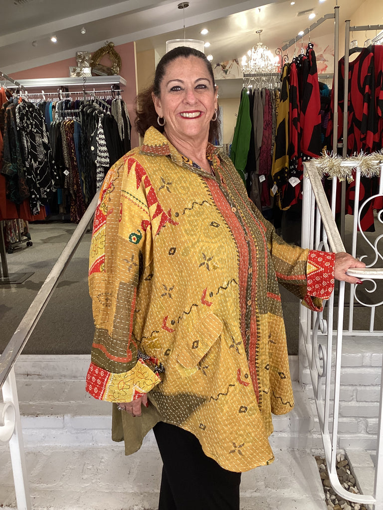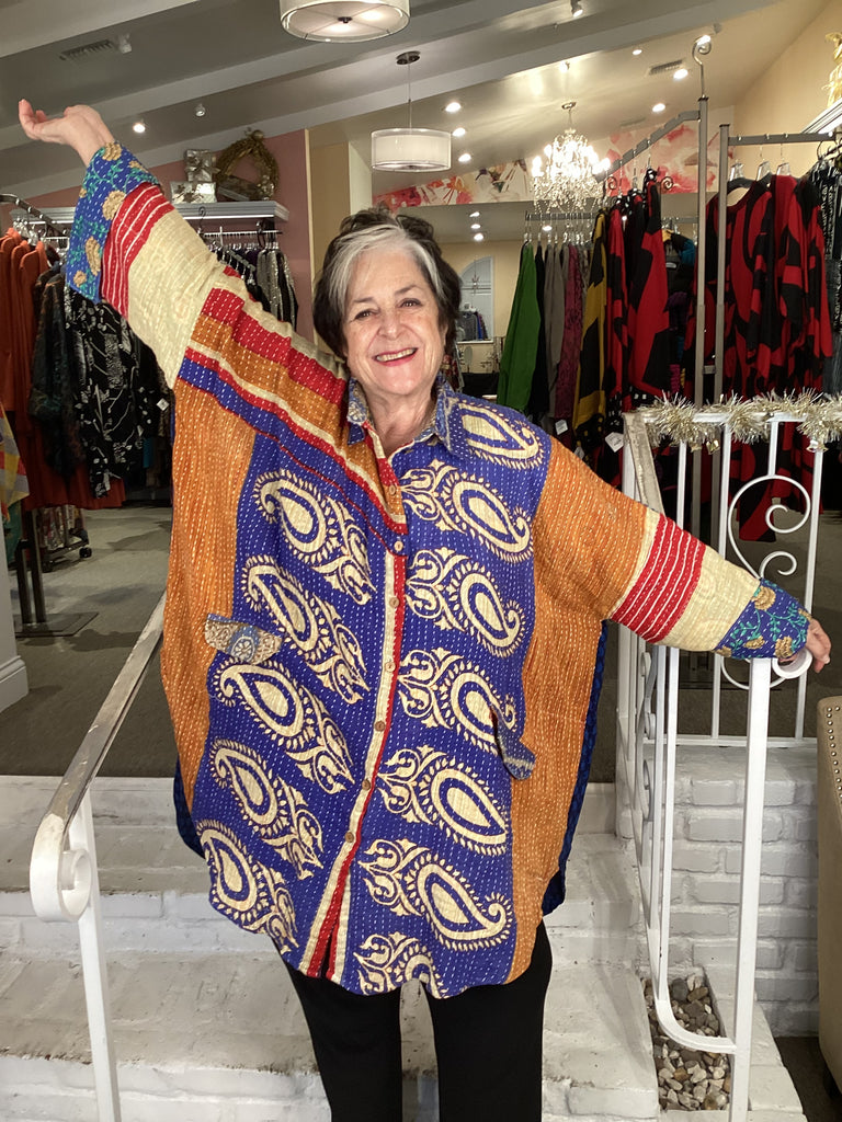 Vintage fabrics from India, truly unique and authentic combined to create these amazing art-to-wear pieces. Lightweight cotton and silk are used for these tunics, kimonos, jackets and shirts, often with KANTHA artisan hand stitching. Designers such as Kantha makes loose generous silhouettes for the Abundance woman!!