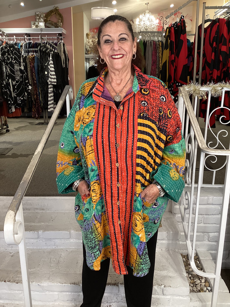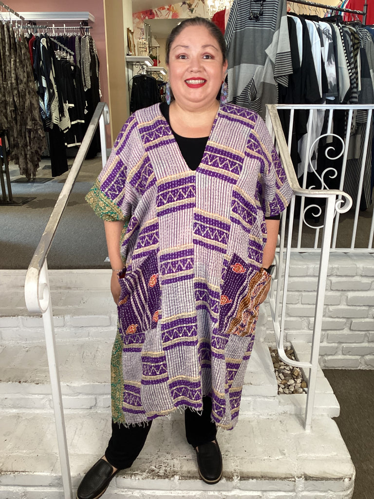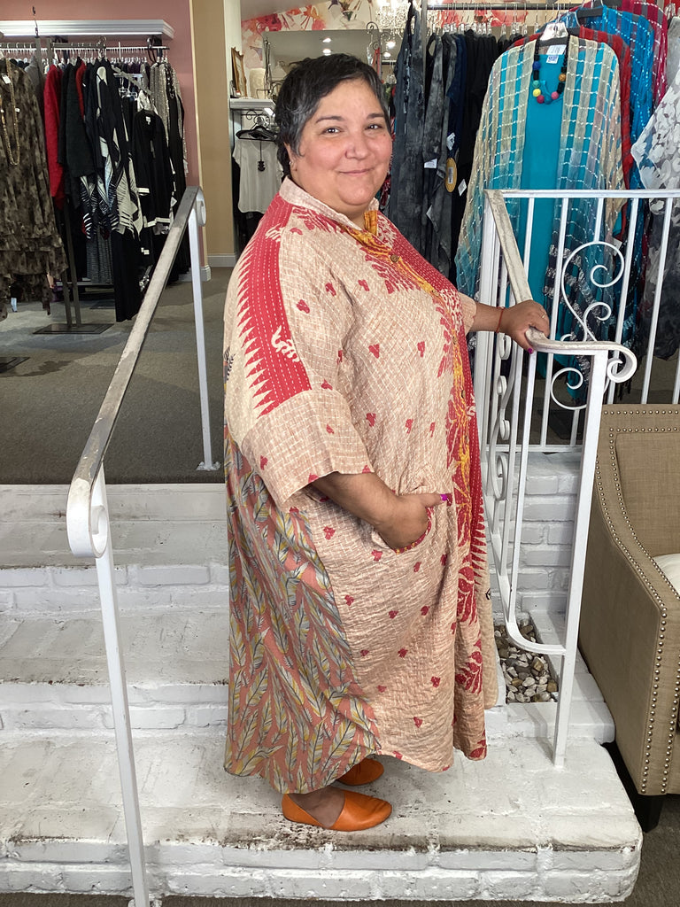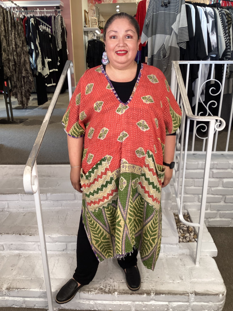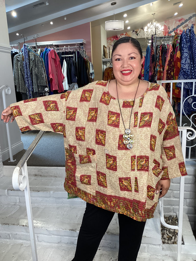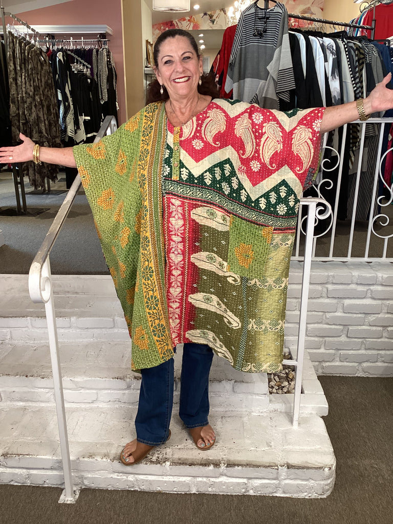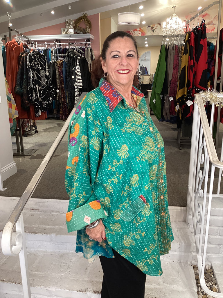 Vintage fabrics from India, truly unique and authentic combined to create these amazing art-to-wear pieces. Lightweight cotton and silk are used for these tunics, kimonos, jackets and shirts, often with KANTHA artisan hand stitching. Designers such as Kantha makes loose generous silhouettes for the Abundance woman!!