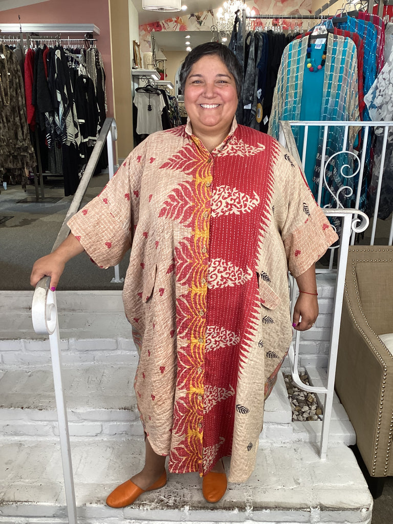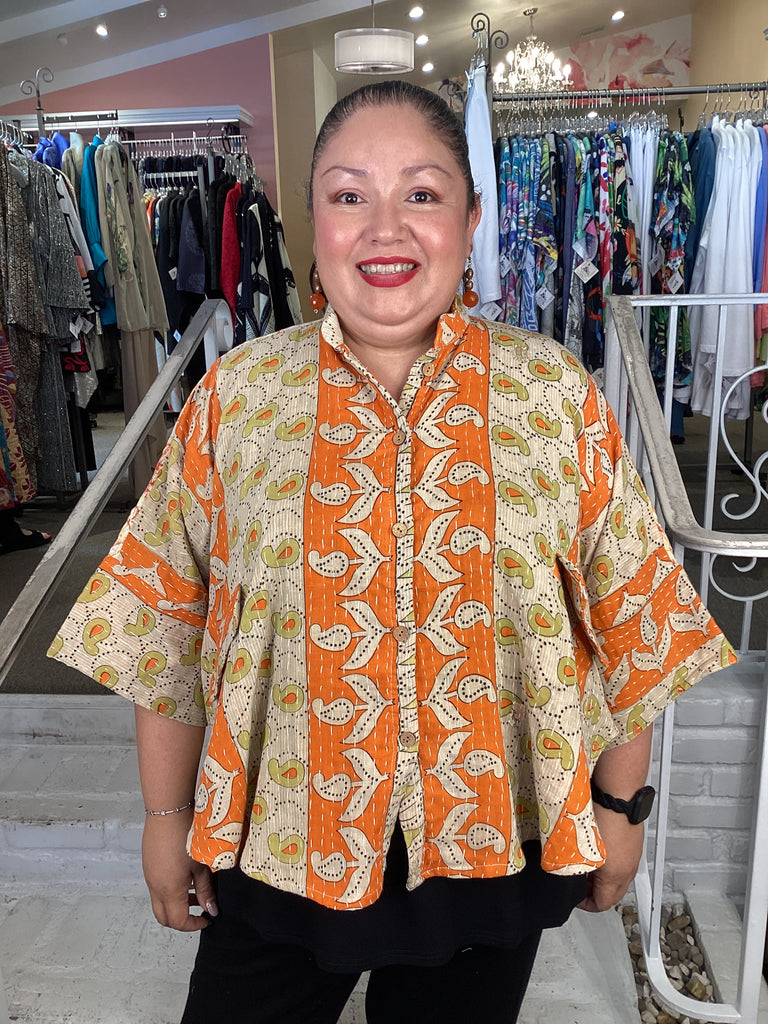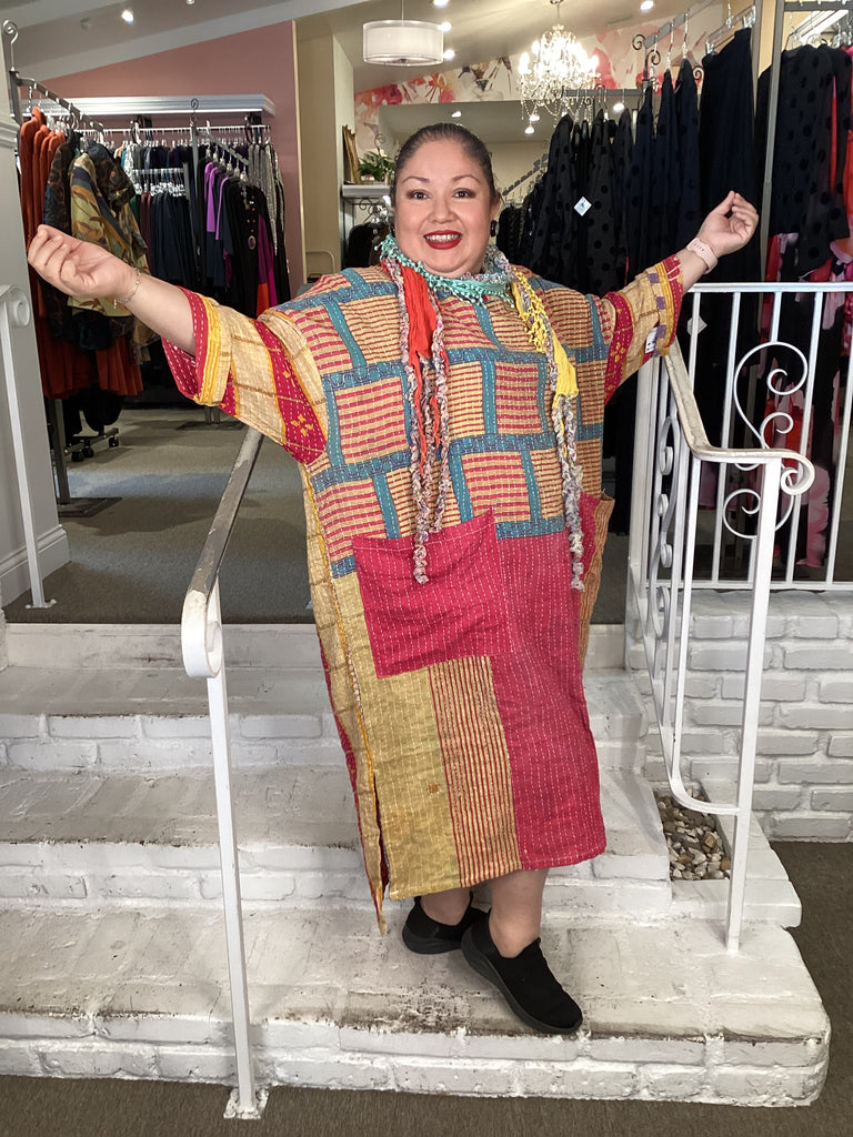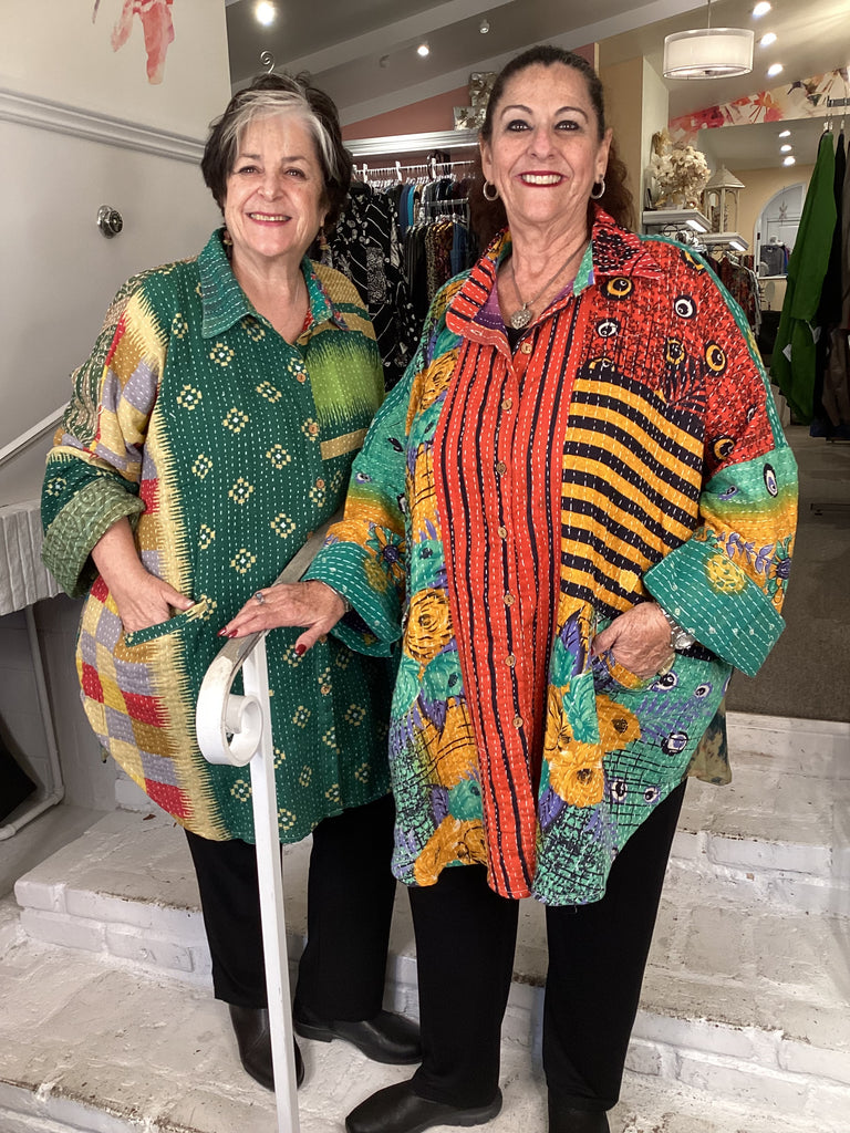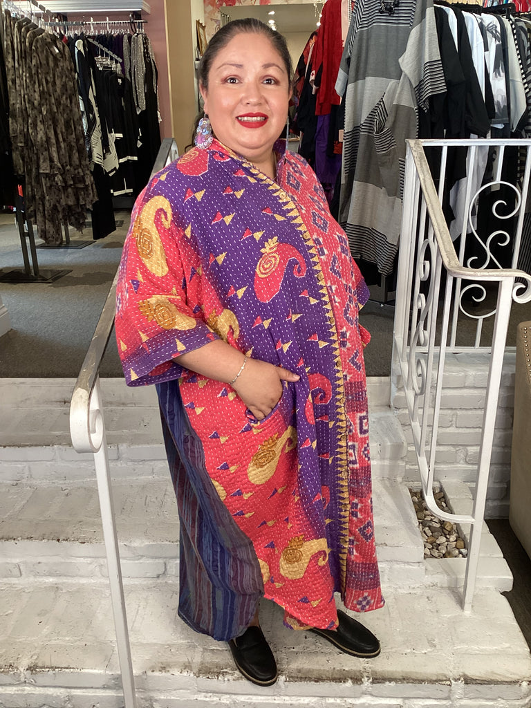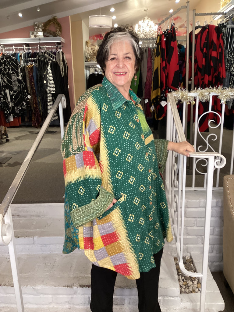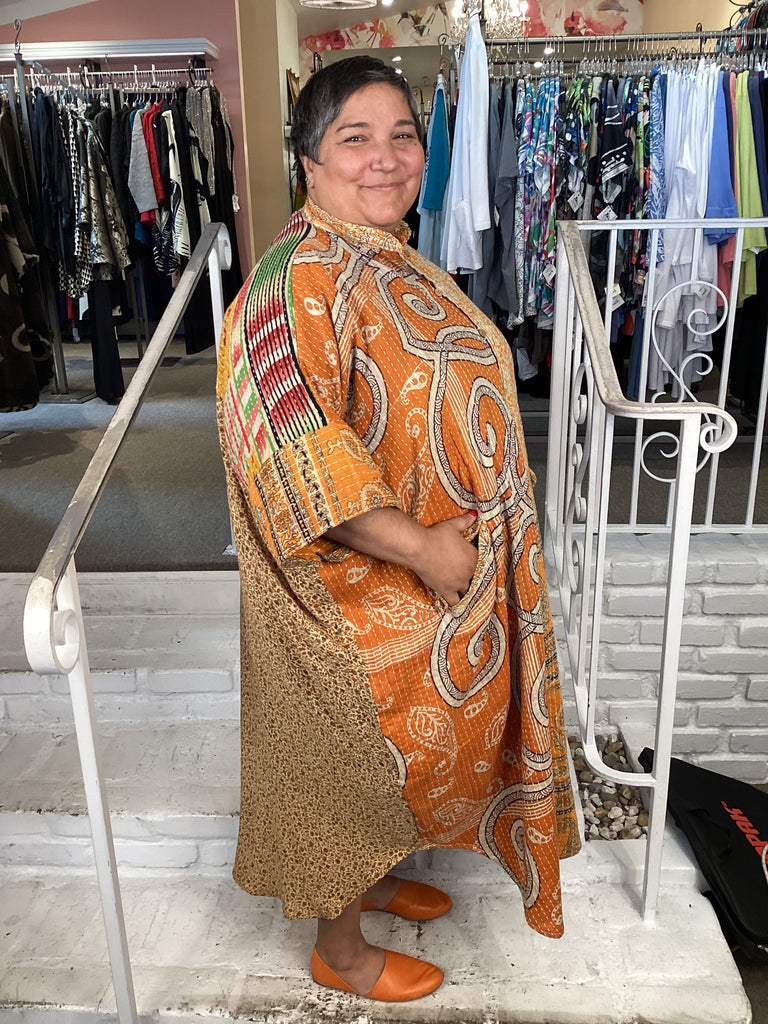 Vintage fabrics from India, truly unique and authentic combined to create these amazing art-to-wear pieces. Lightweight cotton and silk are used for these tunics, kimonos, jackets and shirts, often with KANTHA artisan hand stitching. Designers such as Kantha makes loose generous silhouettes for the Abundance woman!!