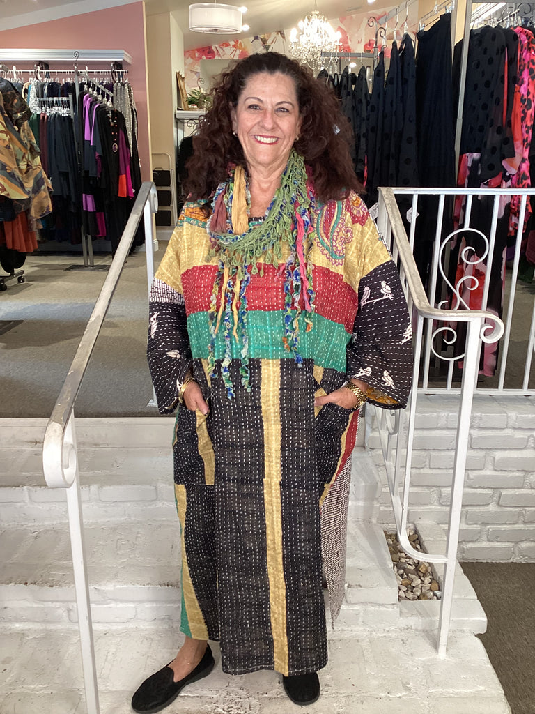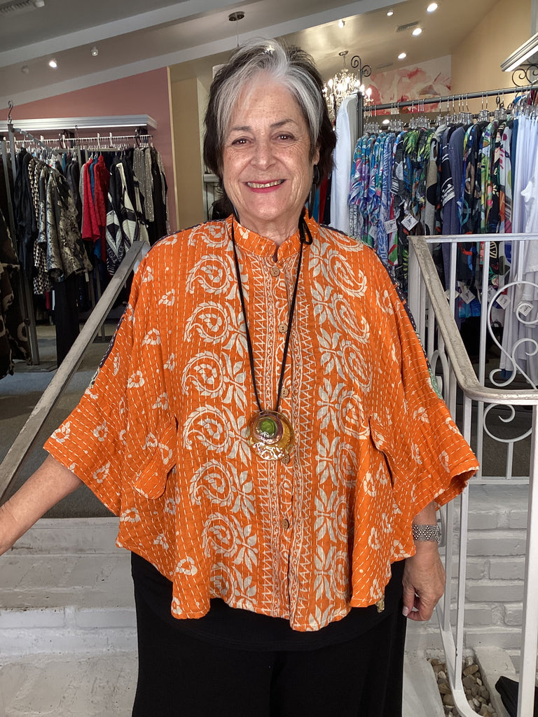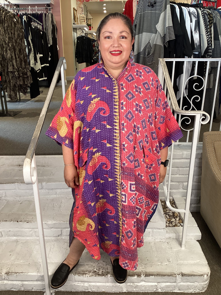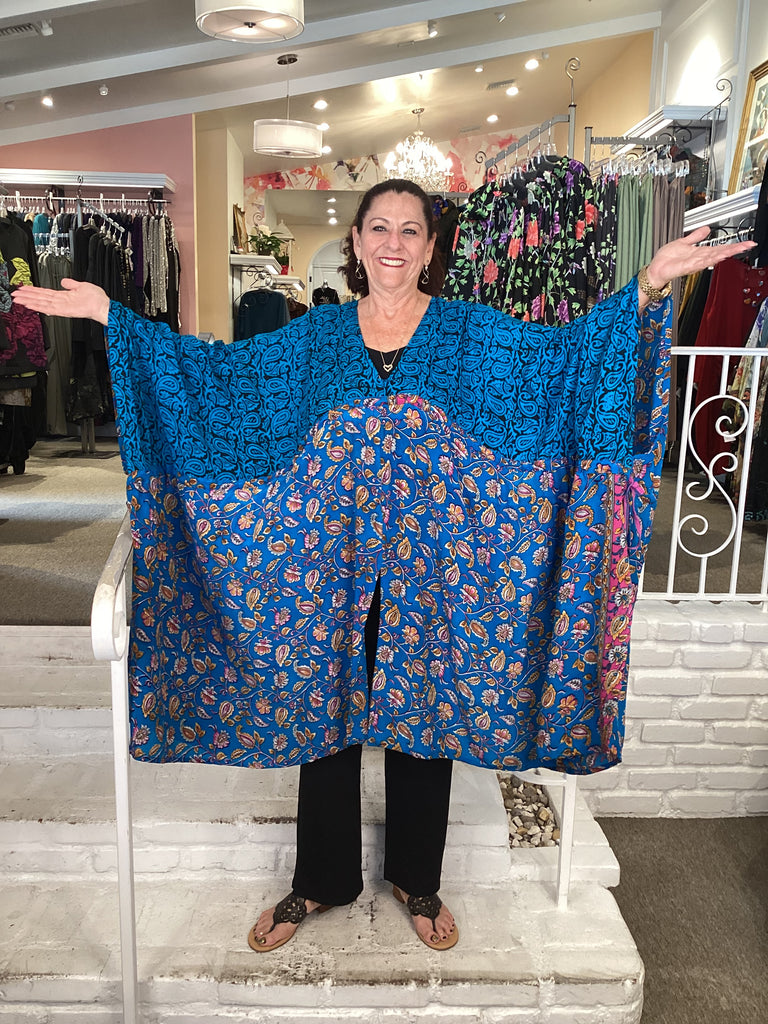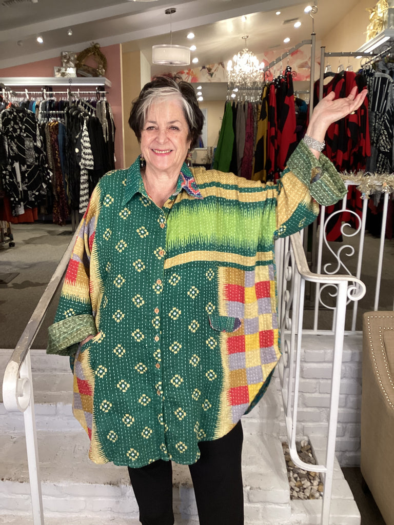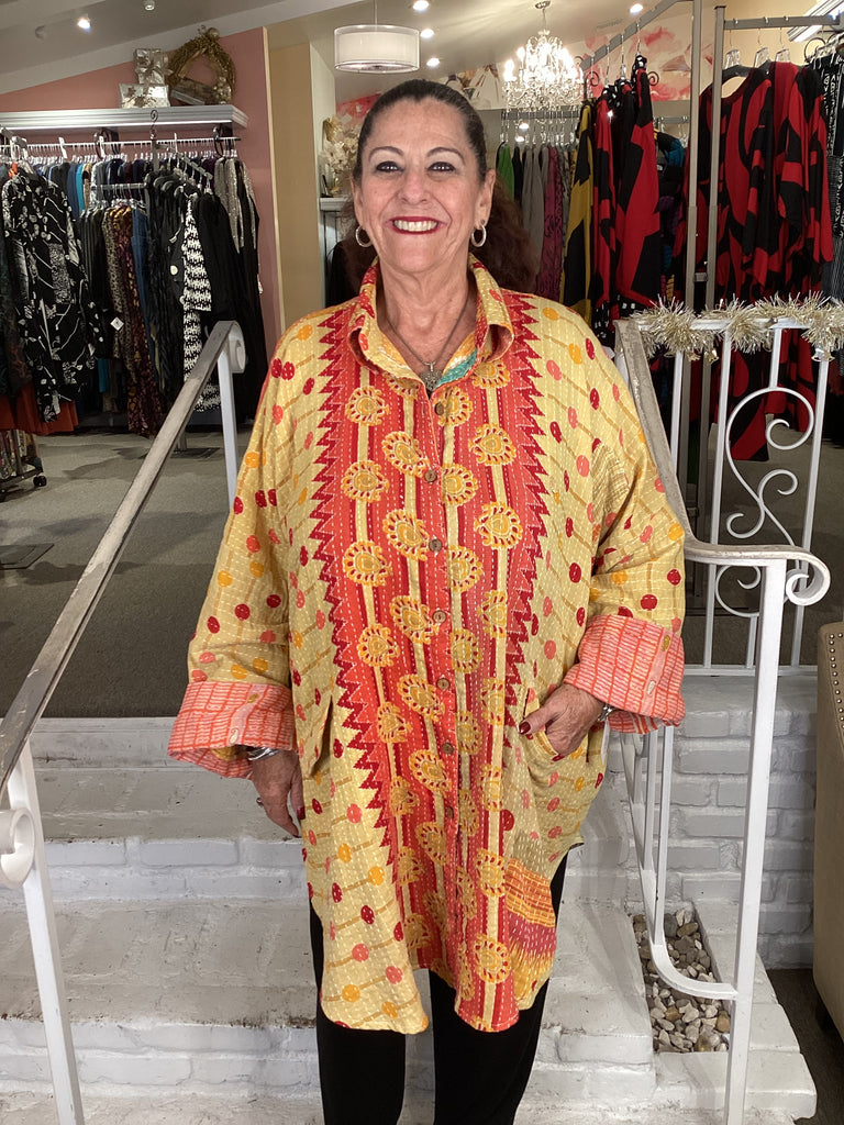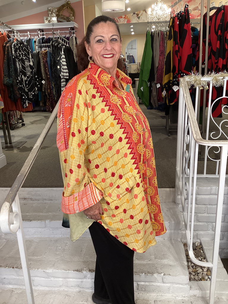 Vintage fabrics from India, truly unique and authentic combined to create these amazing art-to-wear pieces. Lightweight cotton and silk are used for these tunics, kimonos, jackets and shirts, often with KANTHA artisan hand stitching. Designers such as Kantha makes loose generous silhouettes for the Abundance woman!!