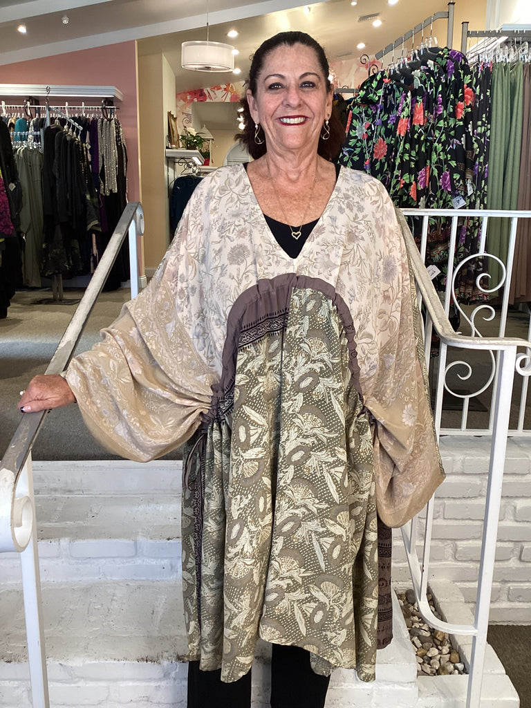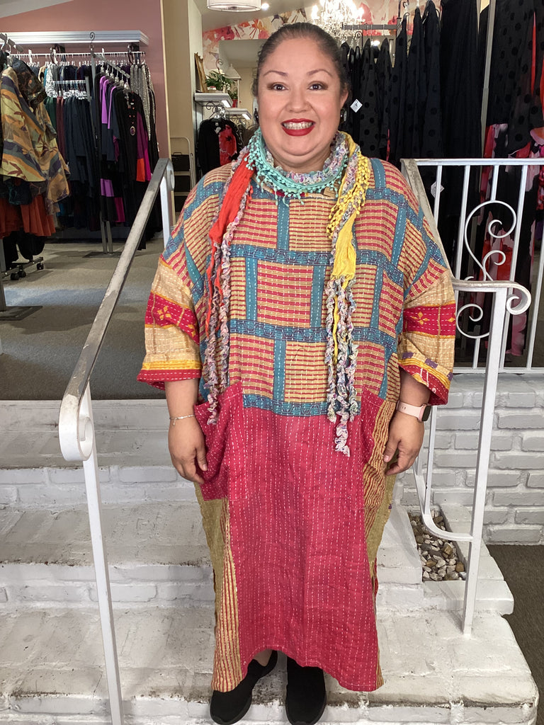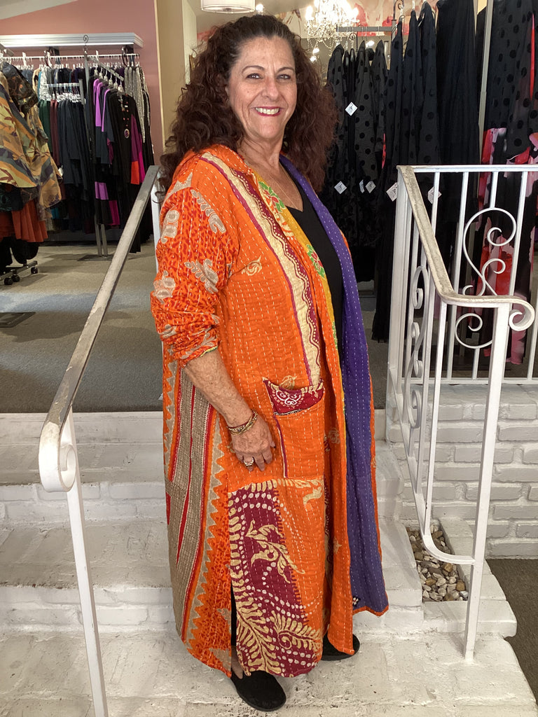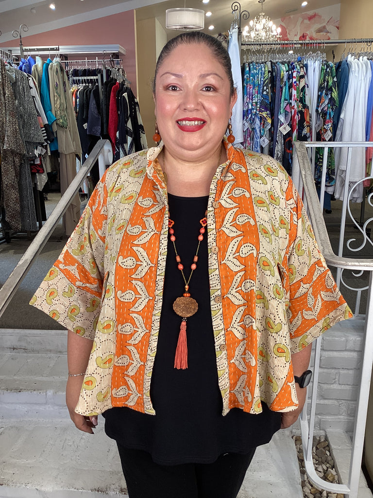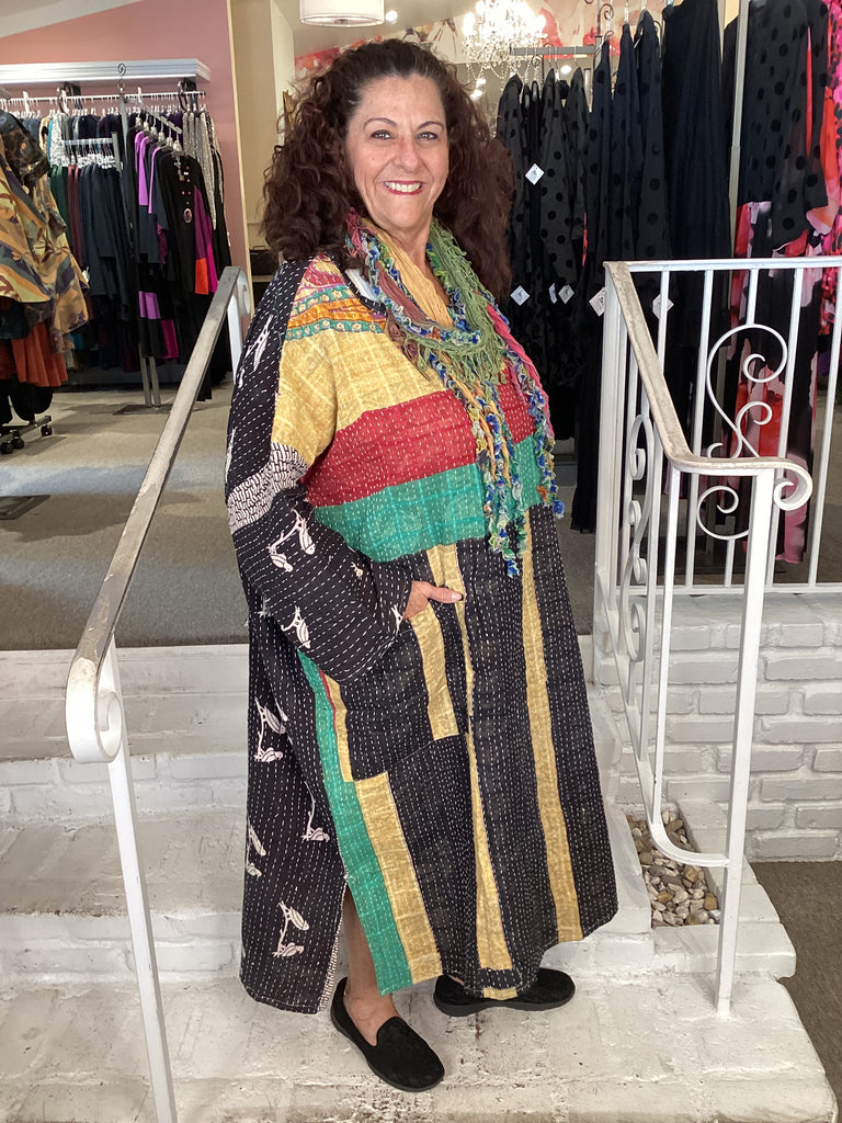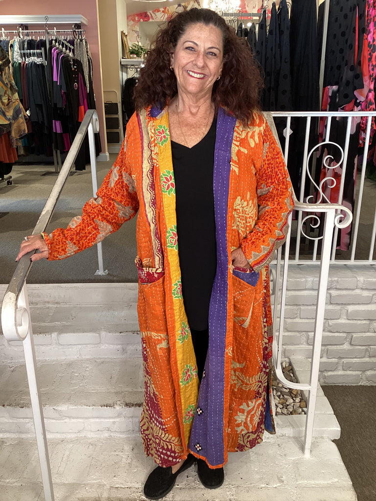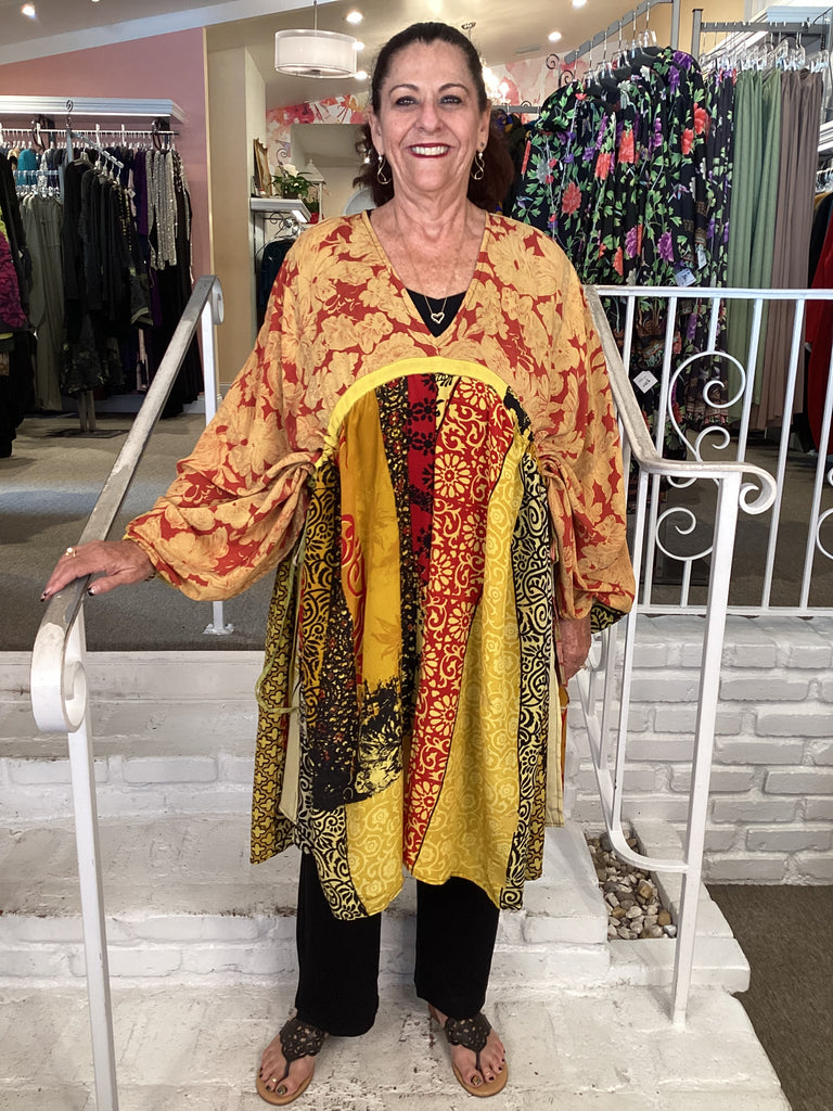 Vintage fabrics from India, truly unique and authentic combined to create these amazing art-to-wear pieces. Lightweight cotton and silk are used for these tunics, kimonos, jackets and shirts, often with KANTHA artisan hand stitching. Designers such as Kantha makes loose generous silhouettes for the Abundance woman!!