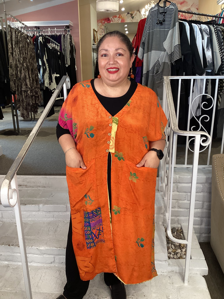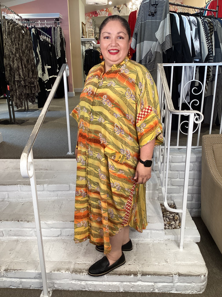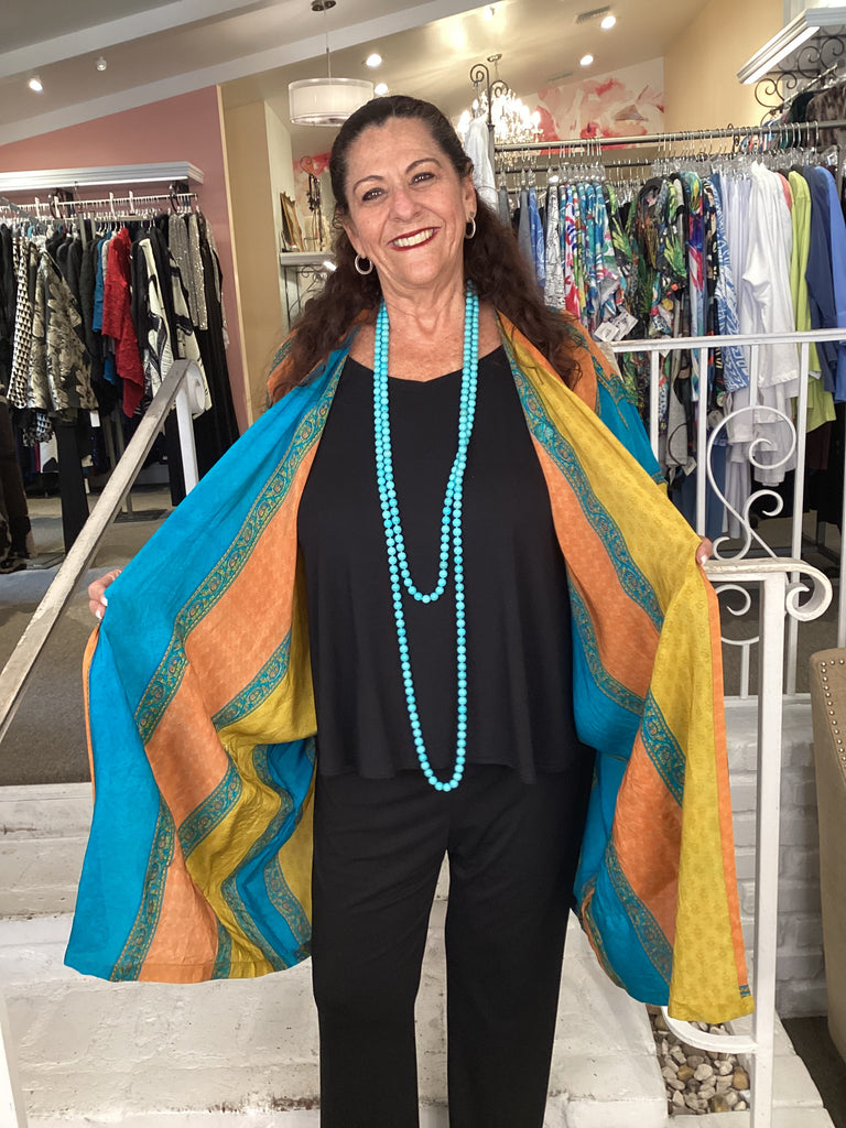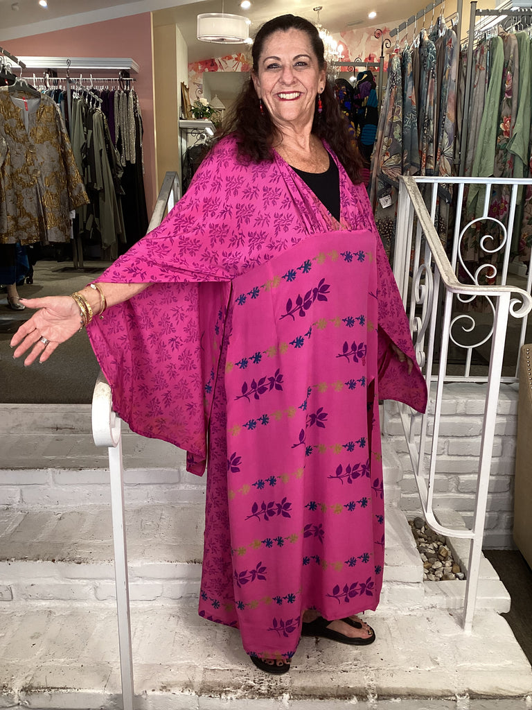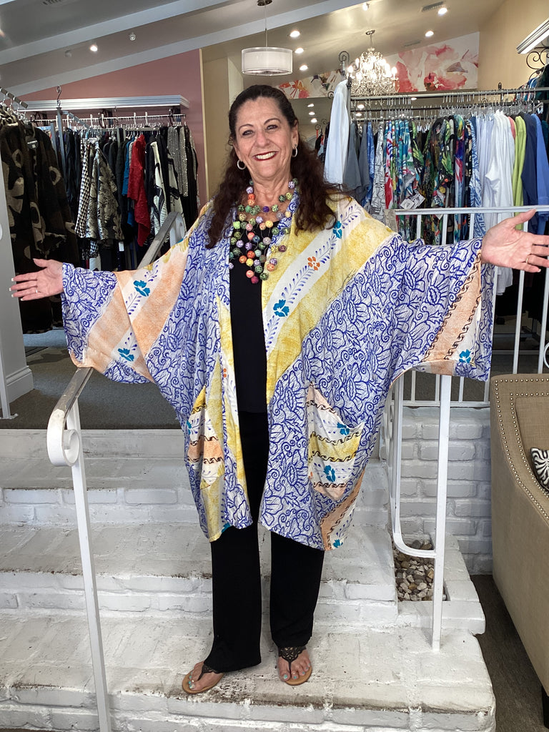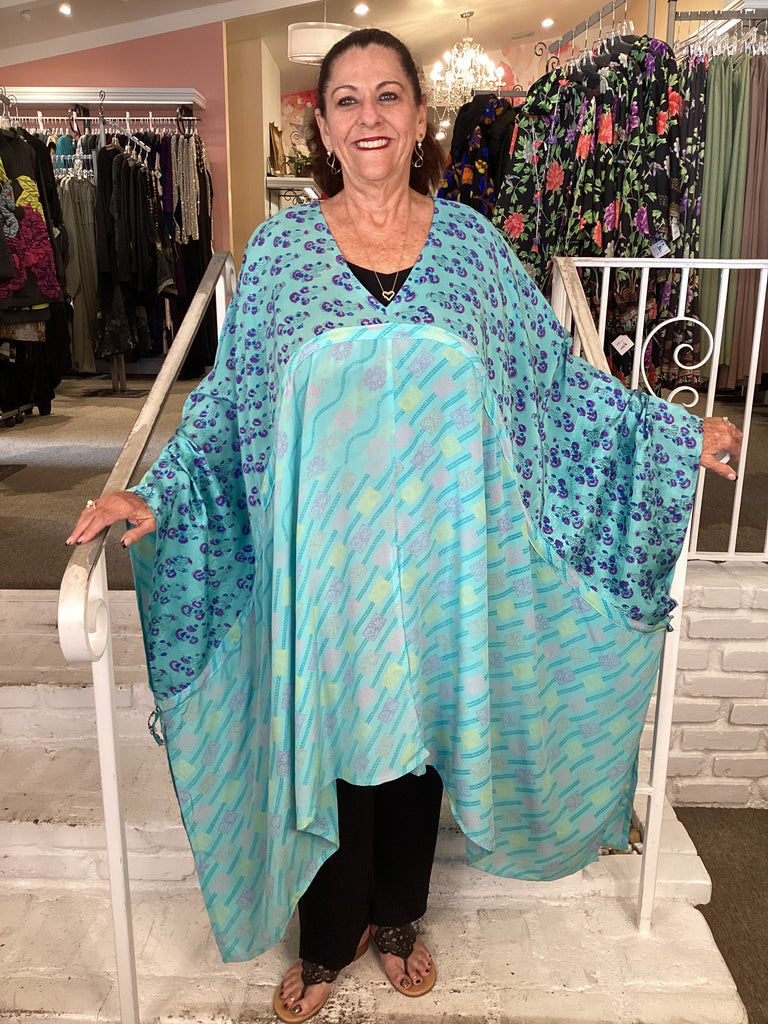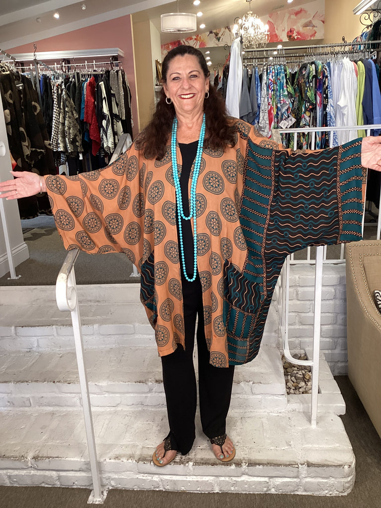 Vintage fabrics from India, truly unique and authentic combined to create these amazing art-to-wear pieces. Lightweight cotton and silk are used for these tunics, kimonos, jackets and shirts, often with KANTHA artisan hand stitching. Designers such as Kantha makes loose generous silhouettes for the Abundance woman!!