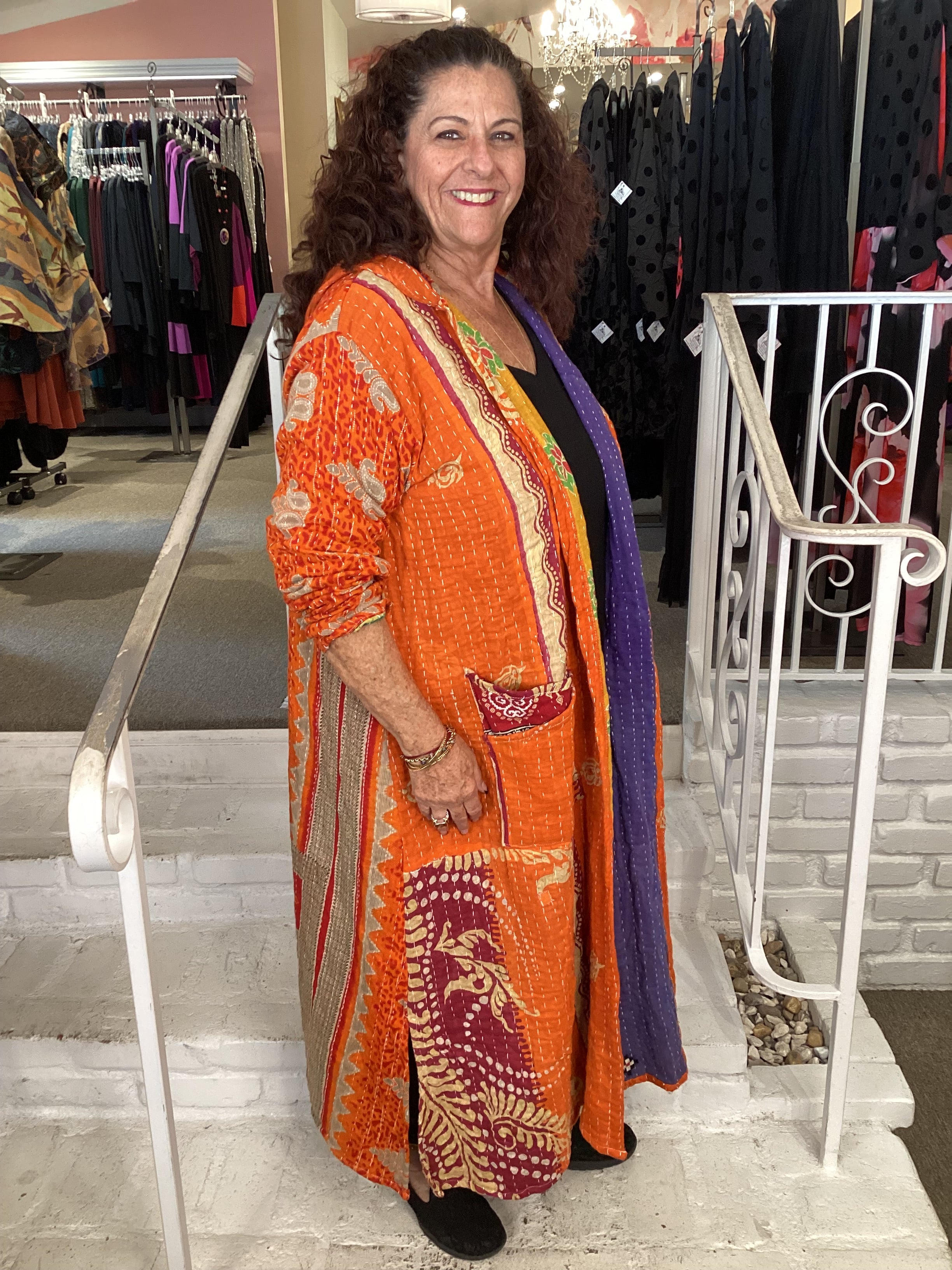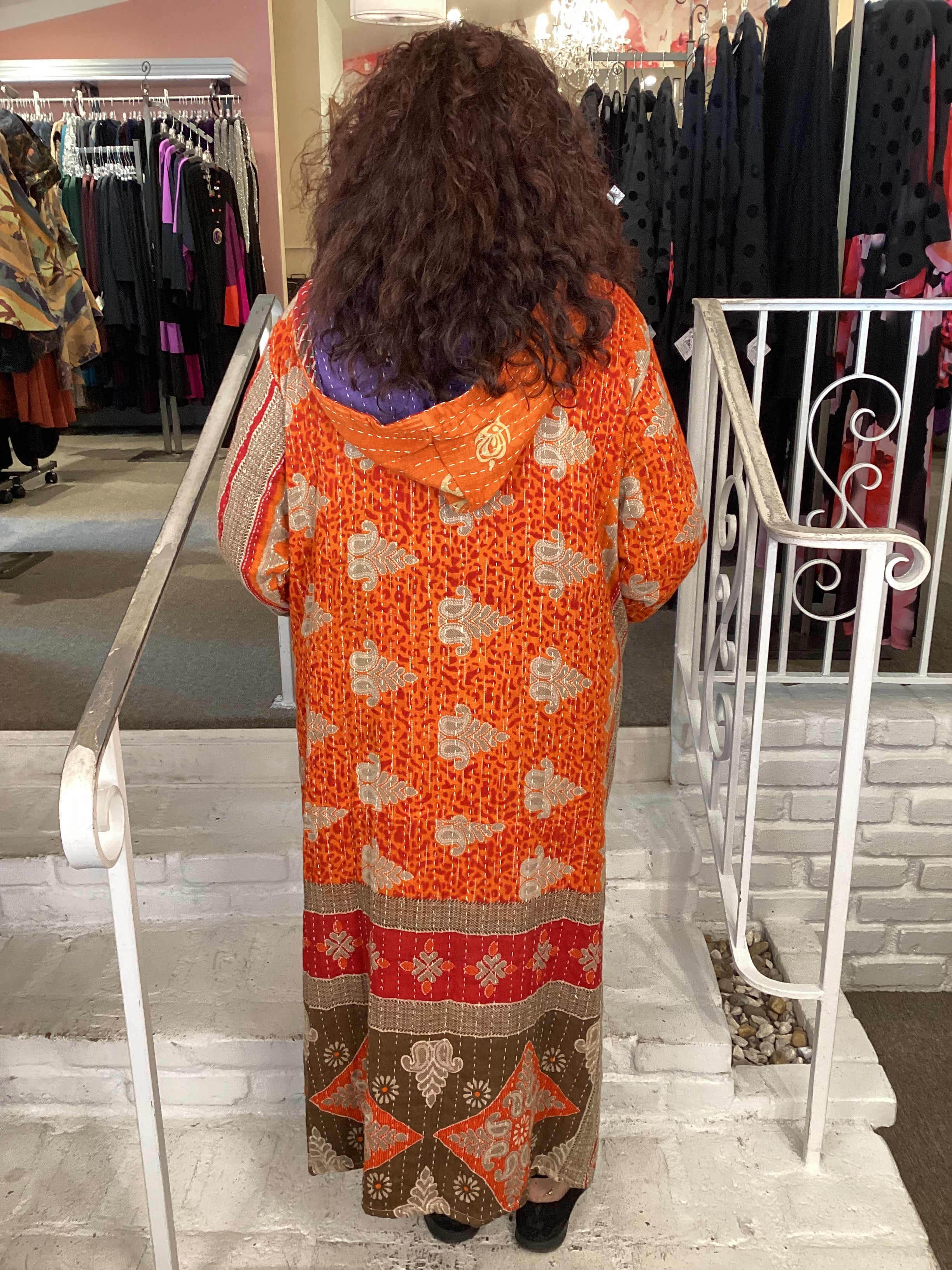 Another one of a kind gem! This long open front coat is comprised of different vintage stitch embroidered vintage cotton sari fabrics. The print and color combinations are amazing and this piece is lightweight and comfortable. Double pockets on the front panels, long sleeves and hood.