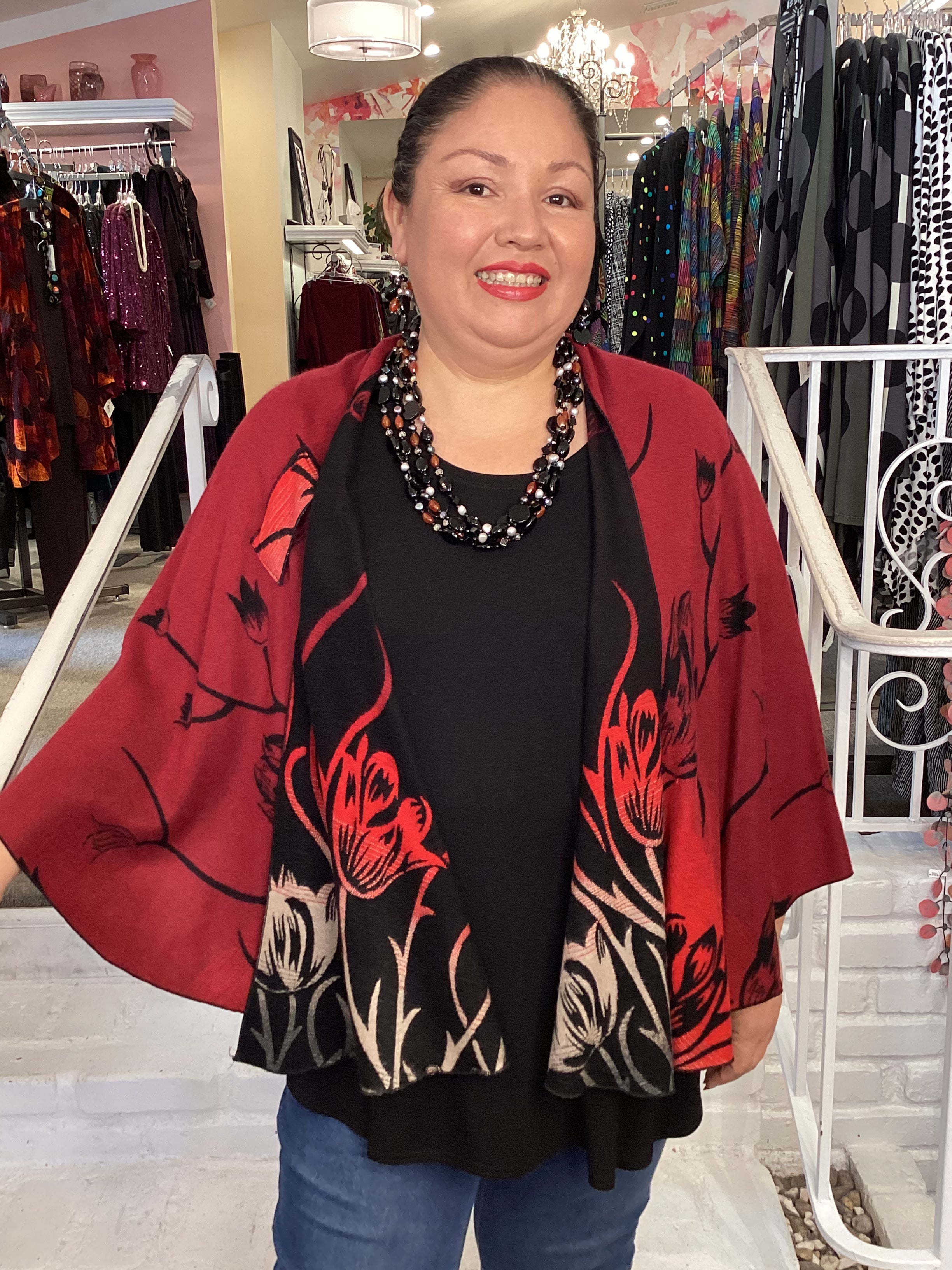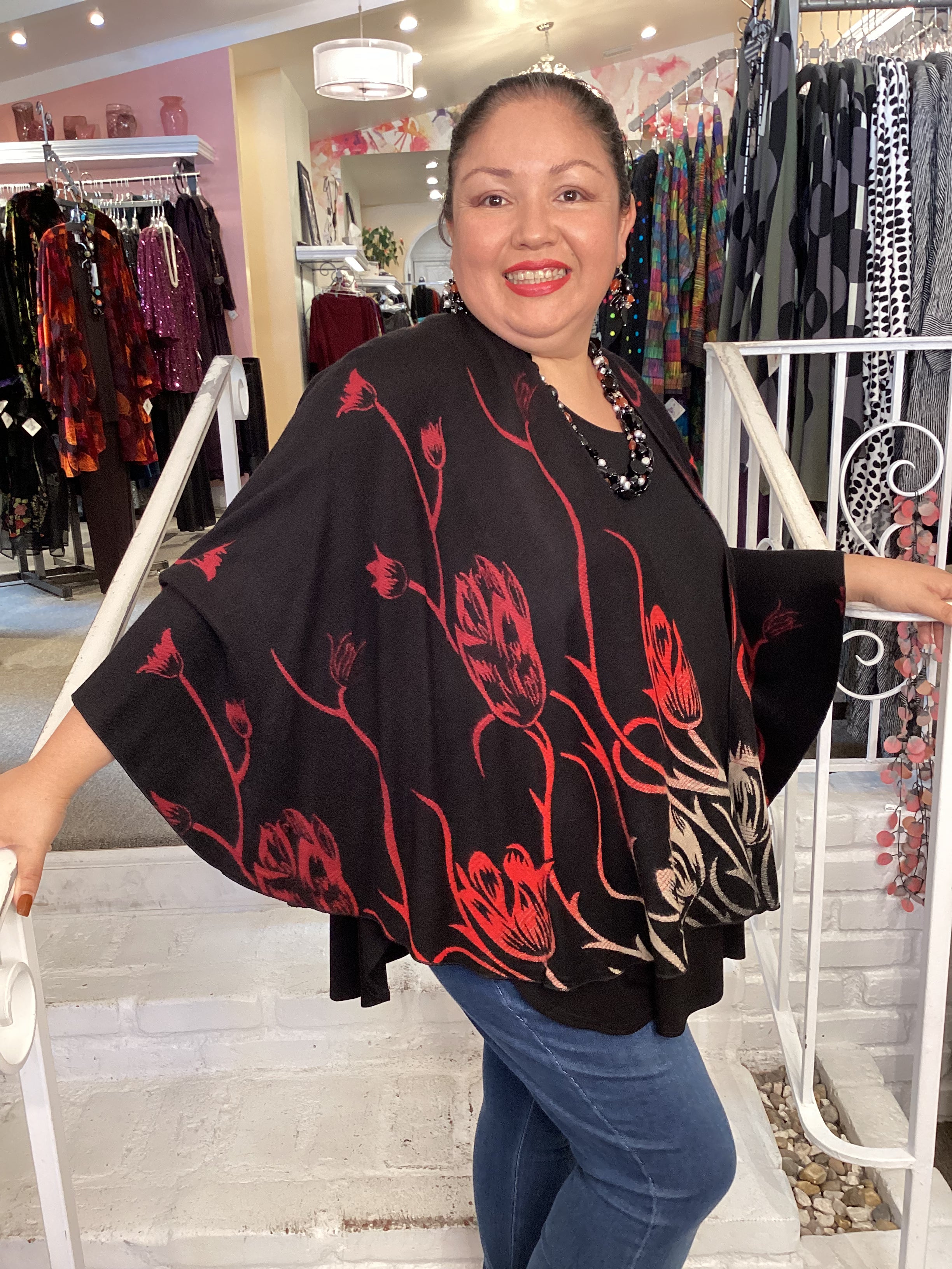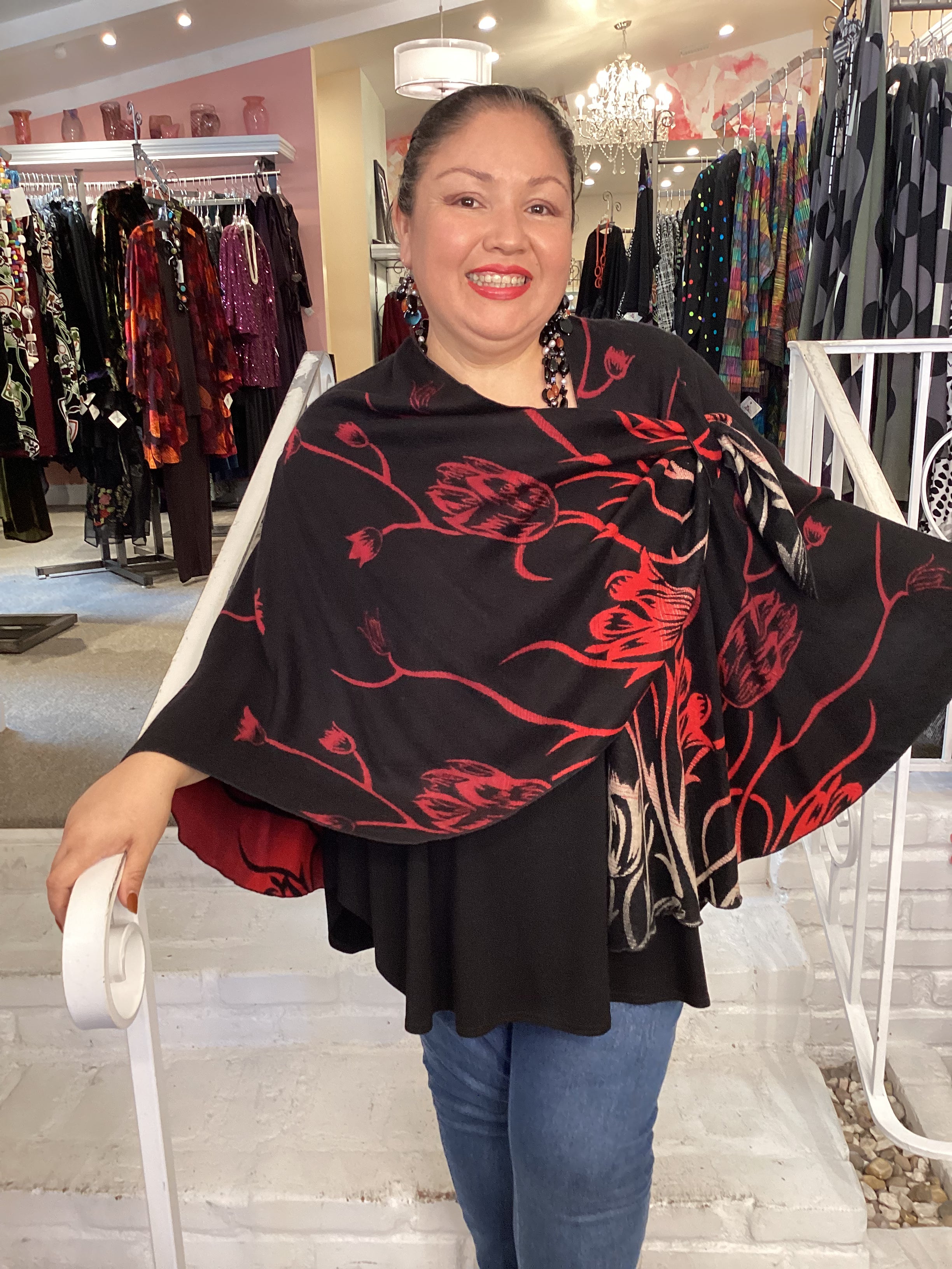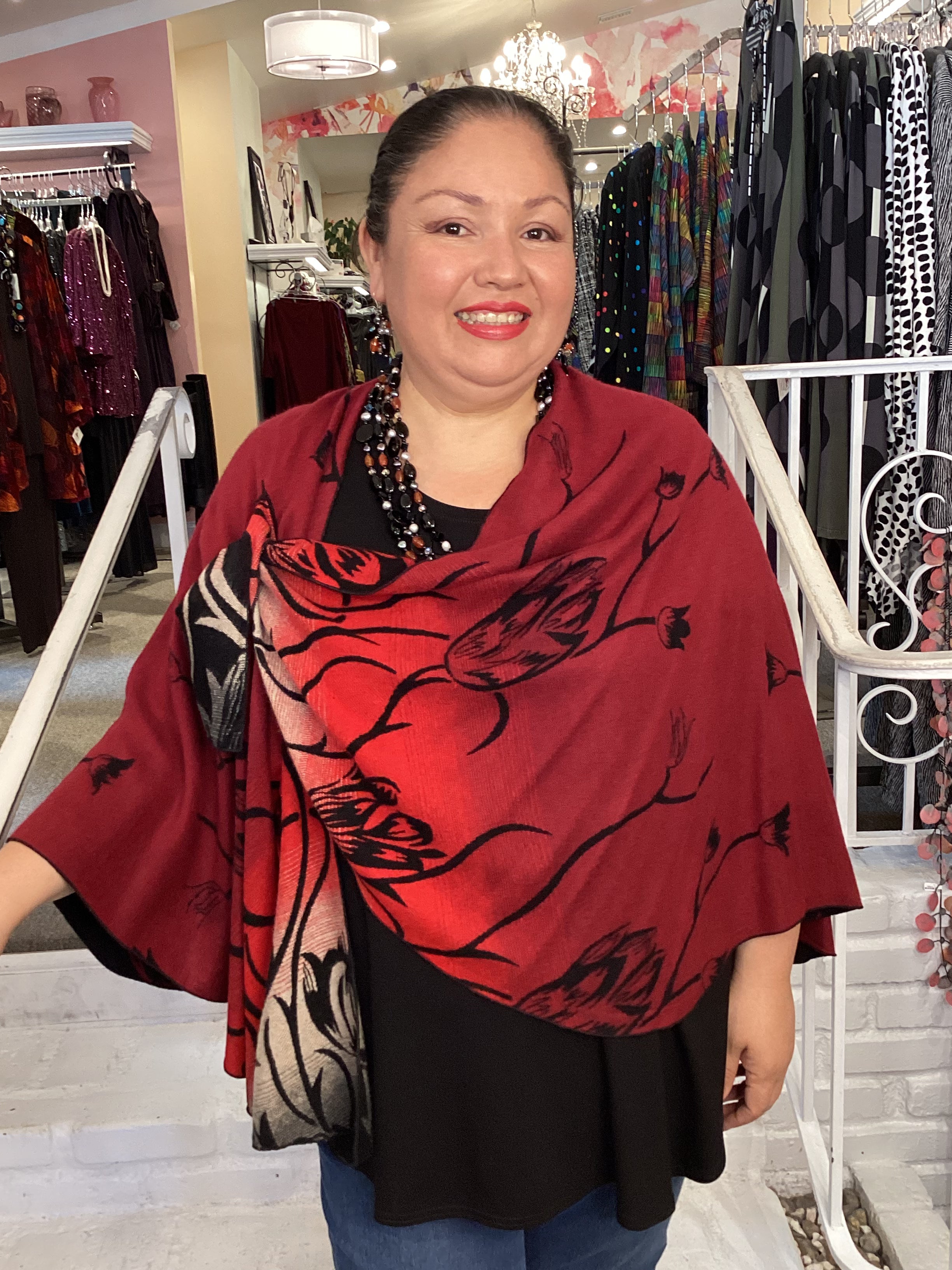 Our newest find from Rapti is an exquisite cashmere shawl. Luxurious reversible wrap in rich hues can be worn open or elegantly draped by pulling one end through the ingenious loop. Makes a great gift, no guessing at sizes! Handmade and fair trade from India. Approximate size 50” x 58”.
