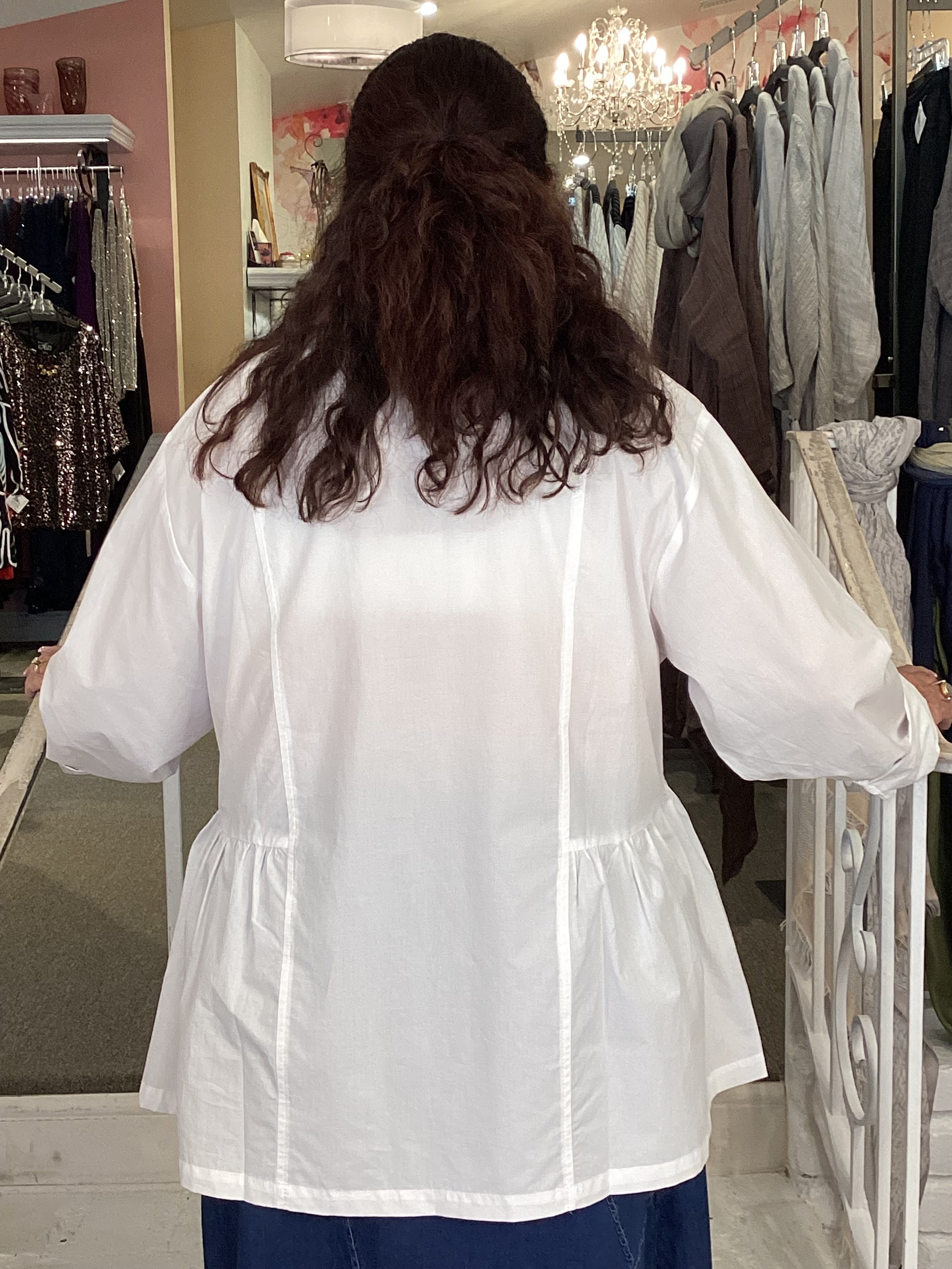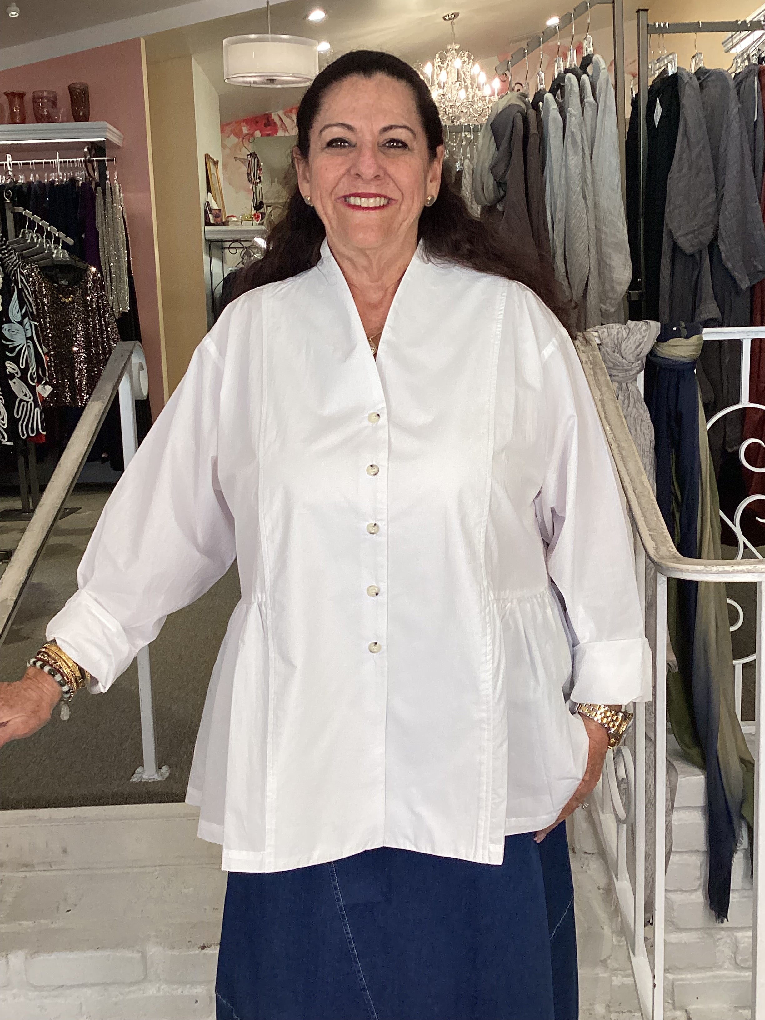 This peplum-style white button down is a great way to elevate a timeless outfit. Collarless V-neck, long cuffable sleeves, and gathered peplum detailing on sides. Full button placket that ends at the waist to allow for elegant draping.