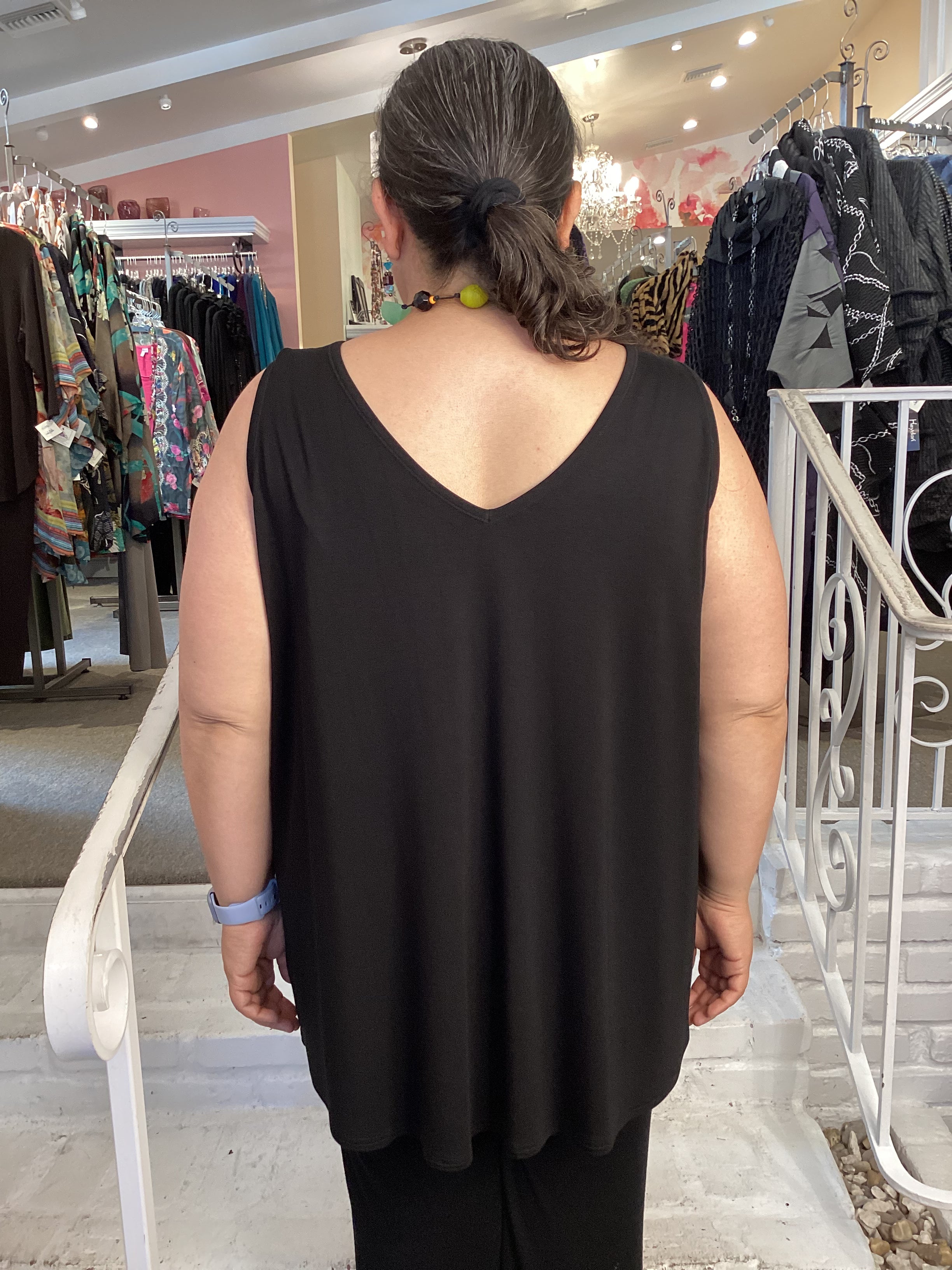 The Reanna is a reversible tank, with a soft V-neck in the front and a high, round neck in the back. Slight tapering and a narrow fit means the Reanna adheres to the body from bust to low hip. Wide shoulder straps hide bras, and shaped arm holes prevent gaping. Light and easy for layering, the Reanna is a truly versatile piece.