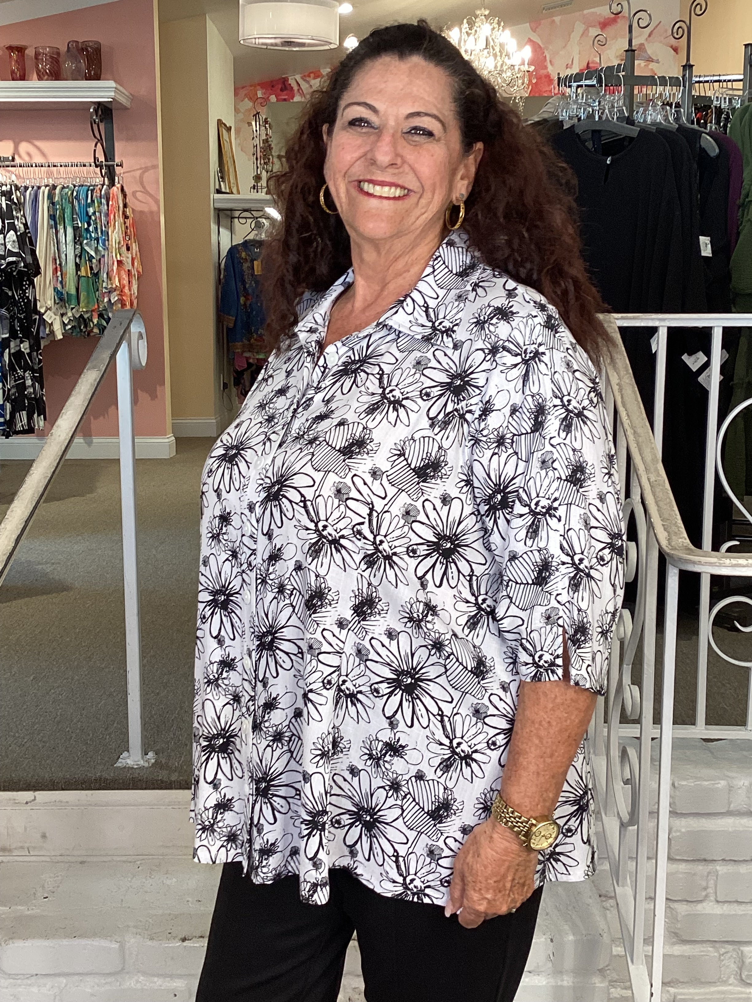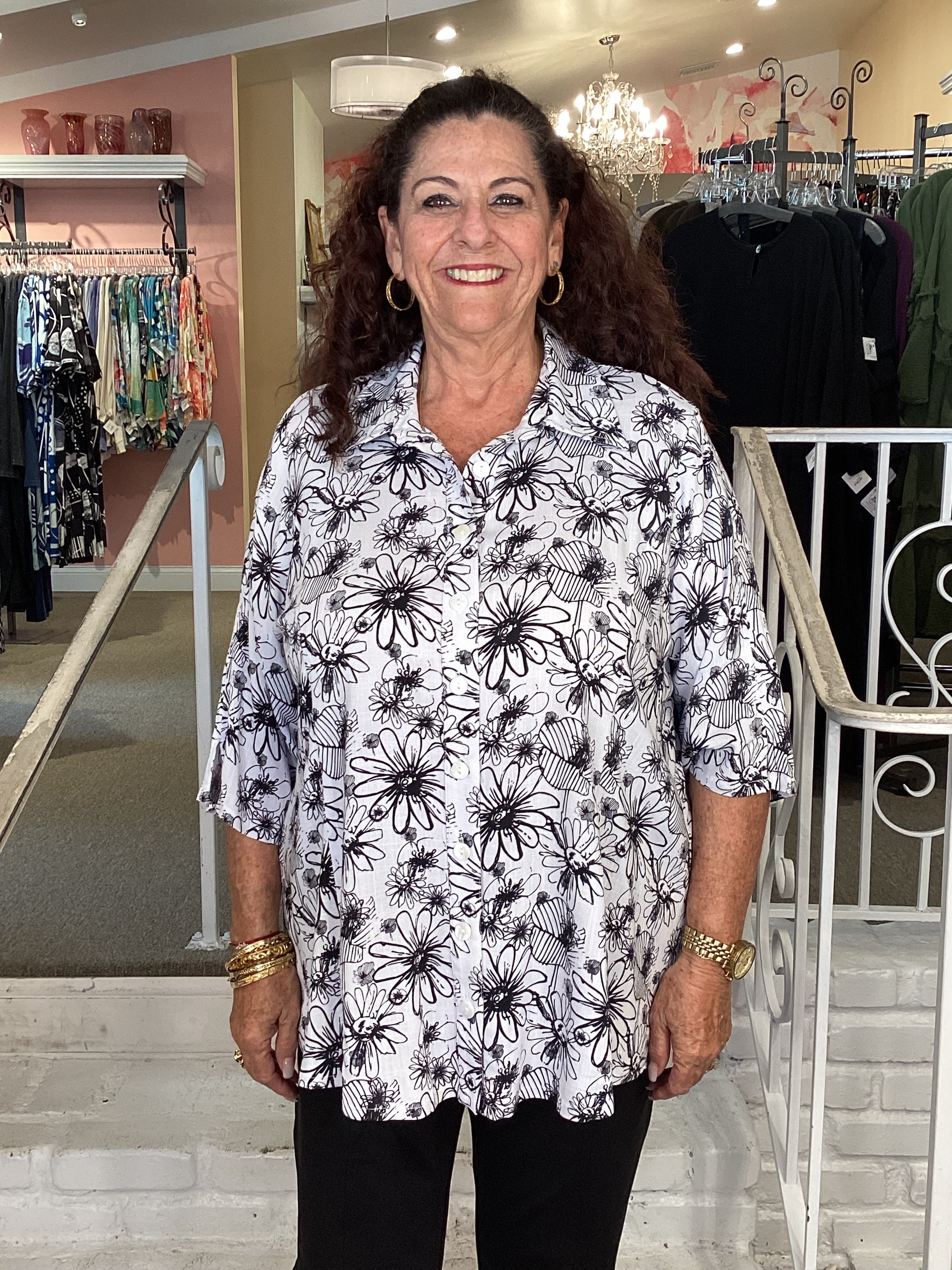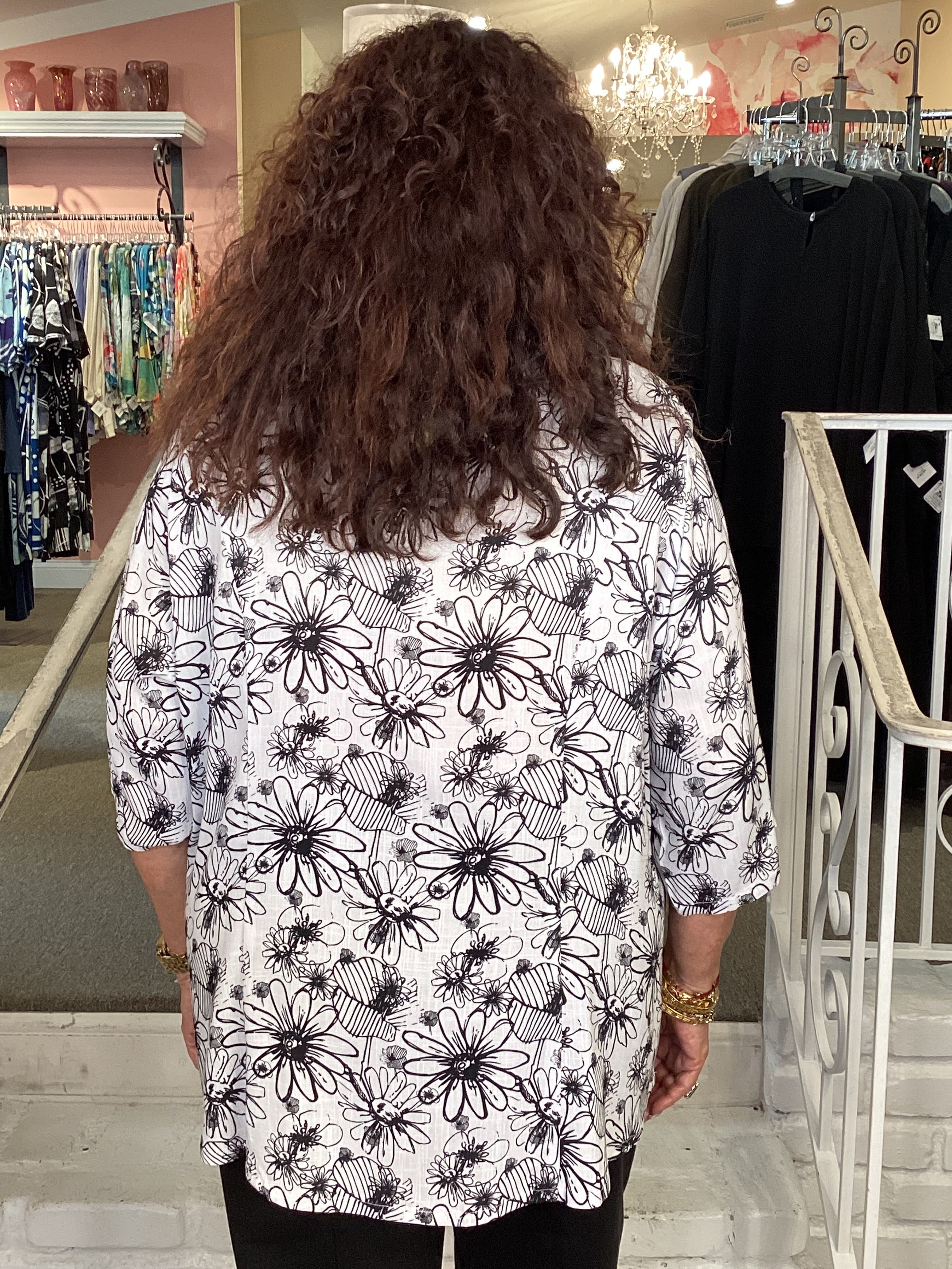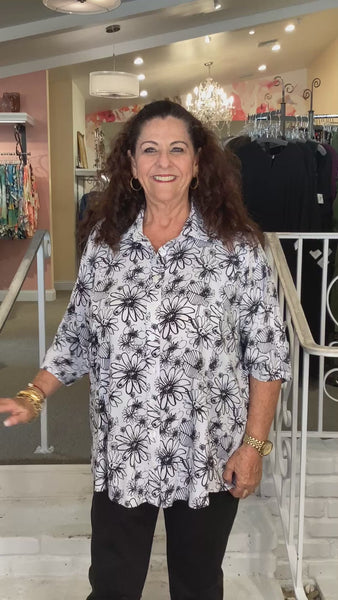 One of our favorites...the Lorine blouse in our all time favorite black and white.  Linen/bamboo blend with a linen texture fabric styled in a traditional button front top with 3/4 sleeves and a slight a-line silhouette.