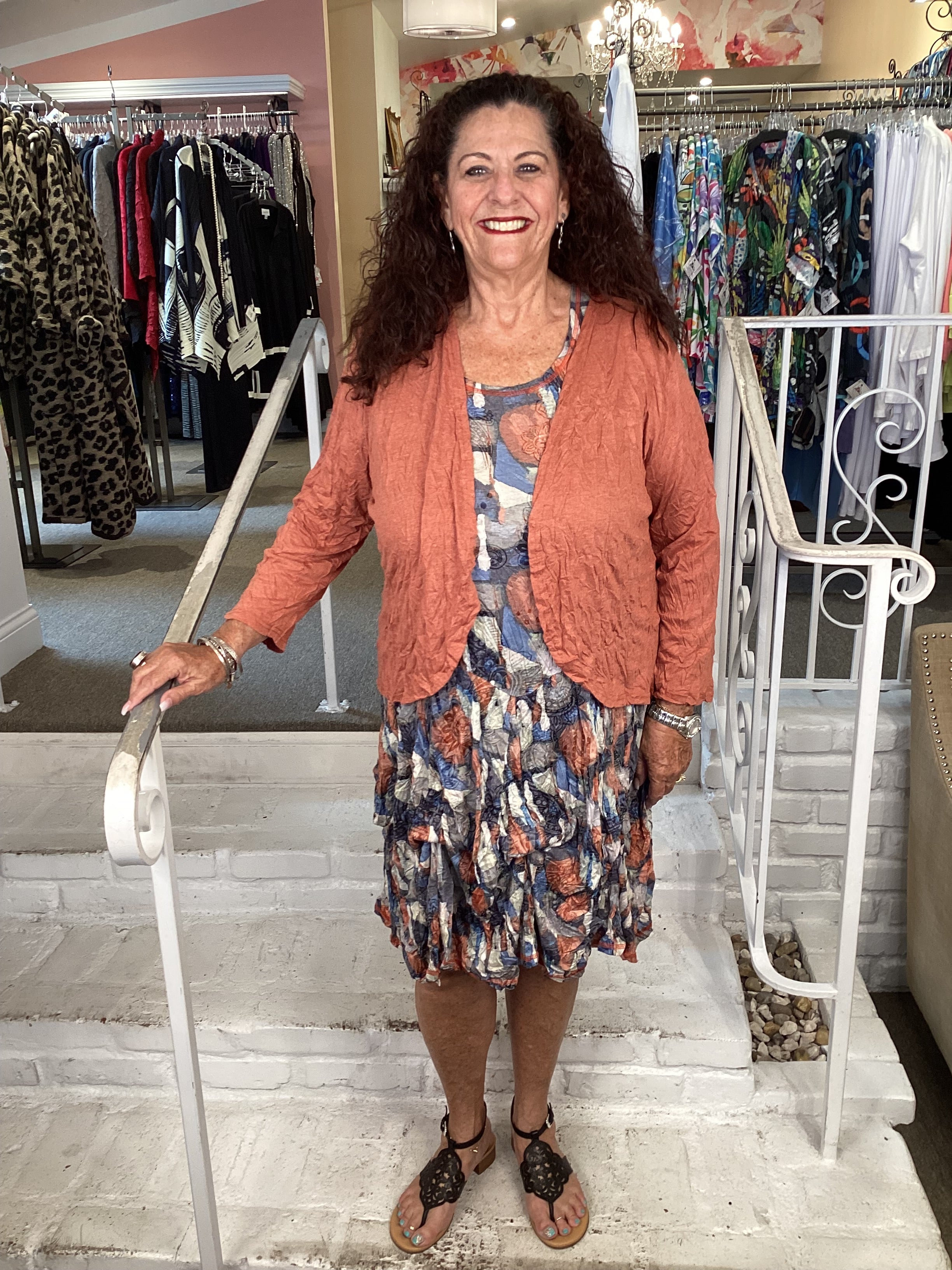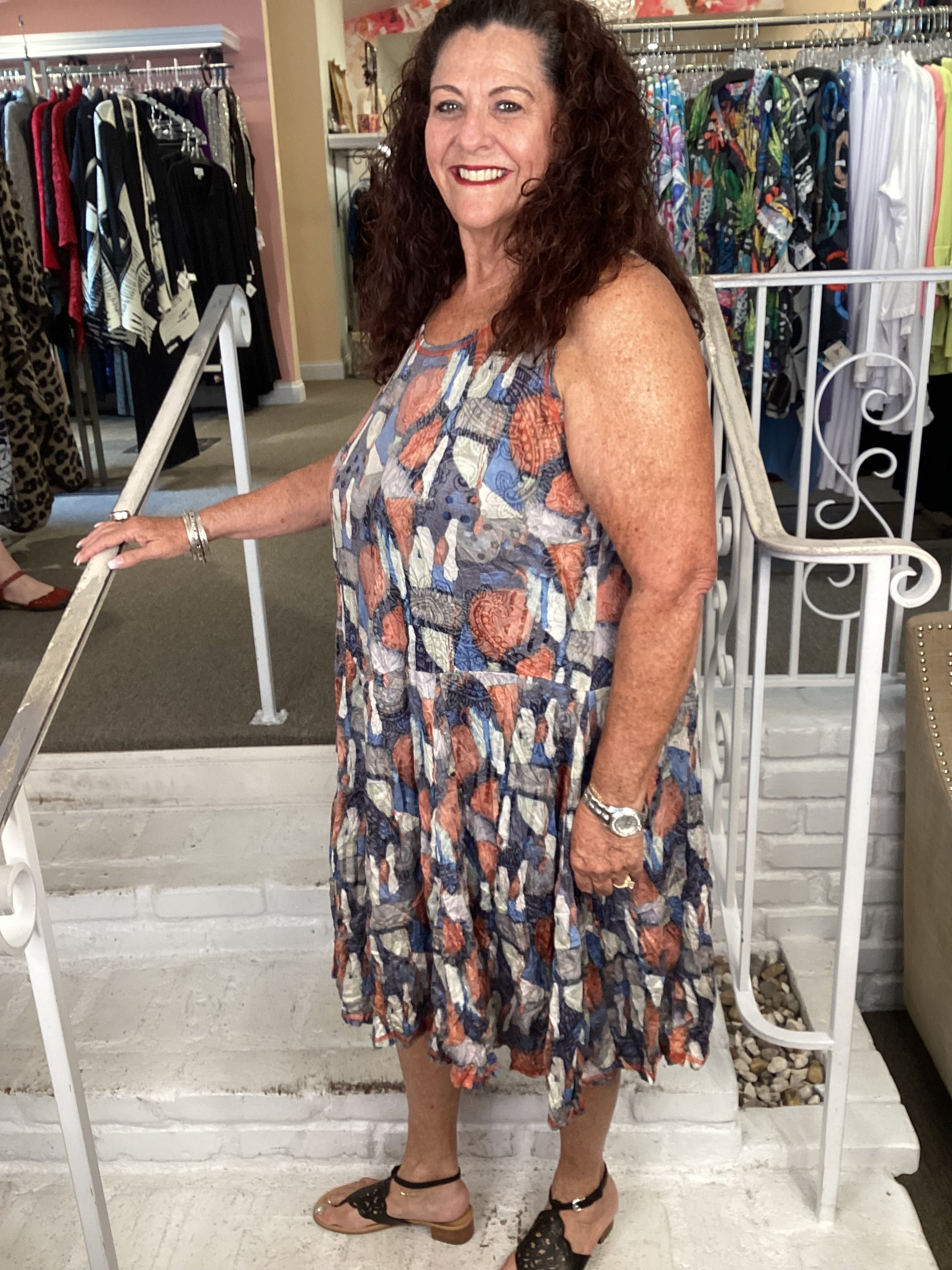 Shana's tank dresses are a favorite at Abundance, The stretchy crinkle knit is soft an lightweight with a fabulous and colorful print. The inside ties around the skirt can be used to lengthen/shorten the skirt length.