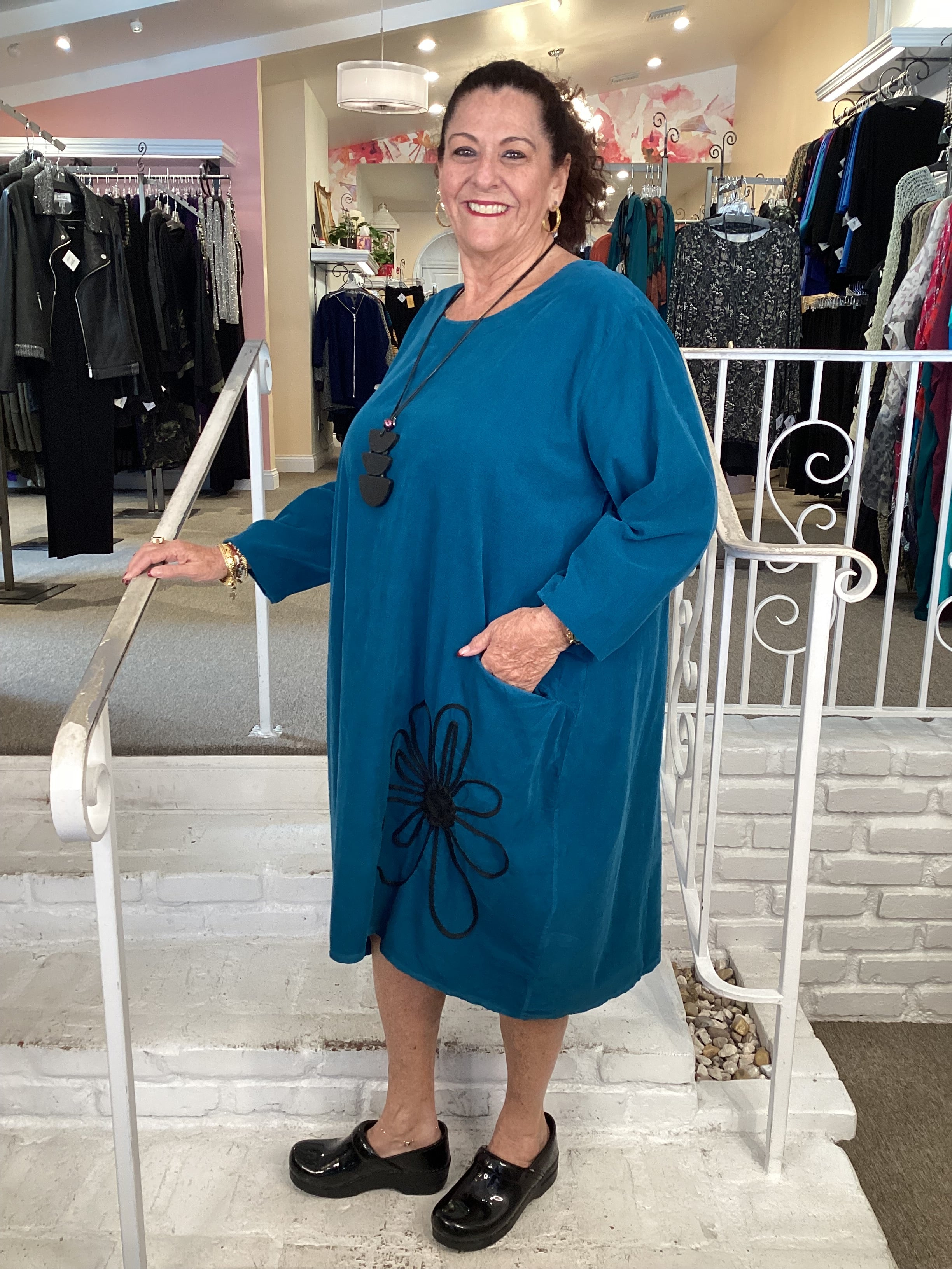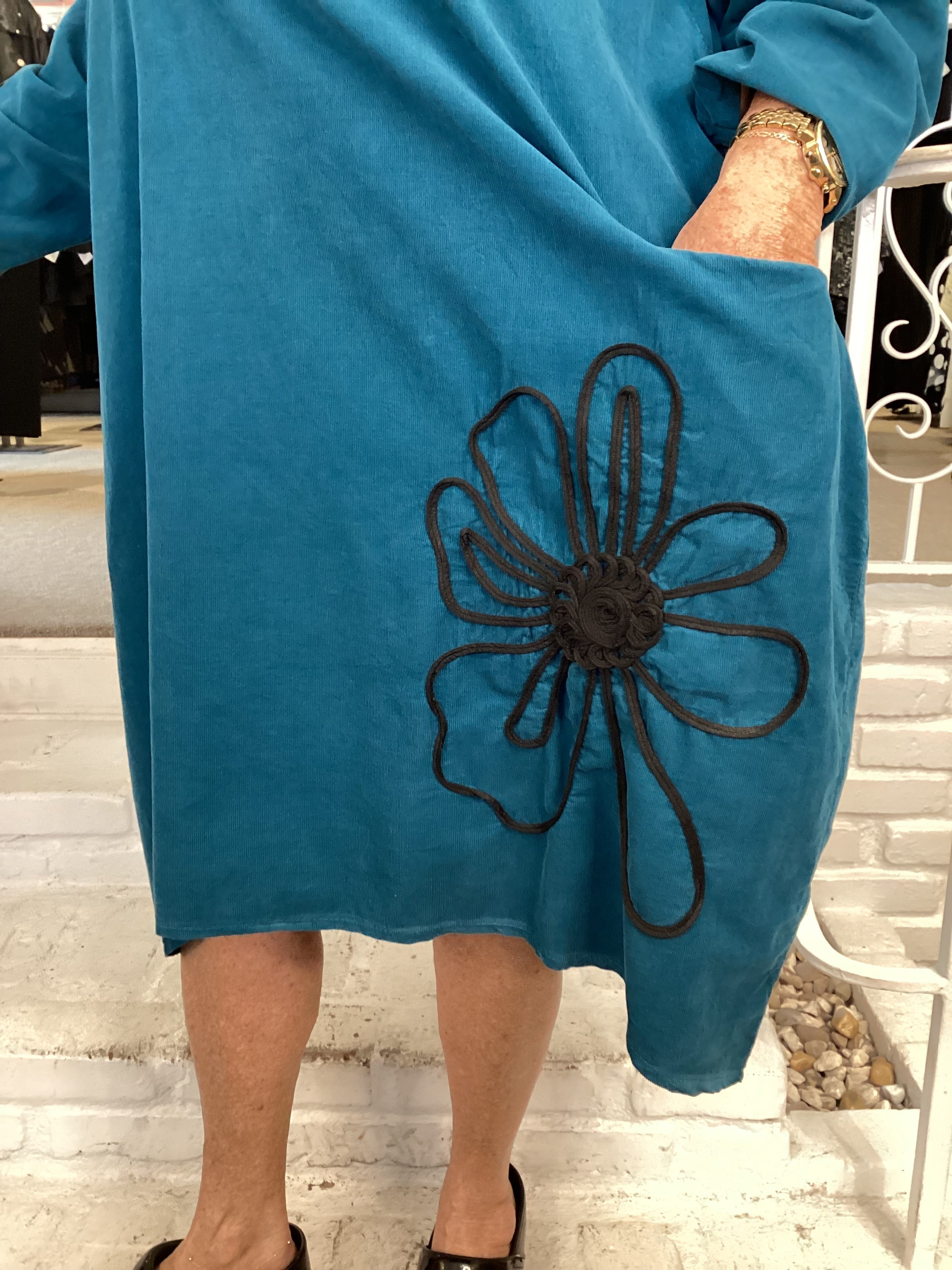 Brighten up chilly days with the Flower Corduroy Dress. Made from soft Italian cotton corduroy, this playful dress features a bold sunflower appliqué and roomy side pockets. Its relaxed cocoon fit and long sleeves offer cozy comfort, making it perfect for fun outings or creative gatherings. Will fit plus size.