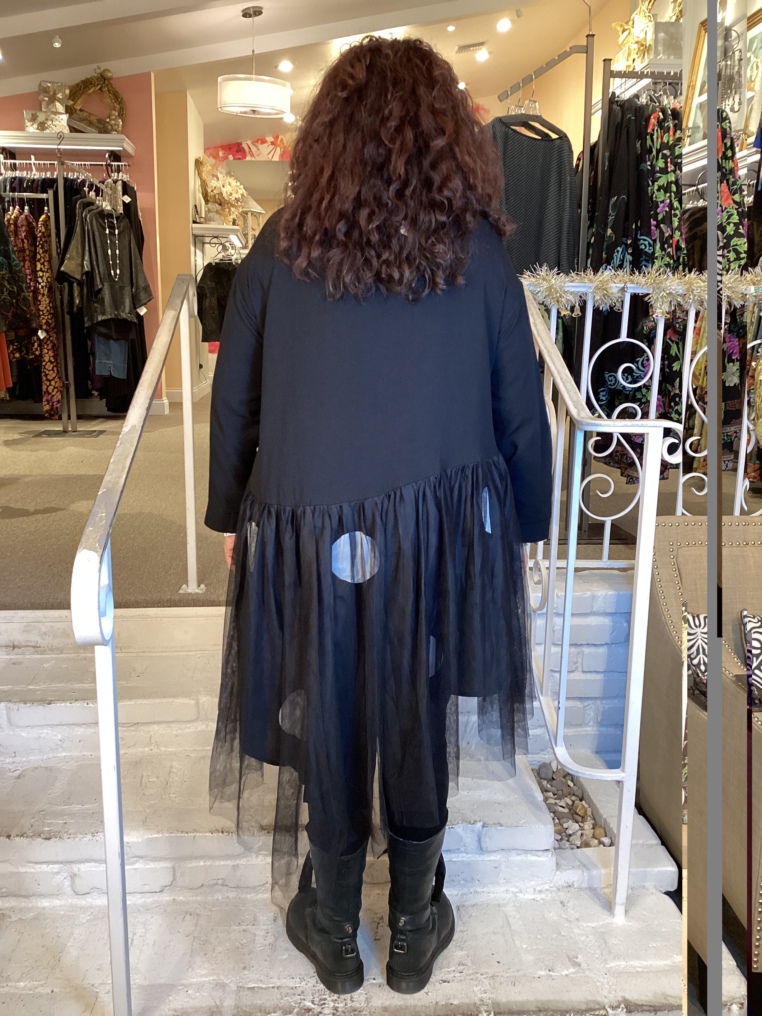 Goth meets boho in the most fun way....polka dots!!! The traditional long sleeve blouse is diagonally seamed at the waist with a double layer of fun skirts. Black netting with an asymmetric hem is layered over huge white dot skirt. 44" bust, 40" length
