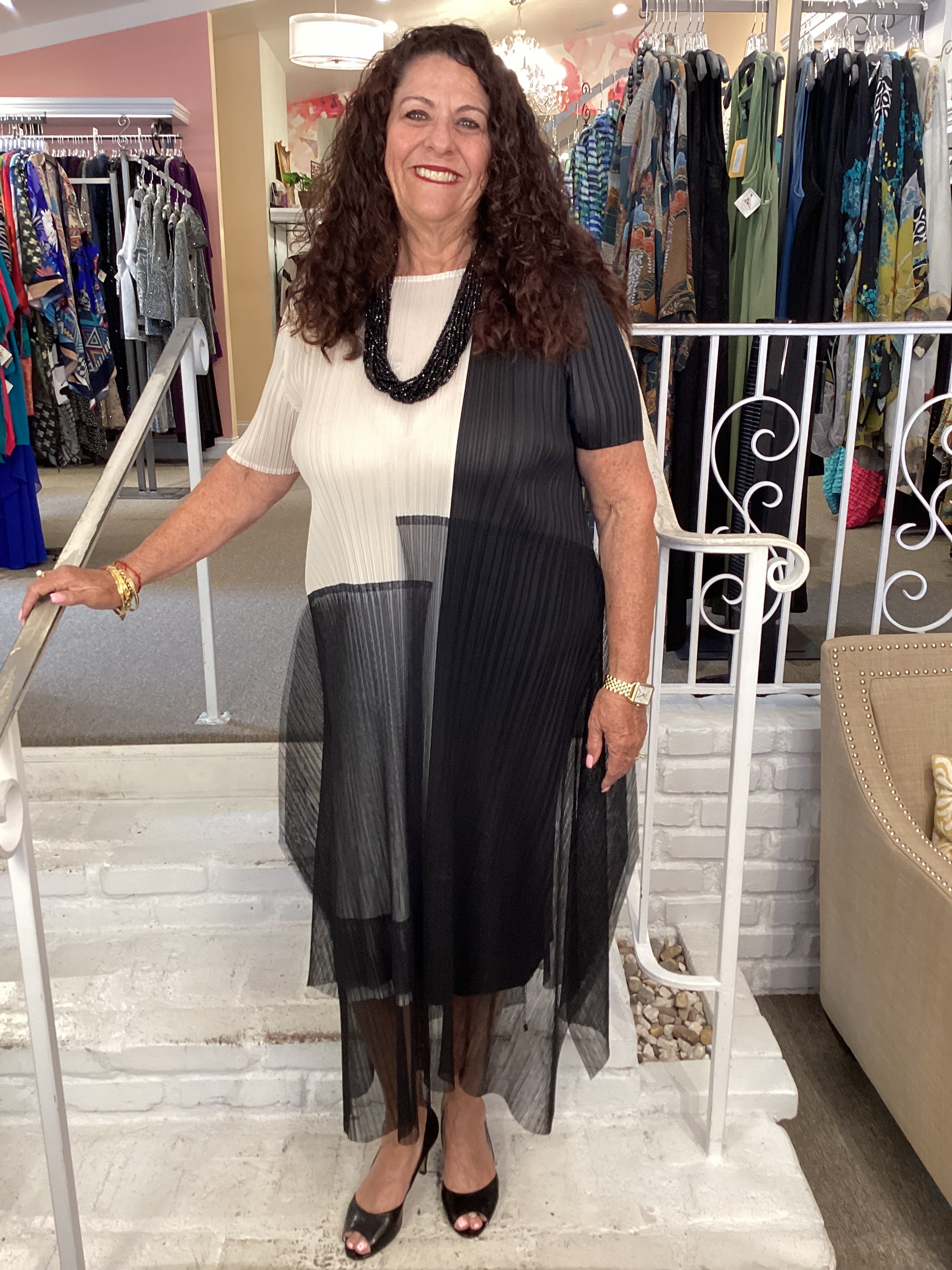 This dress is flattering from all angles with its round neckline, short sleeves, and forgiving fit. The pleated fabric suits multiple body types, while the sheer mesh panels add a touch of elegance and grace. Perfect for any occasion.