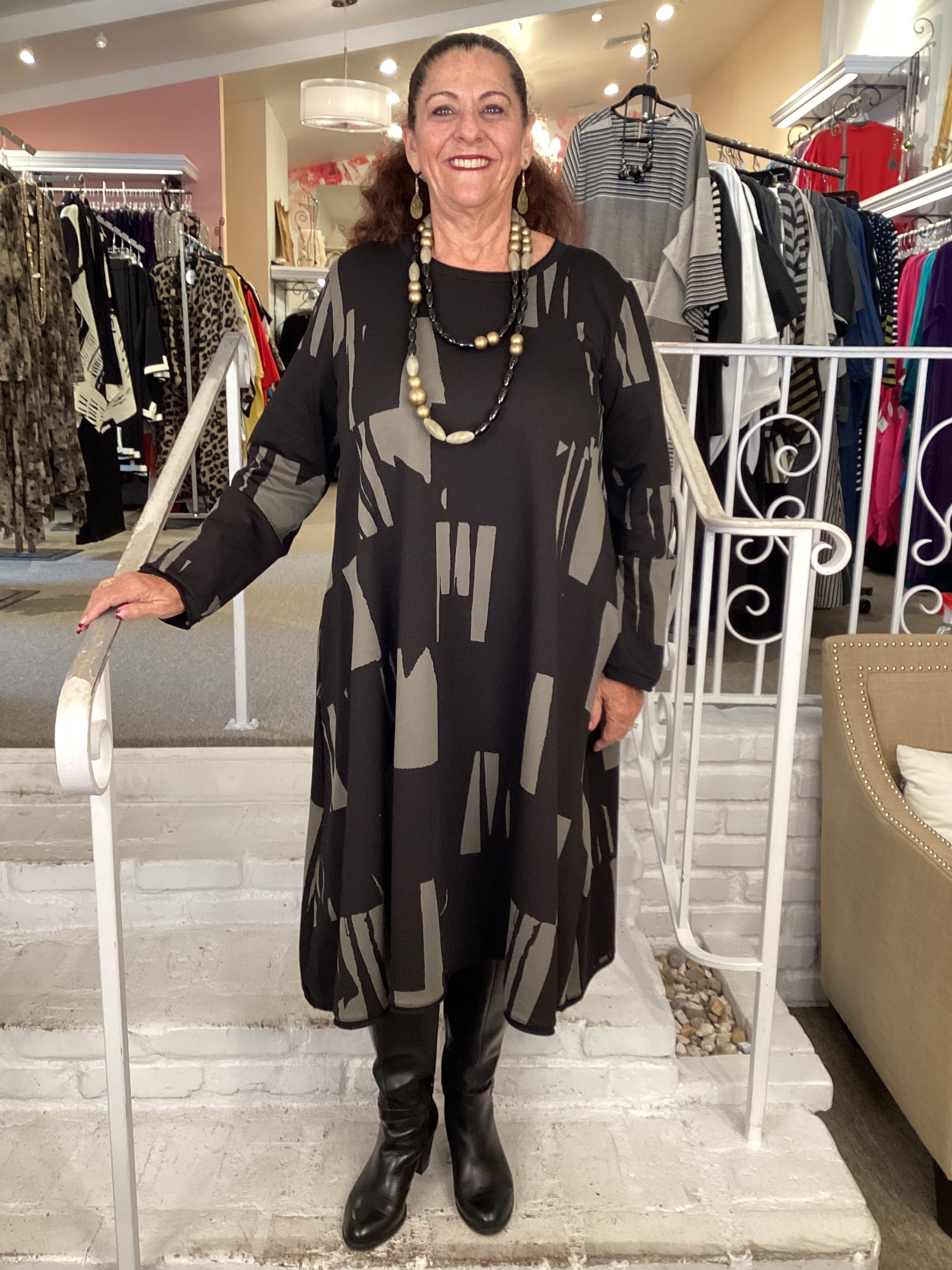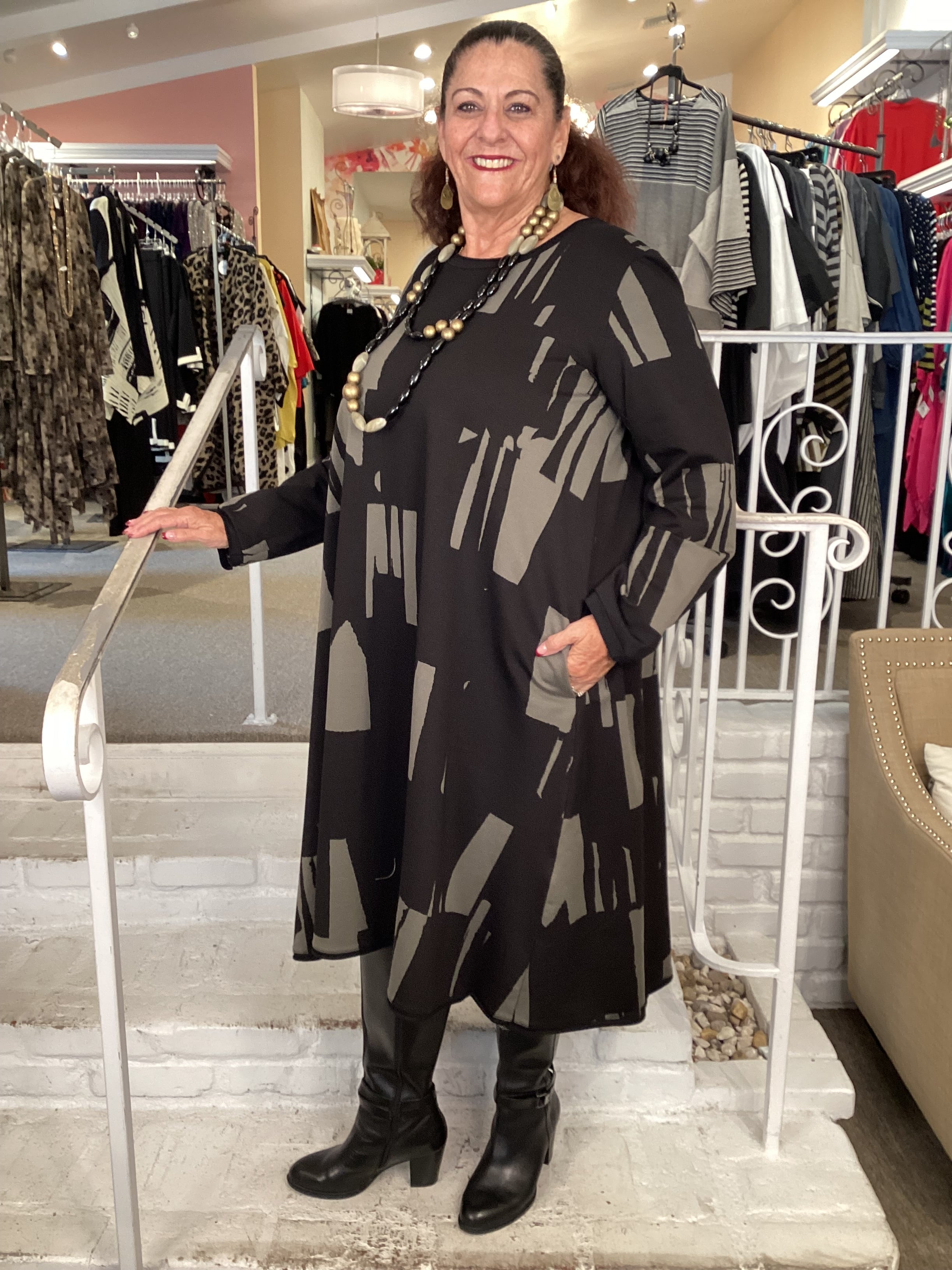 Step into style with the Rivelle Dress in Khaki and Black! Featuring Luukaa’s bold graphic print, this midi-length jersey dress brings playful charm to your wardrobe. The round neckline and long sleeves keep it comfy and versatile, while the softly flared A-line shape moves with you. Practical side pockets blend seamlessly, and the easy pull-on design means no fuss, no closures. Perfect for everything from casual days to dressier outings, this dress effortlessly adds flair to any occasion.