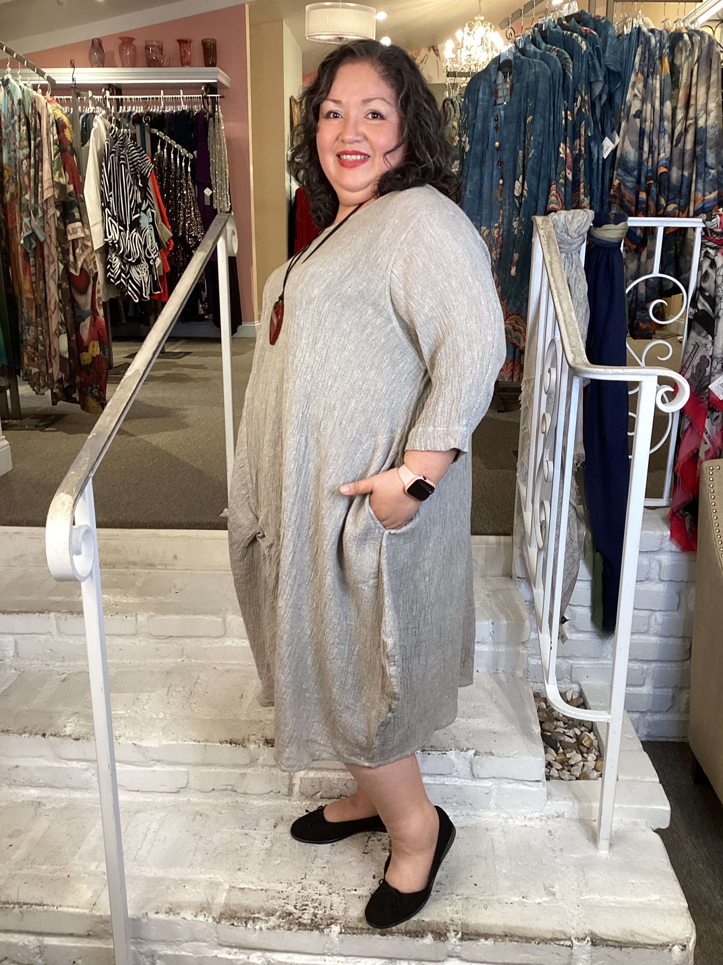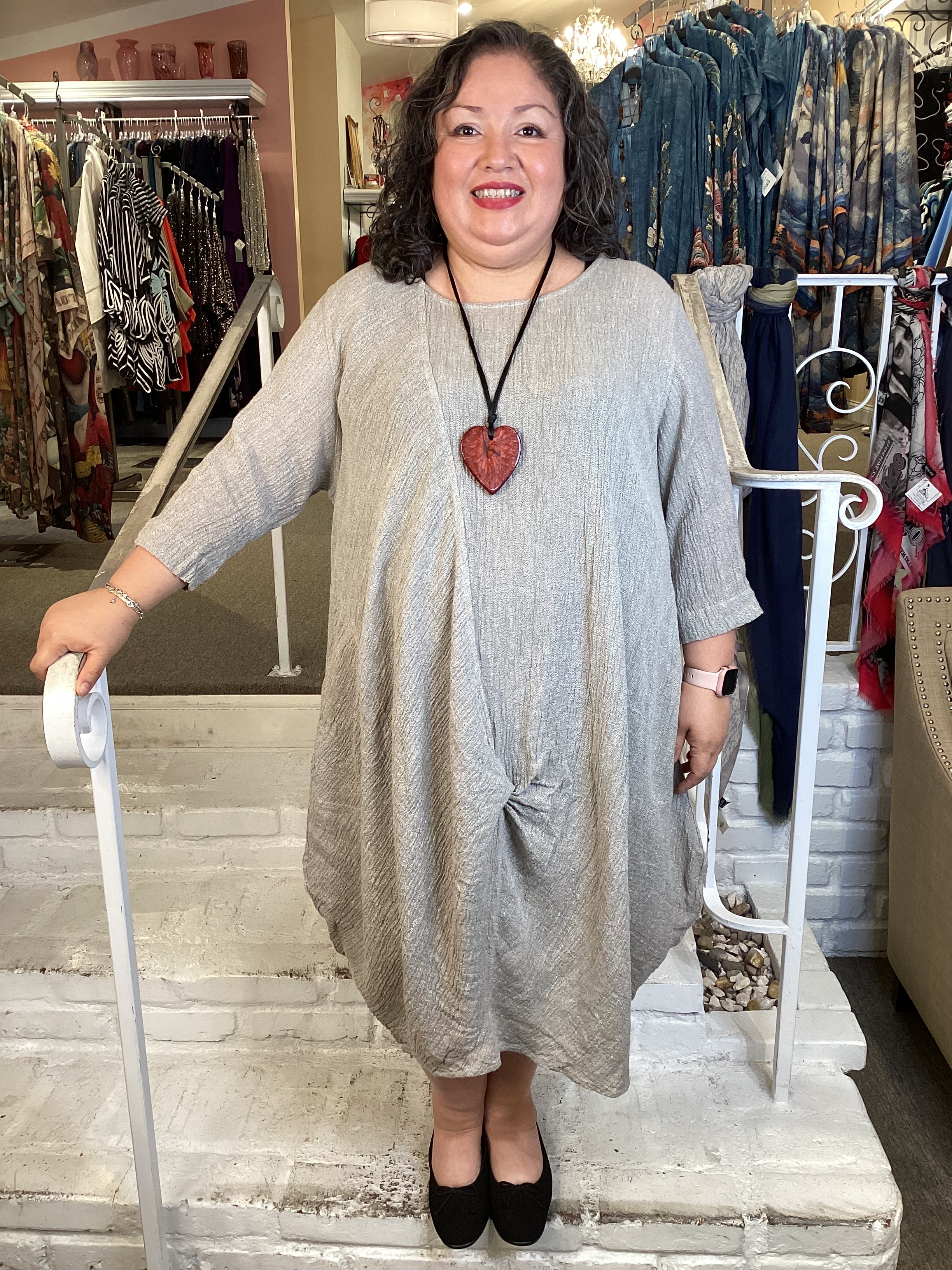 Crafted from breathable linen gauze, this balloon-style dress combines effortless elegance with thoughtful construction. The front gathering detail creates visual interest and flattering dimension, while three-quarter sleeves offer versatile coverage. A symmetrical hem ensures polished proportions from every angle. The natural texture of linen gauze provides comfort and movement, making this piece an ideal choice for warm-weather occasions or layered styling throughout the seasons.