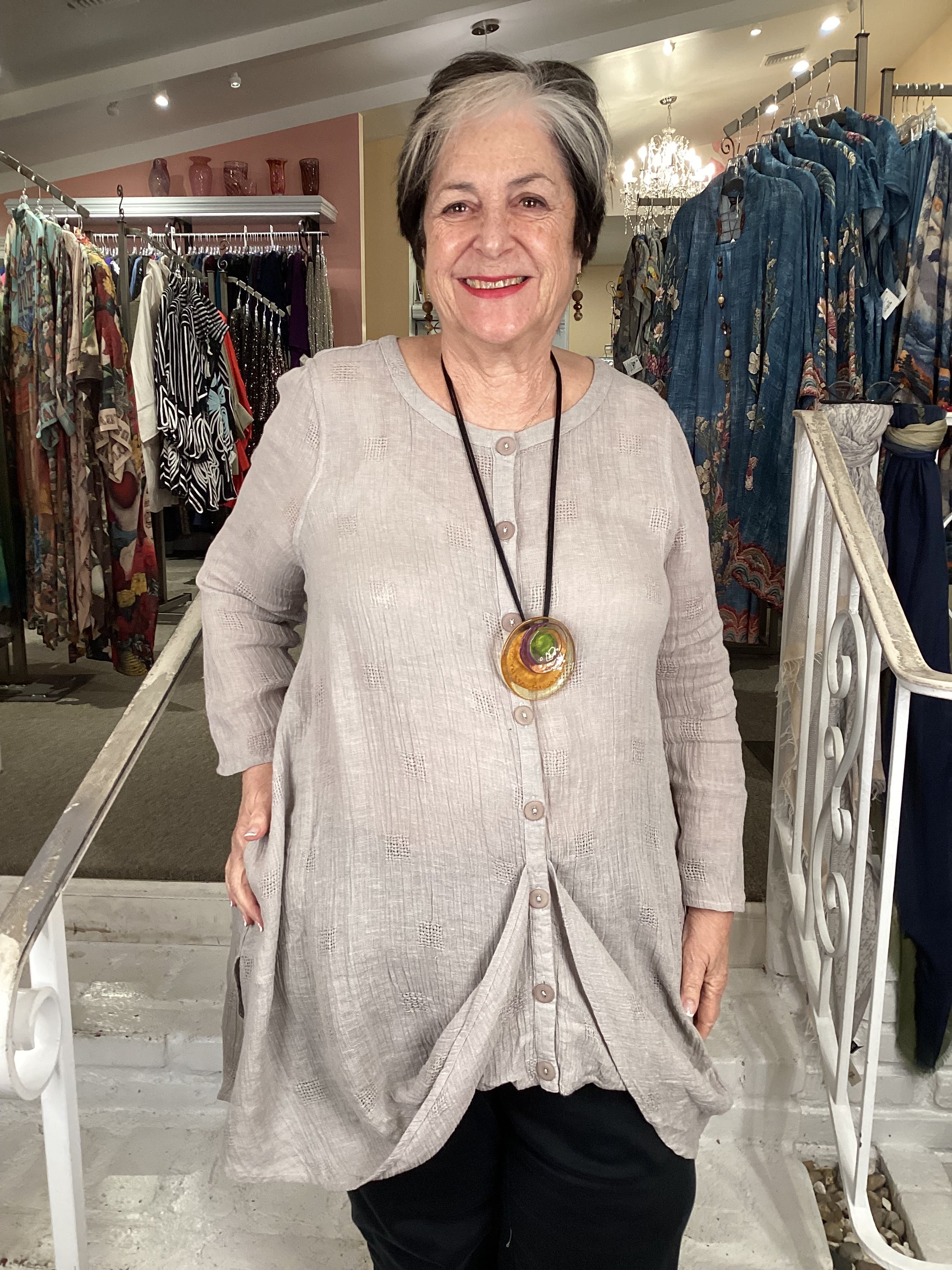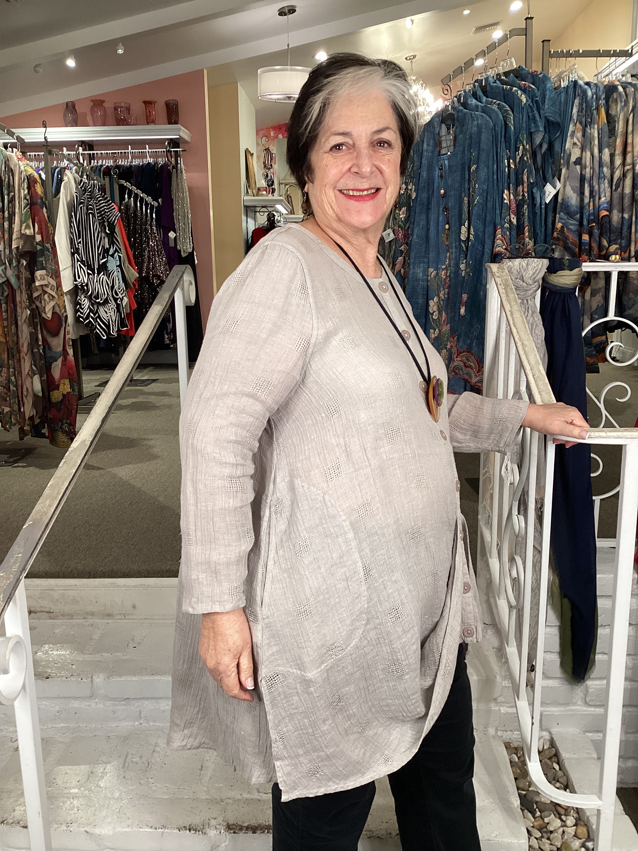 This refined button-down shirt elevates everyday dressing with its elegant construction. Crafted from lightweight linen gauze with a subtle crinkle texture, it features long sleeves and a front drape that adds graceful movement and dimension to your silhouette. The button-front closure provides styling flexibility, allowing you to wear it open as a layering piece or buttoned for a polished, put-together look. Ideal for warm-weather versatility.