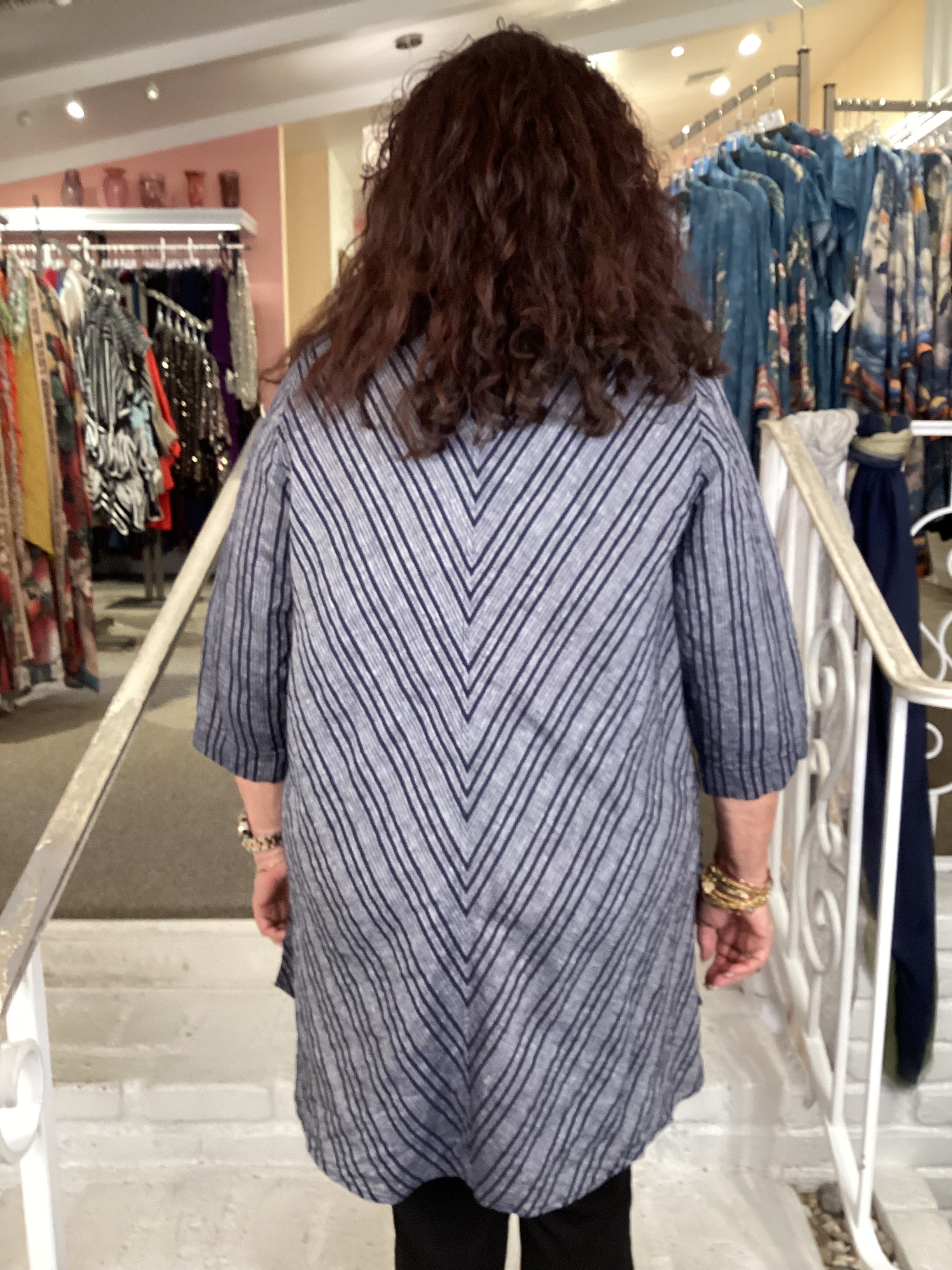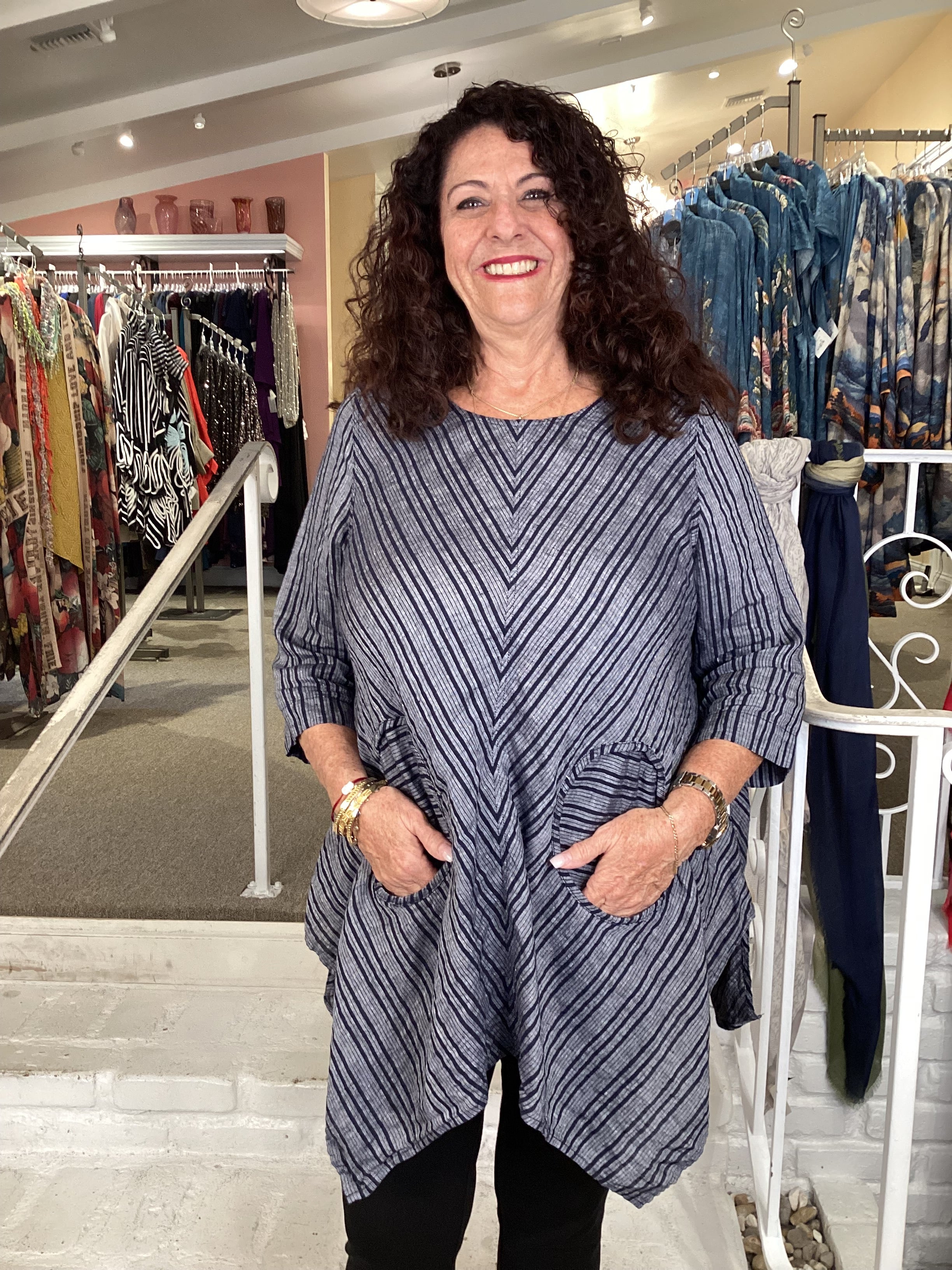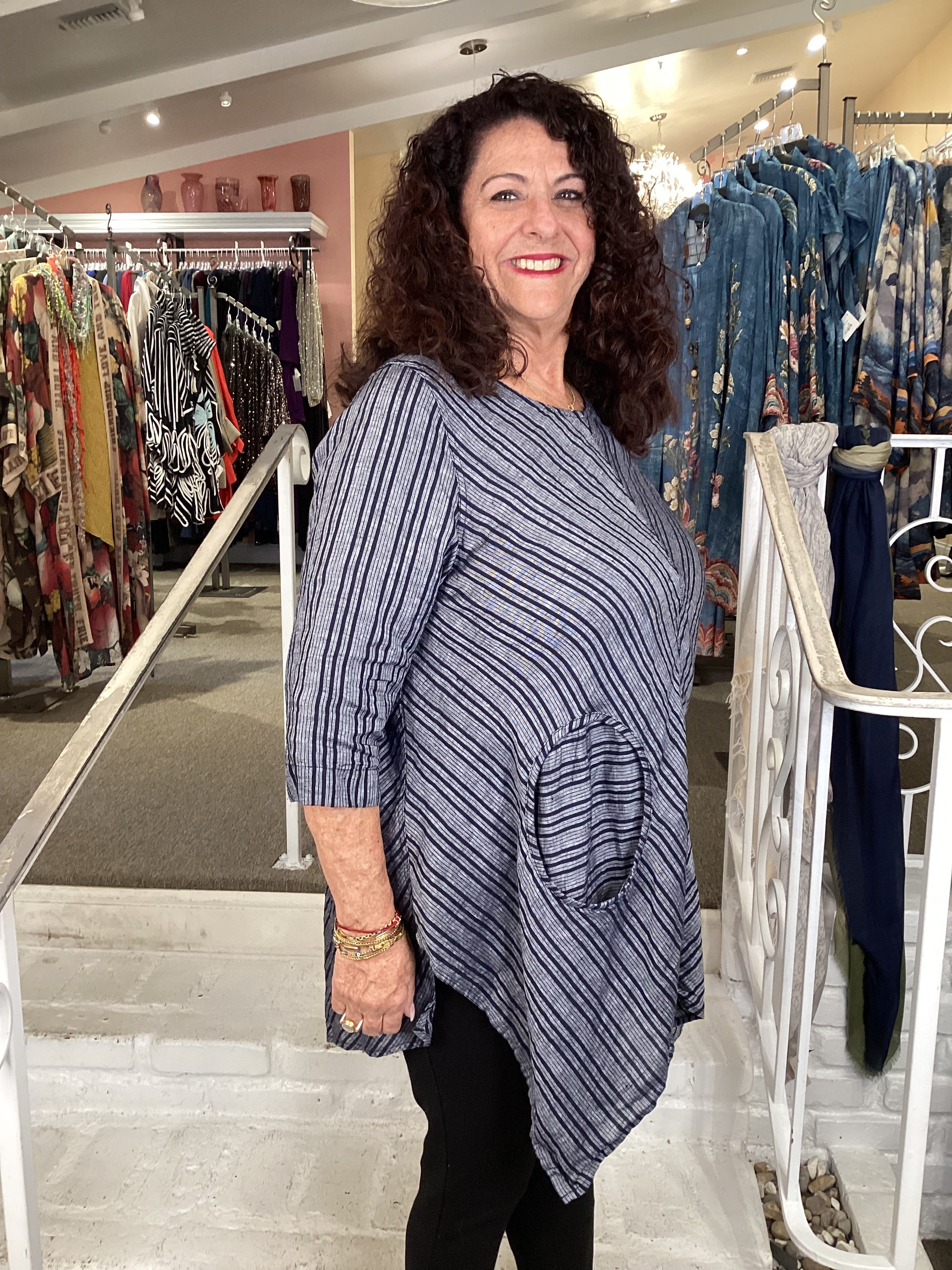 A signature Cheyenne design, this blue striped tunic showcases distinctive circular pockets that define the brand's aesthetic. The flattering A-line silhouette widens through the hips with a pointed front hem for added dimension. Three-quarter length sleeves complete this versatile piece, offering both comfort and style for everyday wear.