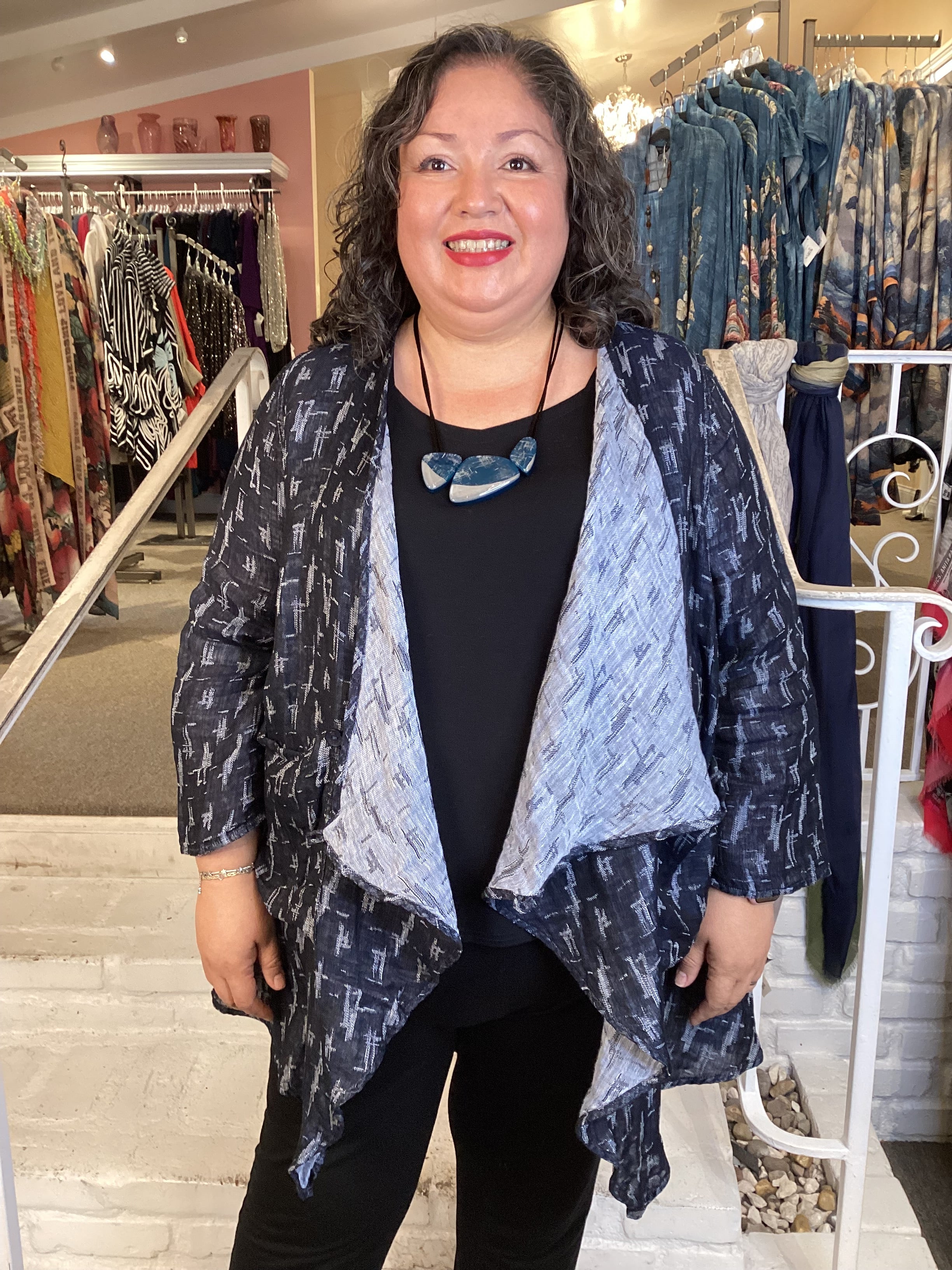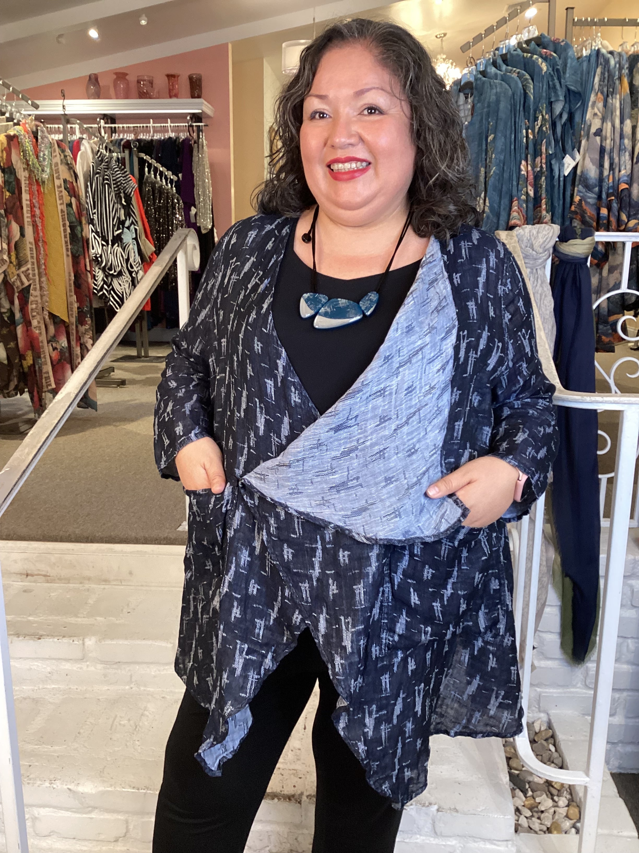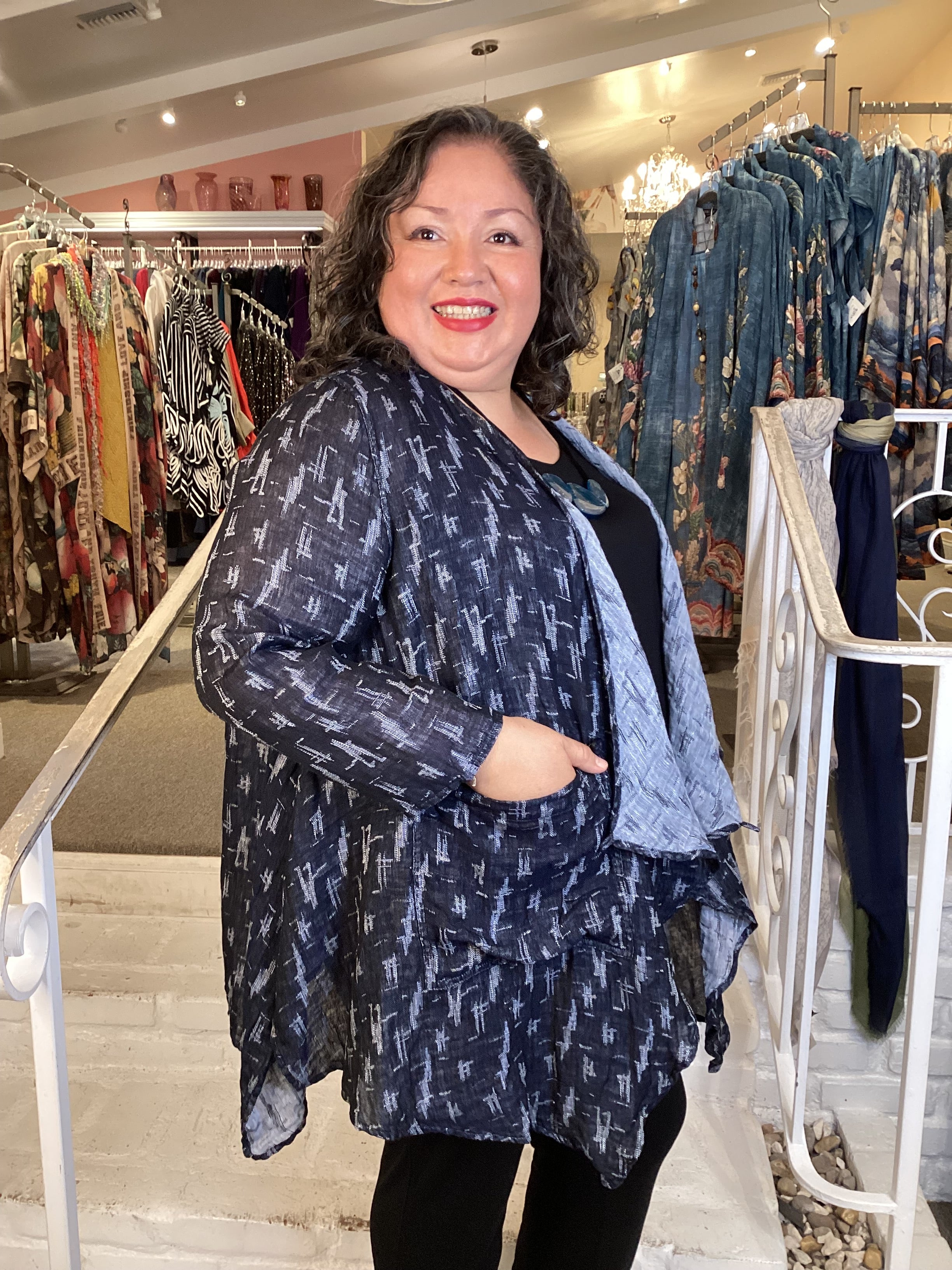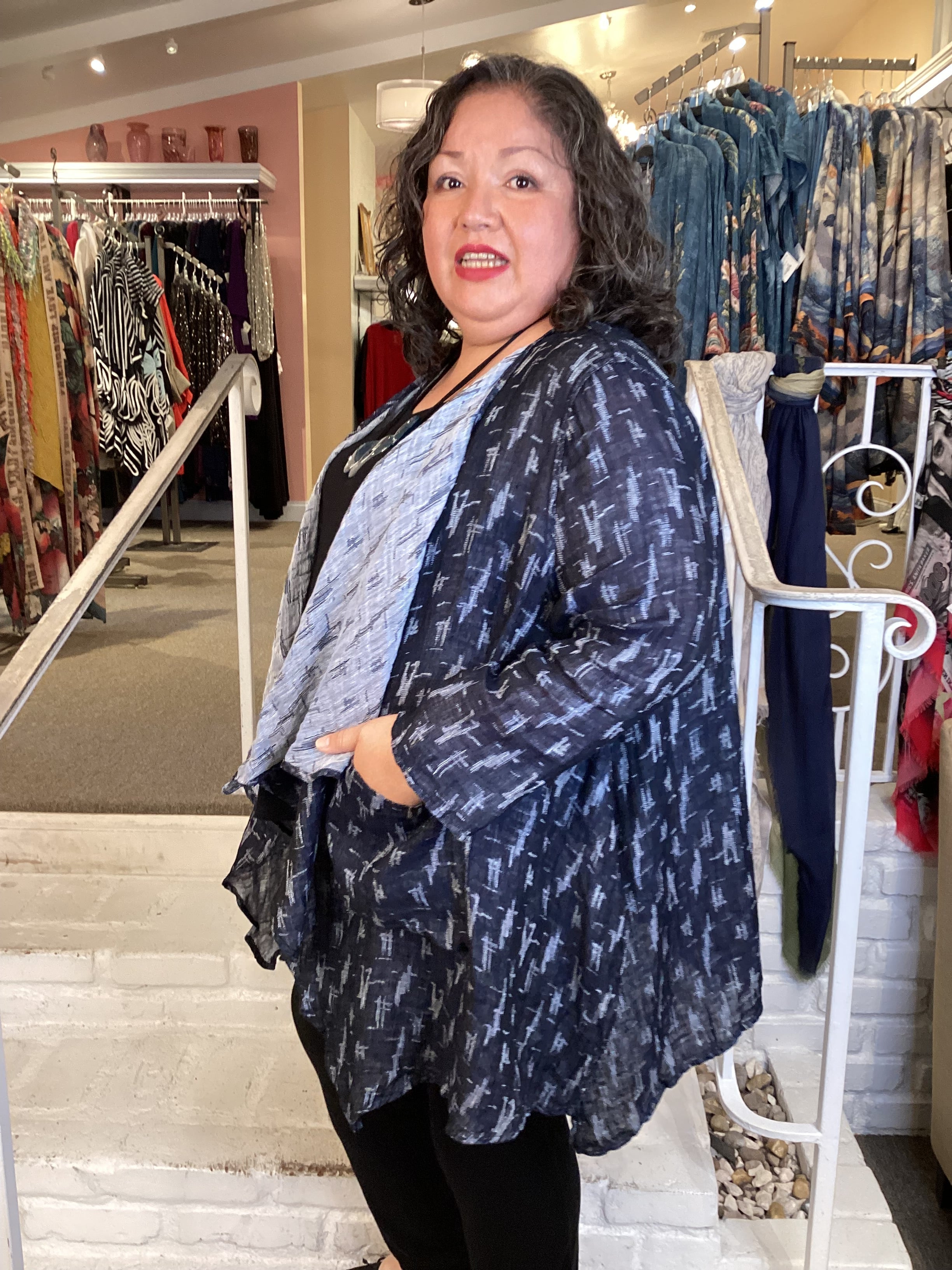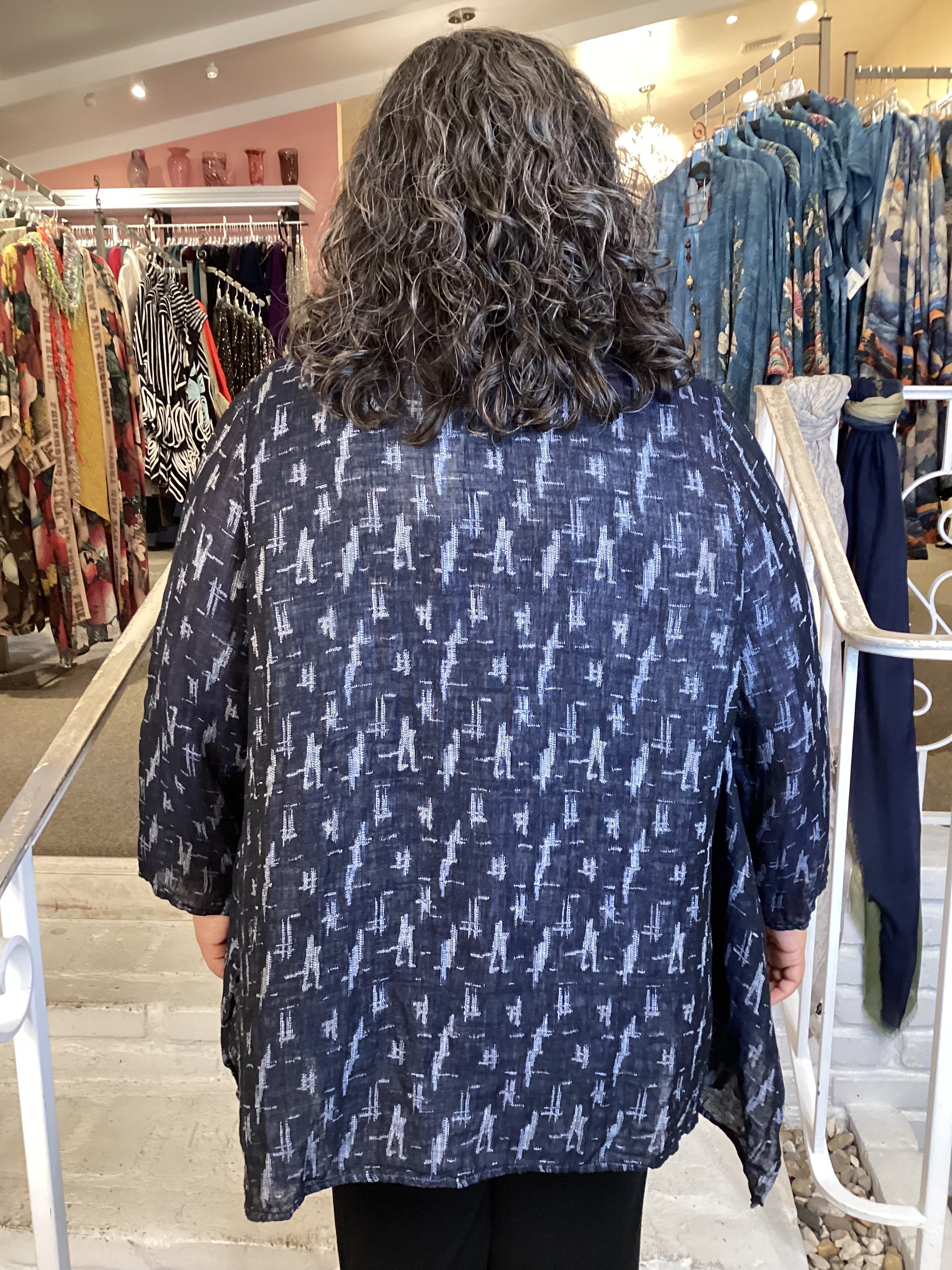A versatile layering essential, this double-layer linen gauze jacket transitions seamlessly through seasons. The navy and grey ikat pattern pairs effortlessly with diverse wardrobes, while pointed lapels offer styling flexibility—wear them folded back or buttoned closed. Generous hip proportions and functional front pockets ensure both comfort and practicality..