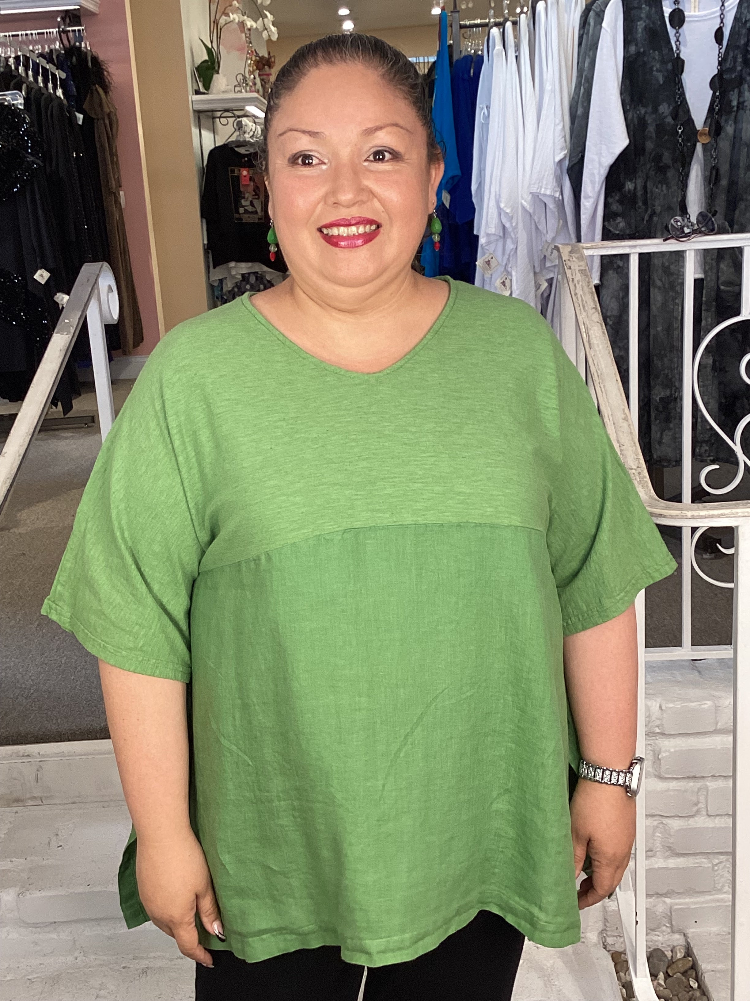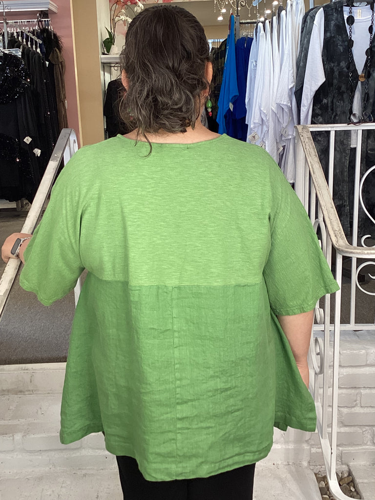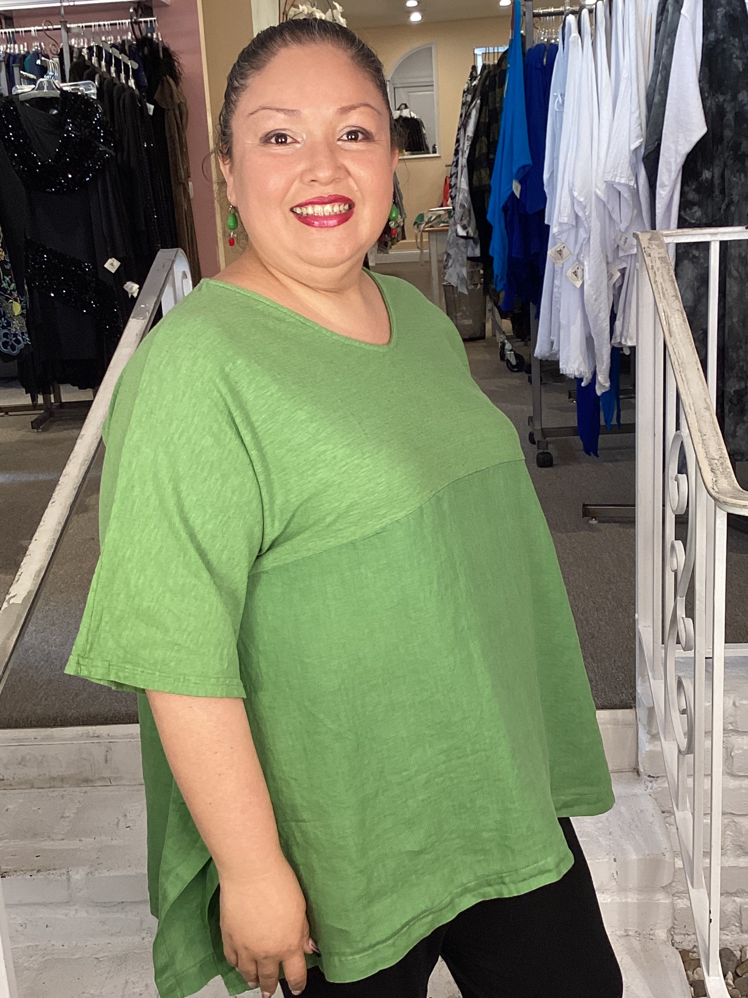 This Cut Loose top will become your go-to and pairs perfectly with everything. Cut Loose brought back the Artist Top after a hiatis, we are so happy to see it again. This top offers excellent coverage in a hanky weight linen-cotton combination. This top is a generous cut and falls in a figure flattering way. Elbow length sleeves keep you covered but cool, other details include a V-neckline, curved hemline with side slits and an empire waist.