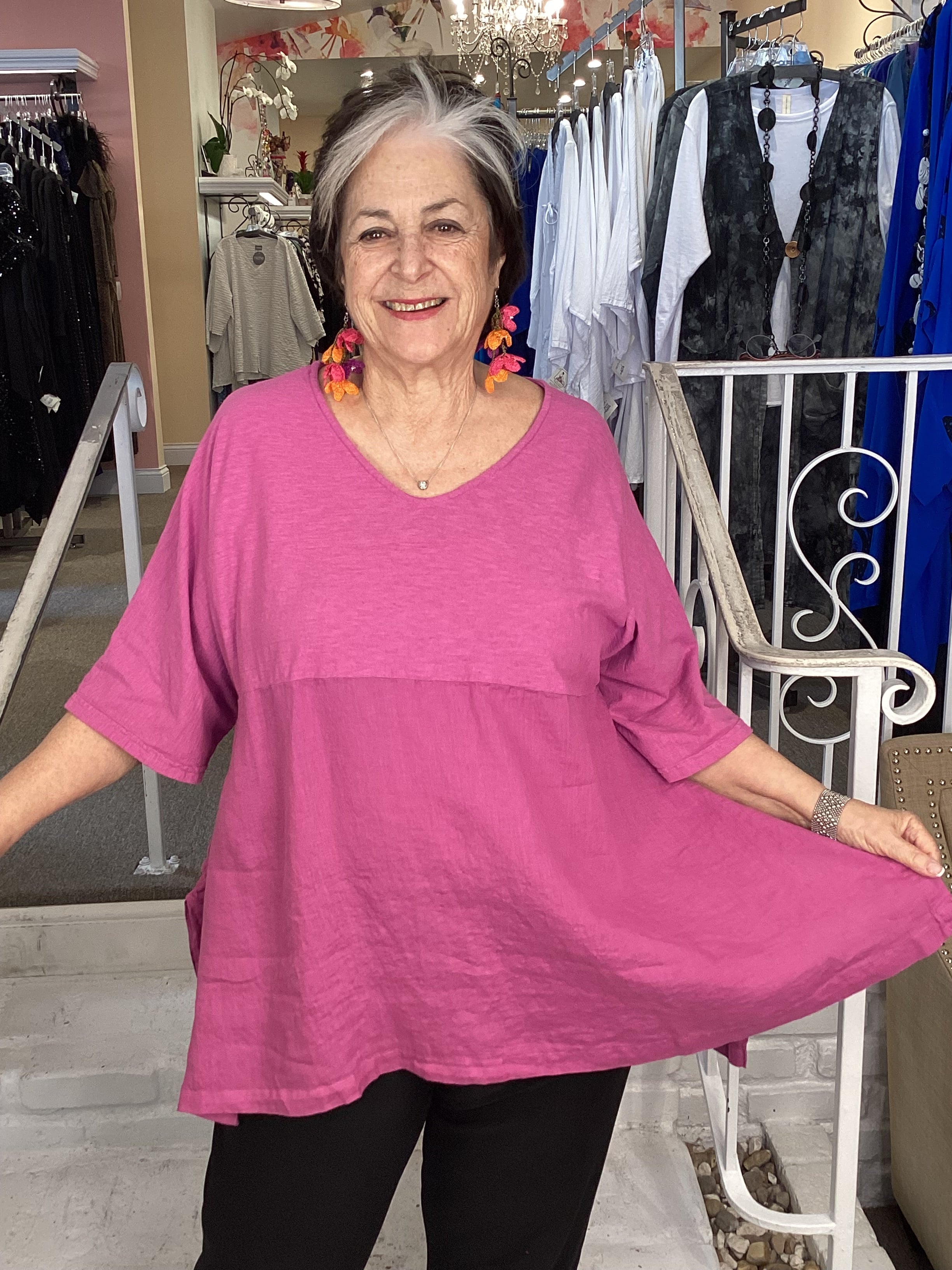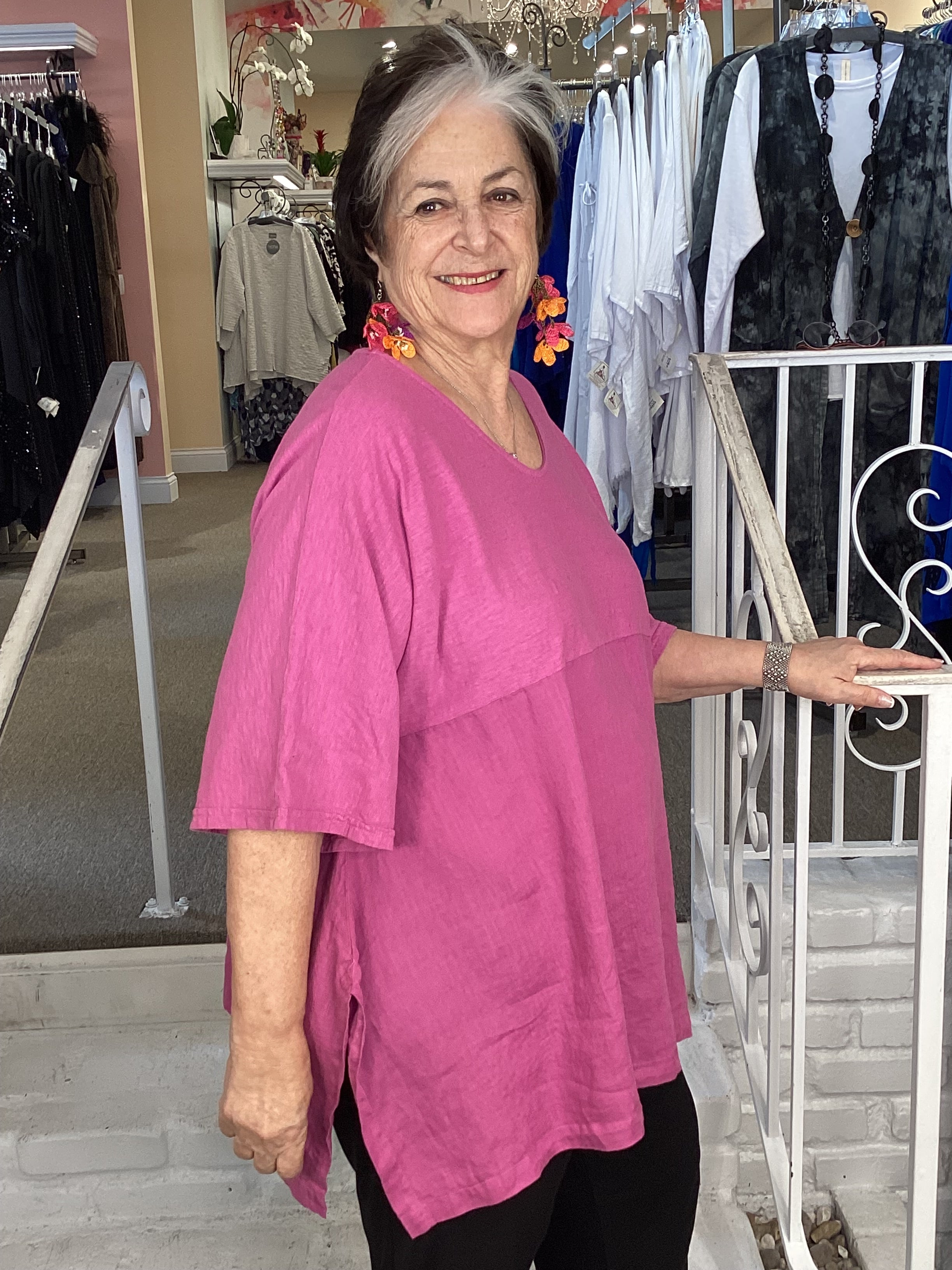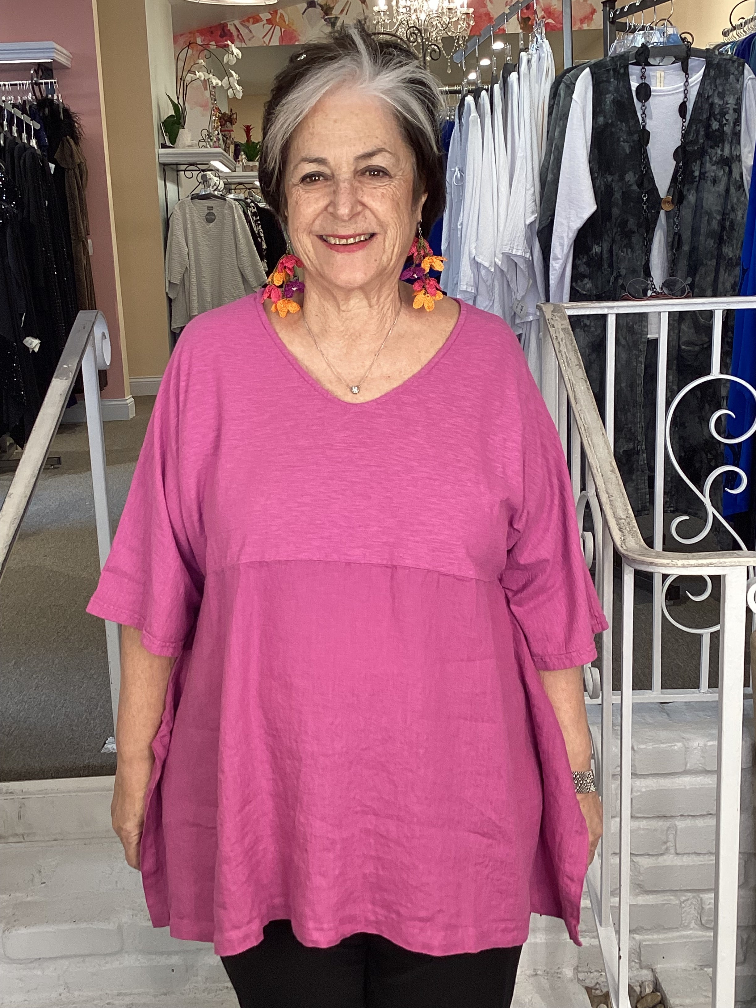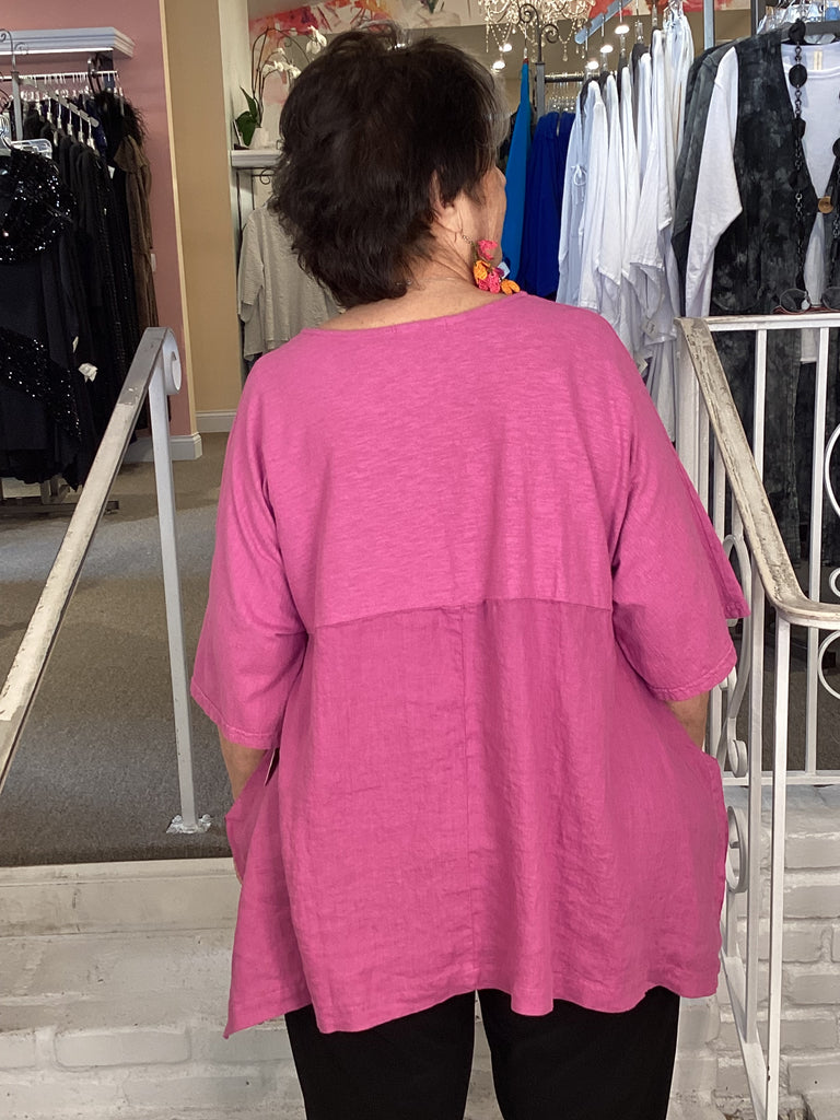 This Cut Loose top will become your go-to and pairs perfectly with everything. Cut Loose brought back the Artist Top after a hiatis, we are so happy to see it again. This top offers excellent coverage in a hanky weight linen-cotton combination. This top is a generous cut and falls in a figure flattering way. Elbow length sleeves keep you covered but cool, other details include a V-neckline, curved hemline with side slits and an empire waist.