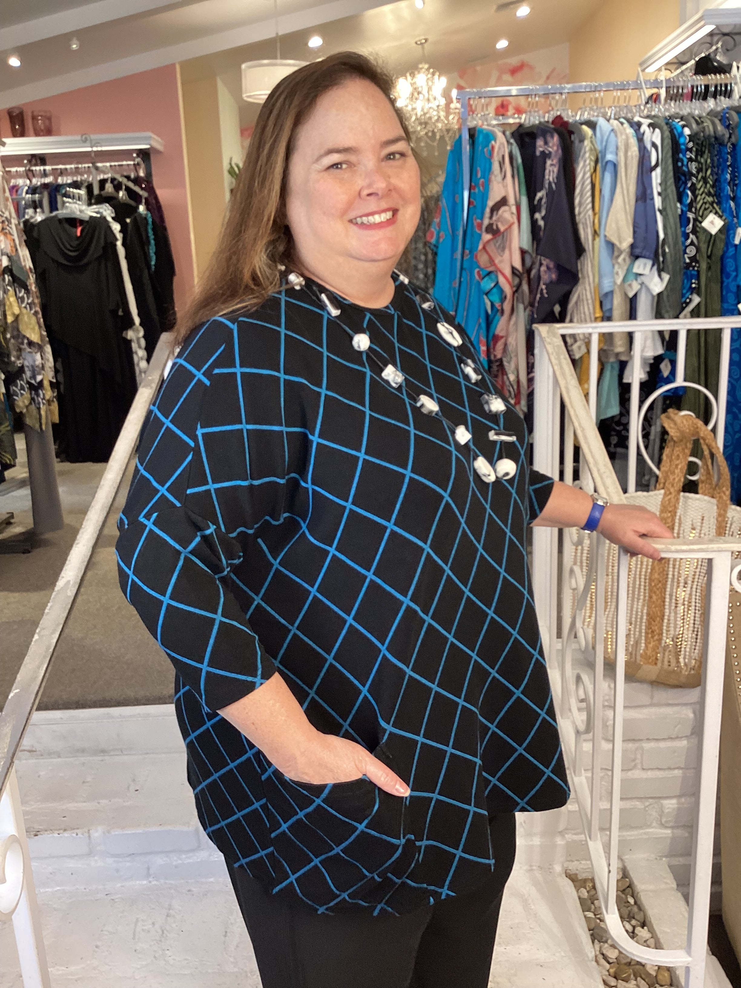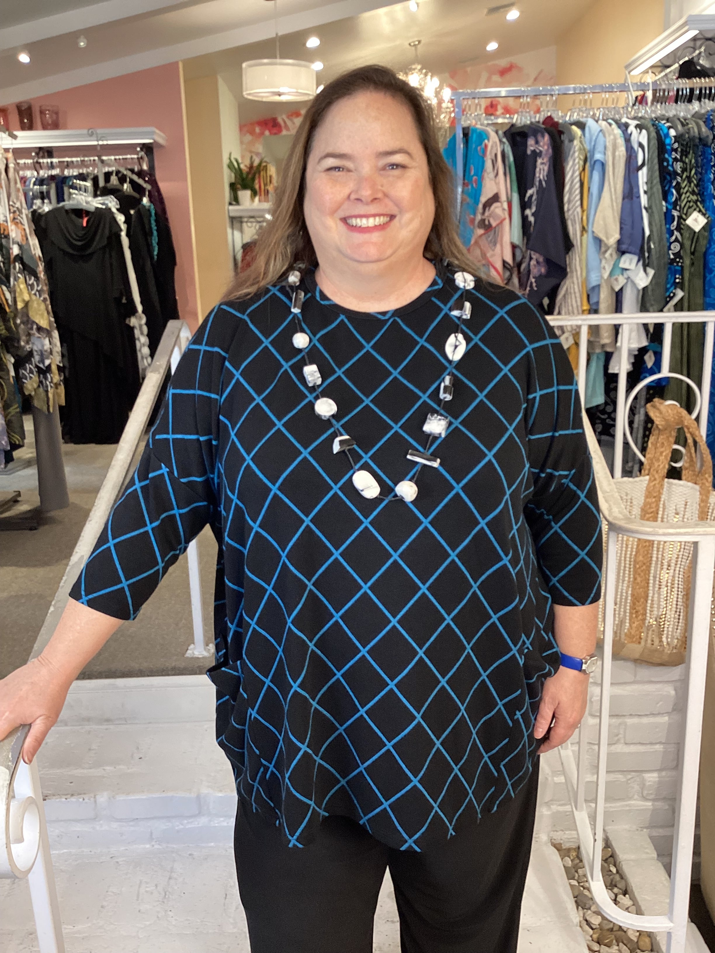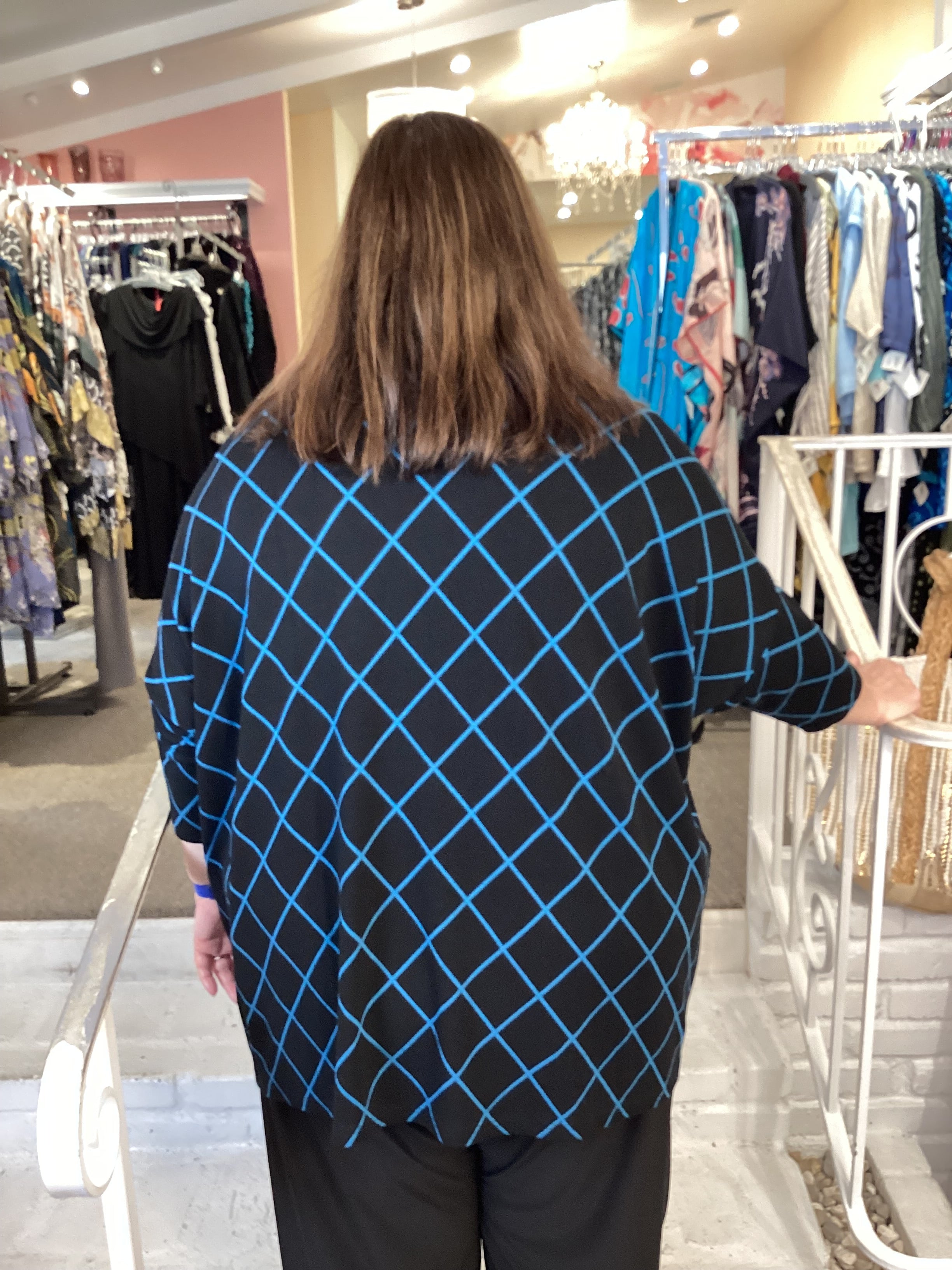 This one size tunic with two pockets is a little wider cut and has a beautiful diamond pattern. It's a perfect example of a relaxed and easy to wear top.
