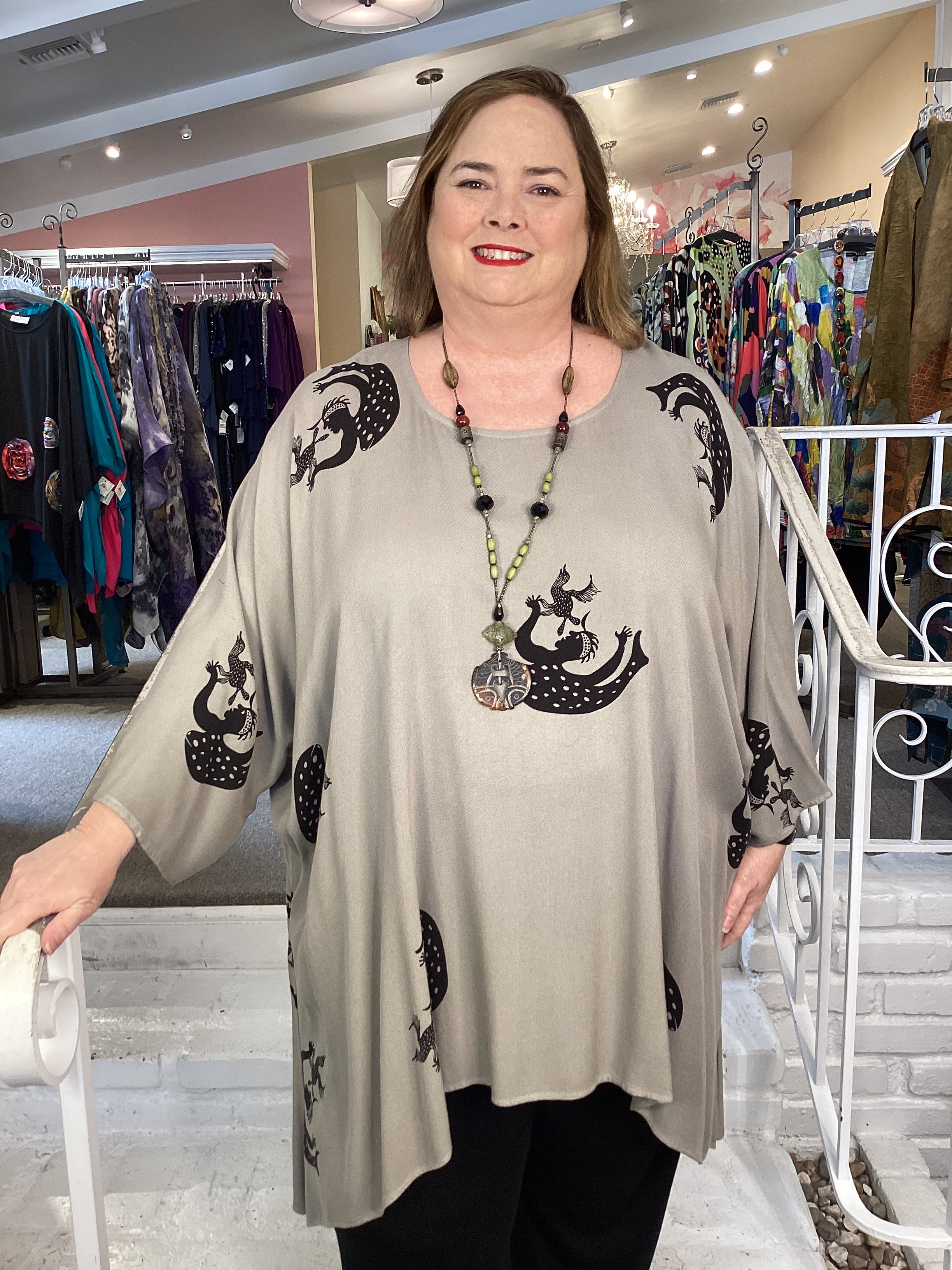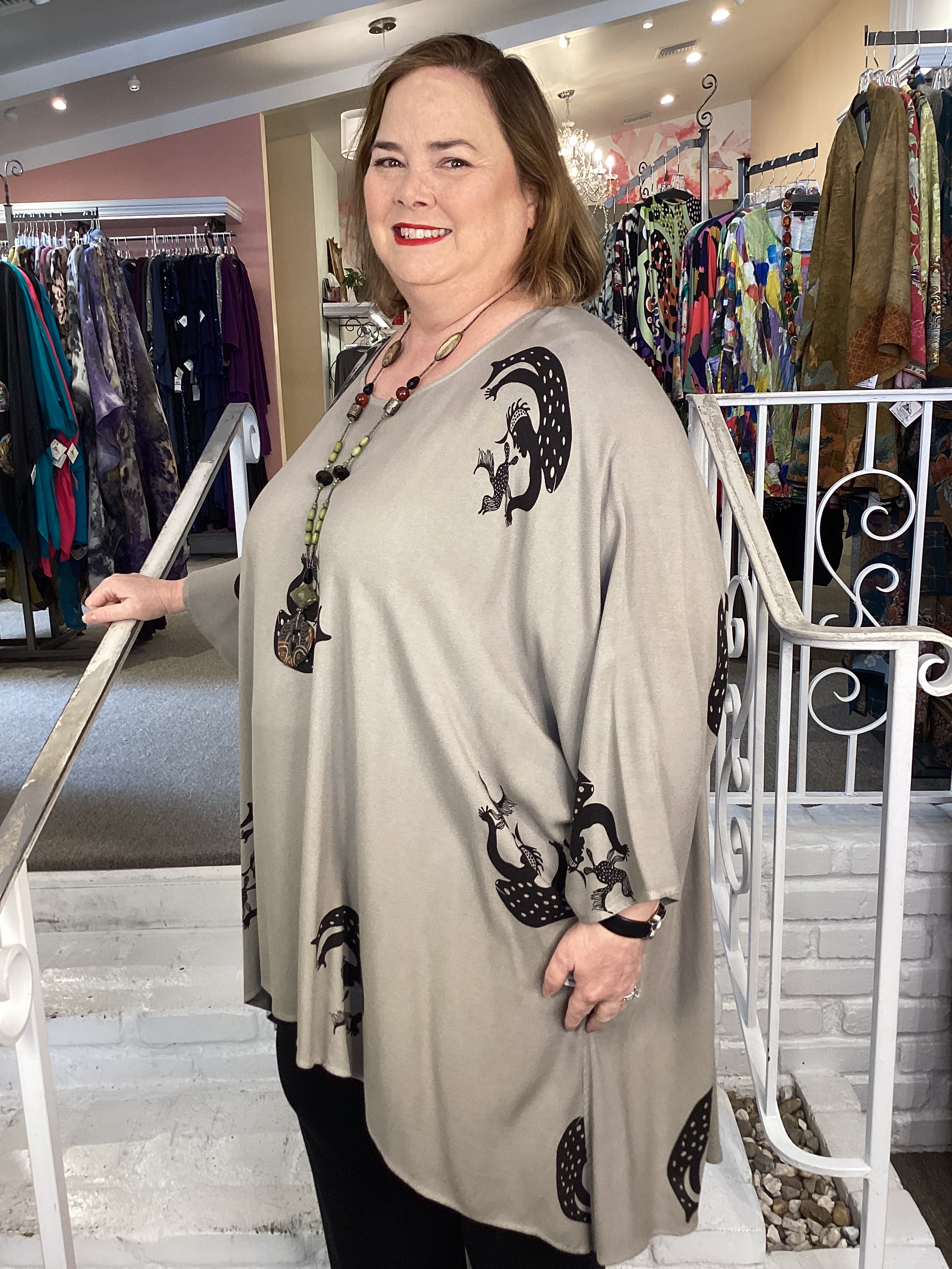 Elevate your everyday wardrobe with this versatile hi-lo tunic in rich British taupe. The relaxed silhouette pairs beautifully with three-quarter sleeves and an asymmetrical hemline that flatters and elongates. Crafted for all-day comfort without compromising on style, this piece transitions seamlessly from casual outings to layered looks. A wardrobe essential that delivers both ease and sophistication.