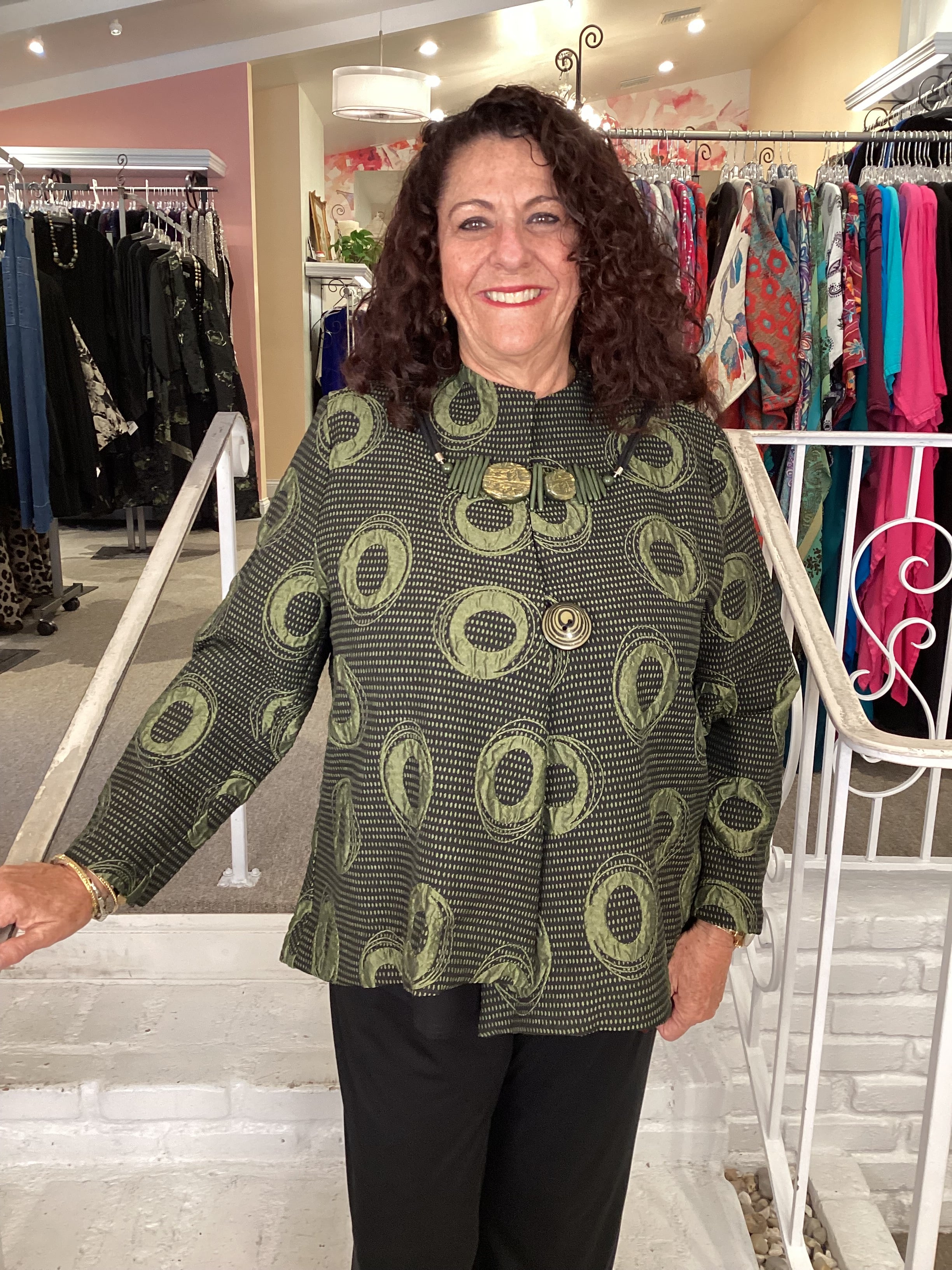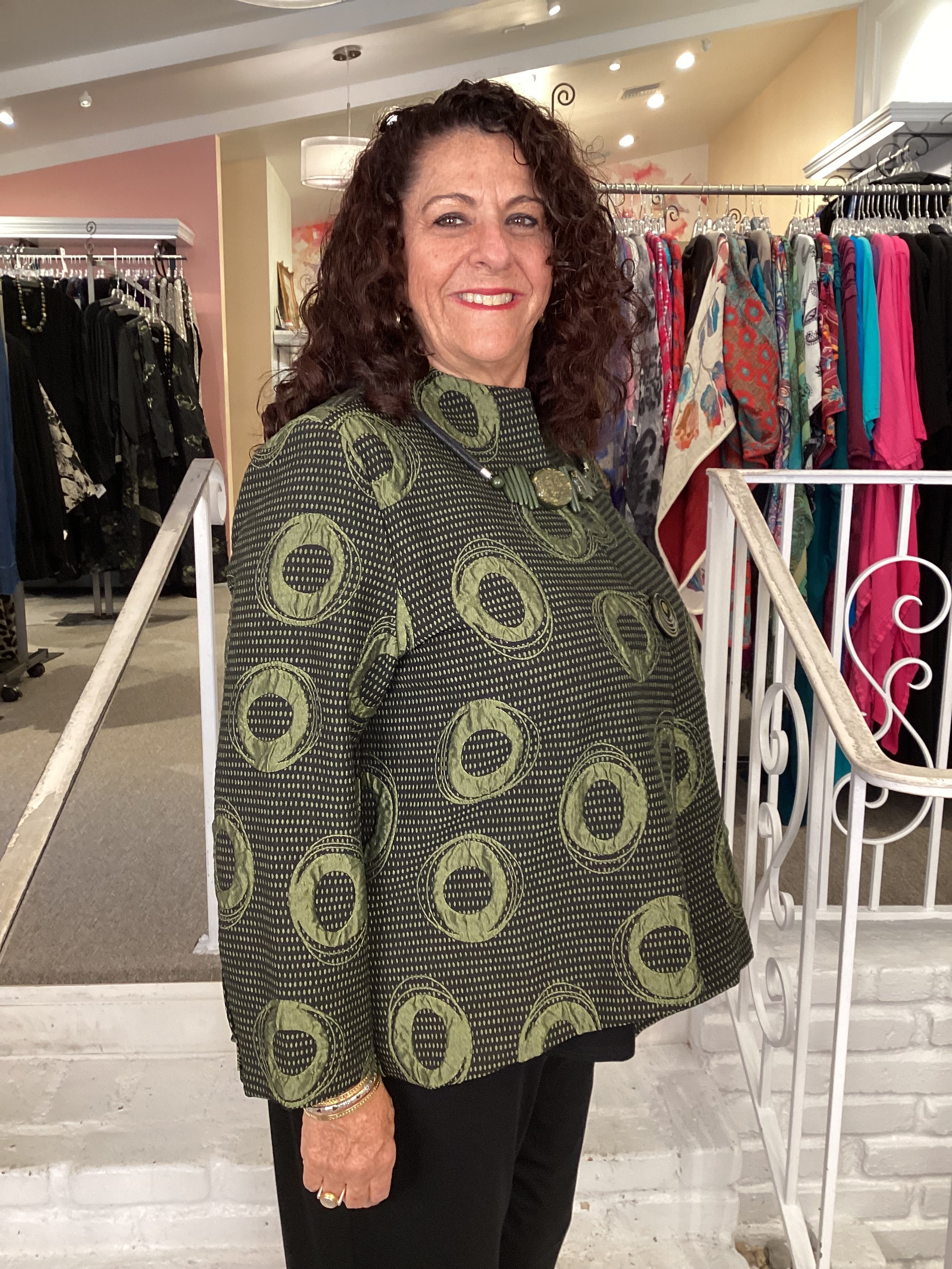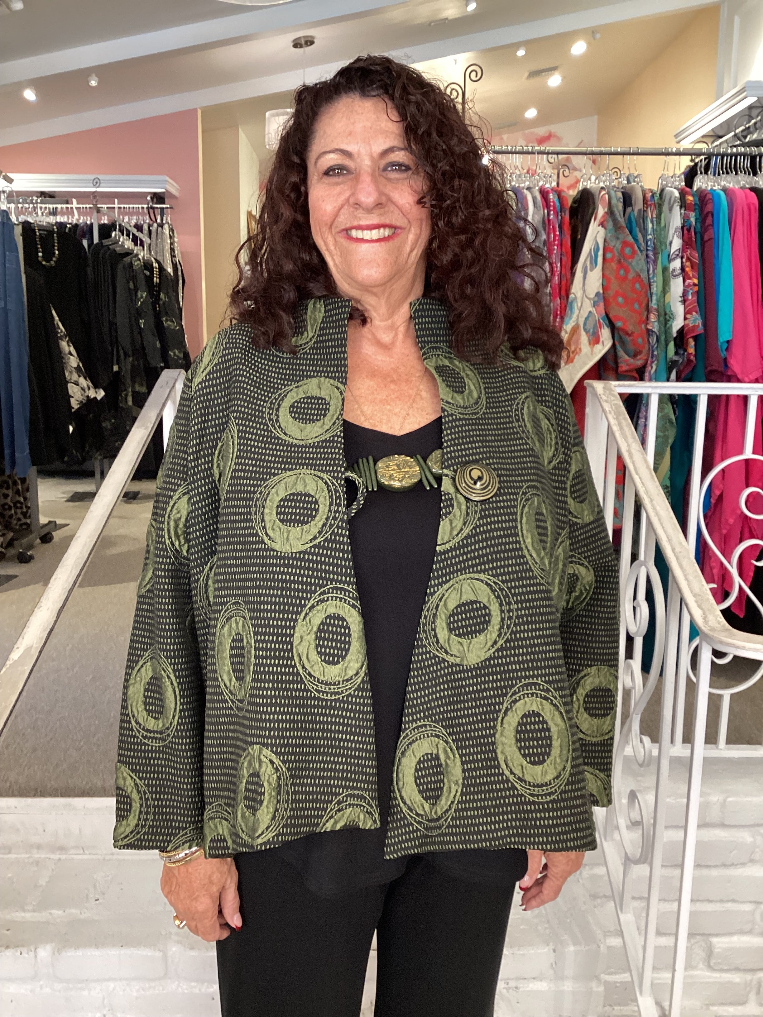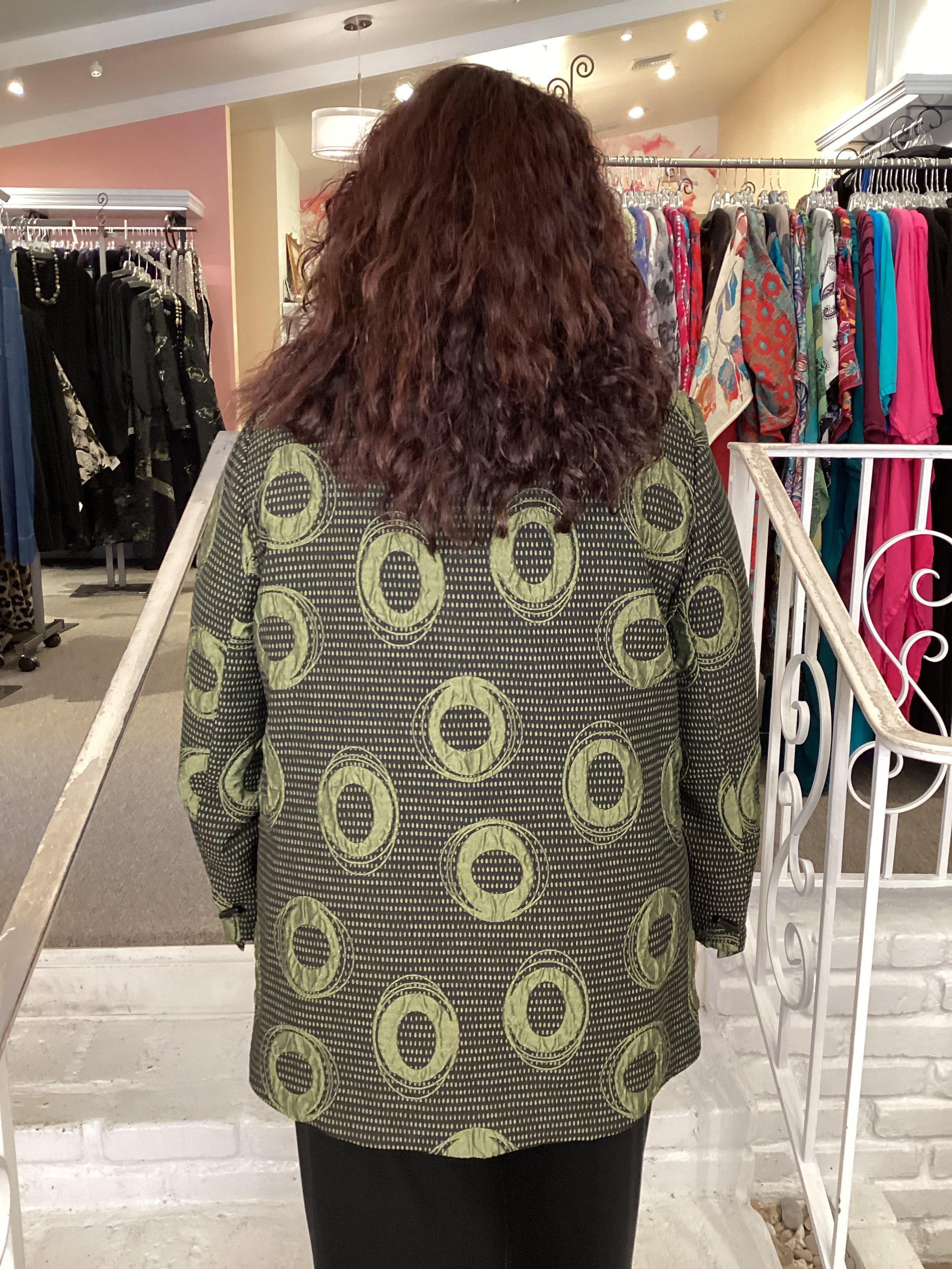 Turn a plain black outfit into something extra special with this IC collection jacket.  A single button closes the asymmetric front panels with a high low hemline.  Very unique black/olive jacquard fabric makes a fashion statement!  The bust measures about 50", front length is 25/27", back length is 28".