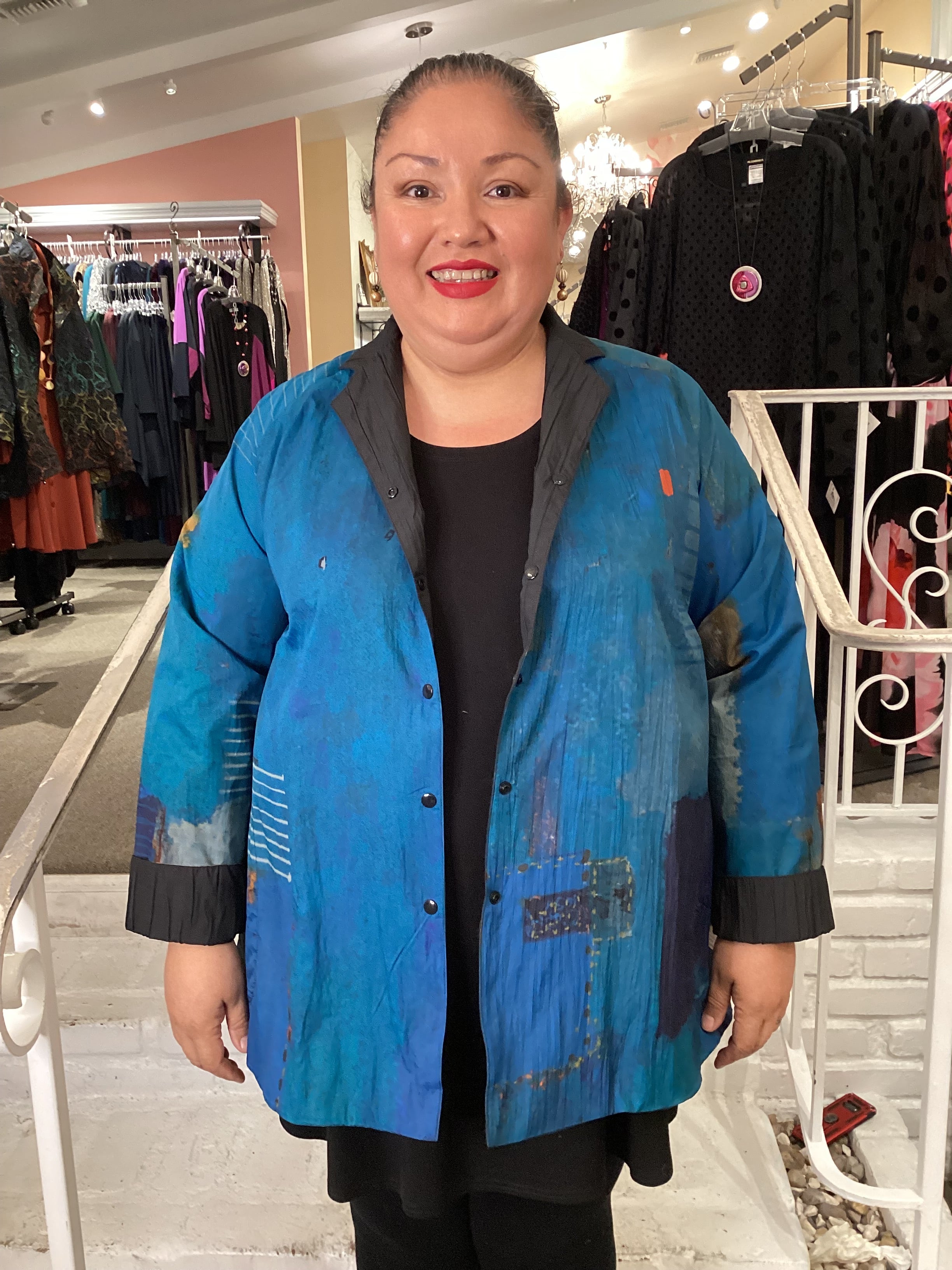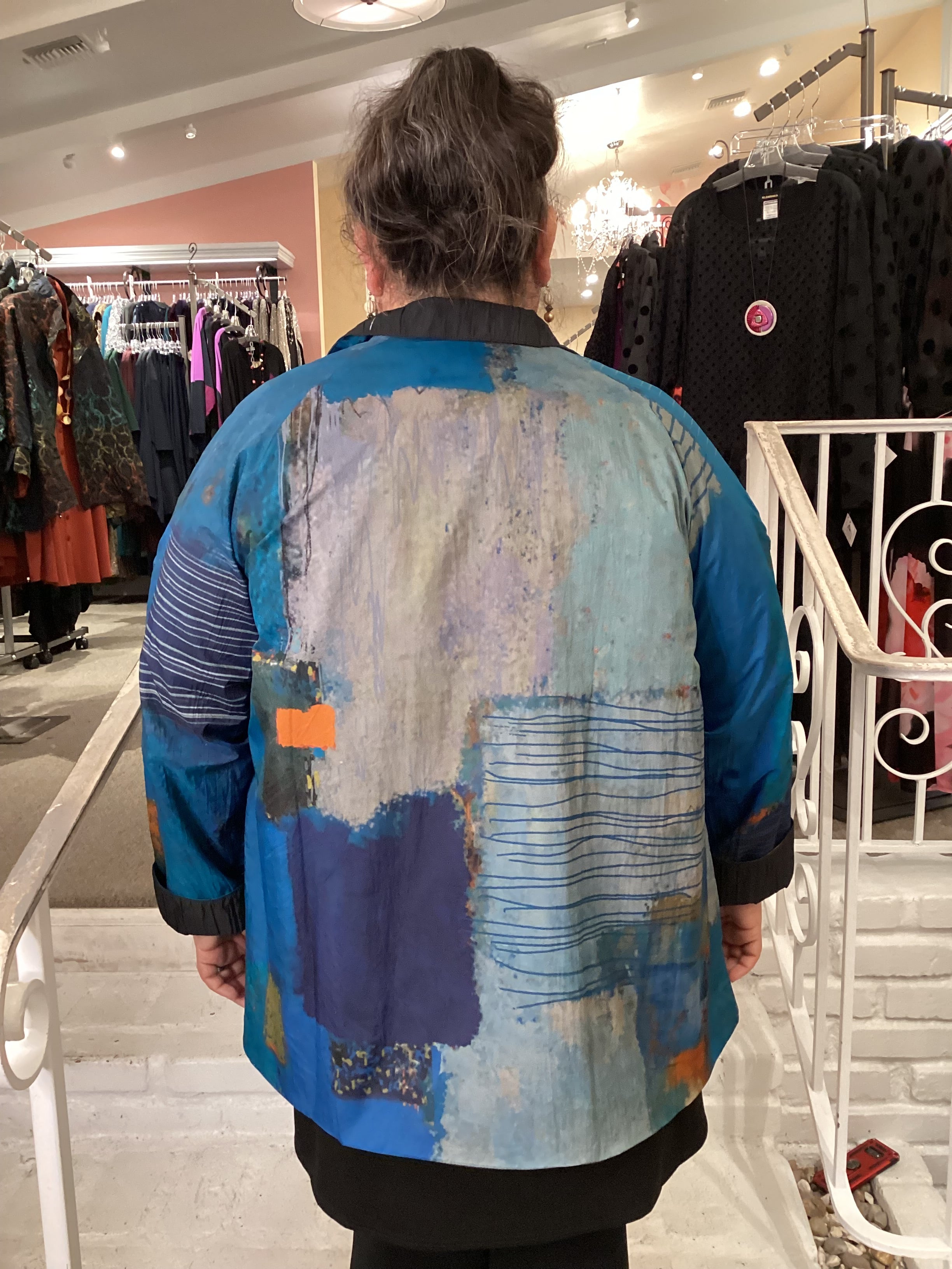 3 Potato takes its signature prints to a new level this season by marrying them to a lightweight quilted material for the ideal fall-weight jacket. It has a snap-front placket, with an oversized, boxy silhouette and even hemline. The jacket is fully reversible, so it can be worn on the solid black side as well.  Turn the collar/lapel back or let it stand up.  Bust measures 48", length 29"