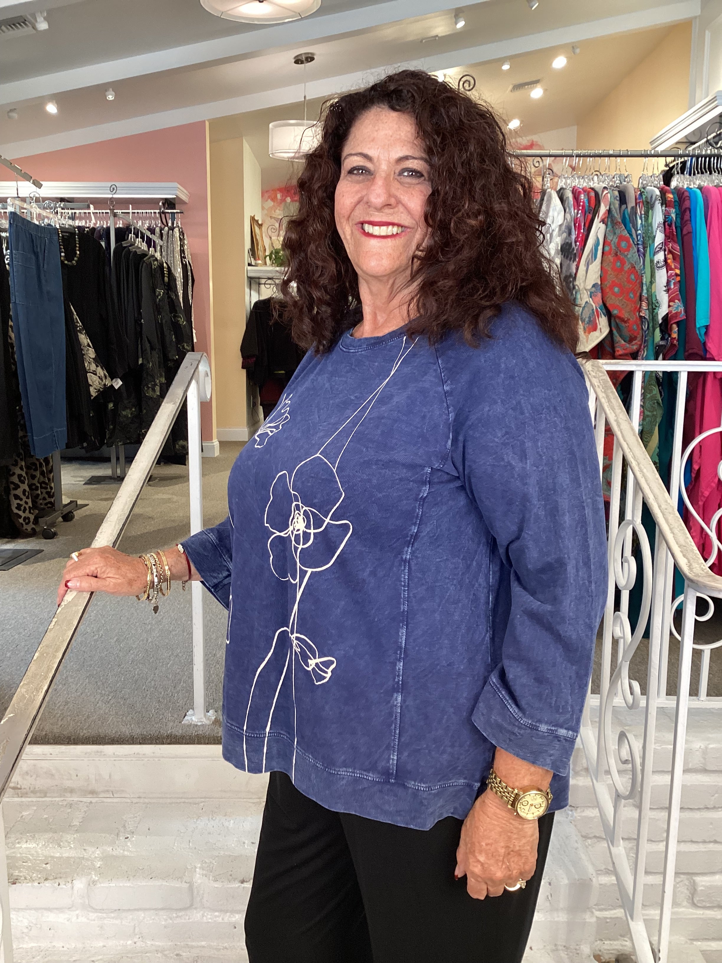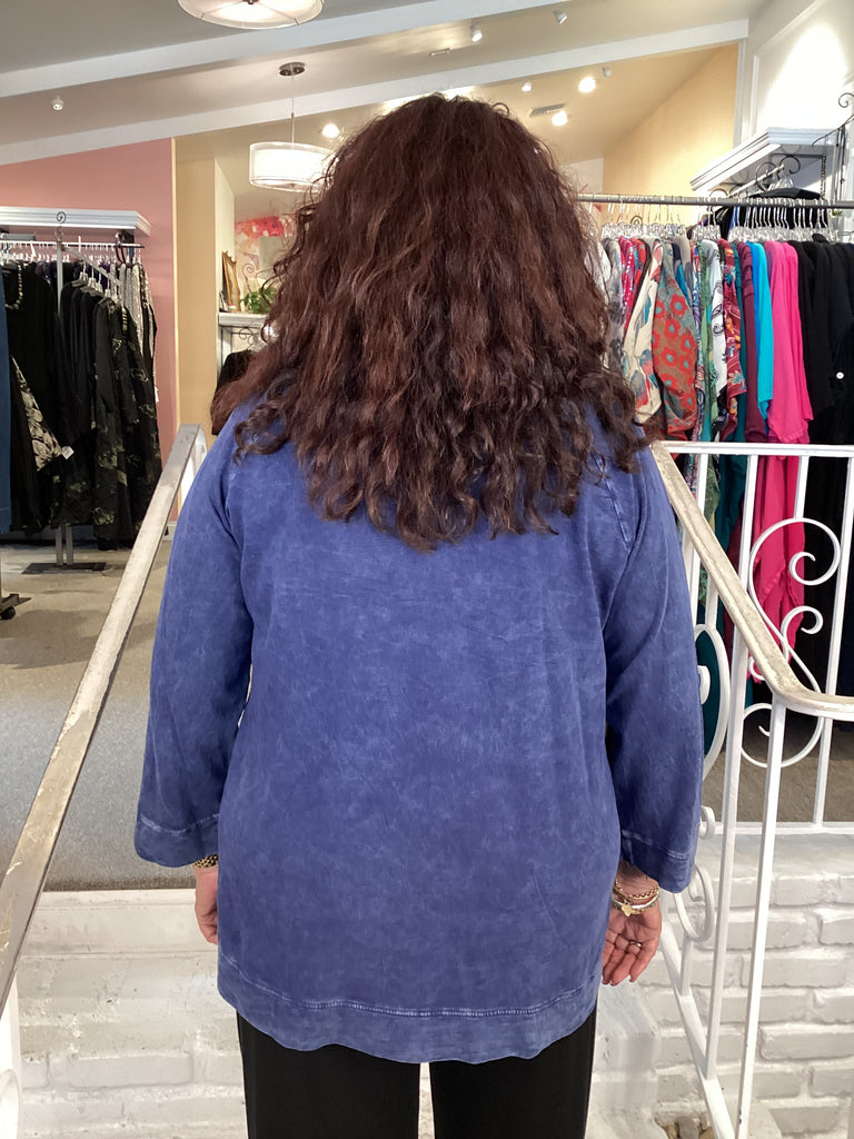 Slip into the Violet Stars Mineral Washed French Terry Top for a laid-back look that shines. Made from cotton French Terry, this 3/4 sleeve favorite feels cozy and breathable, keeping you comfy all day long. With its fun star print and flattering scoop neckline, it adds a dash of whimsy to your everyday outfits. Perfect for layering or wearing solo, this top makes casual style easy and charming.