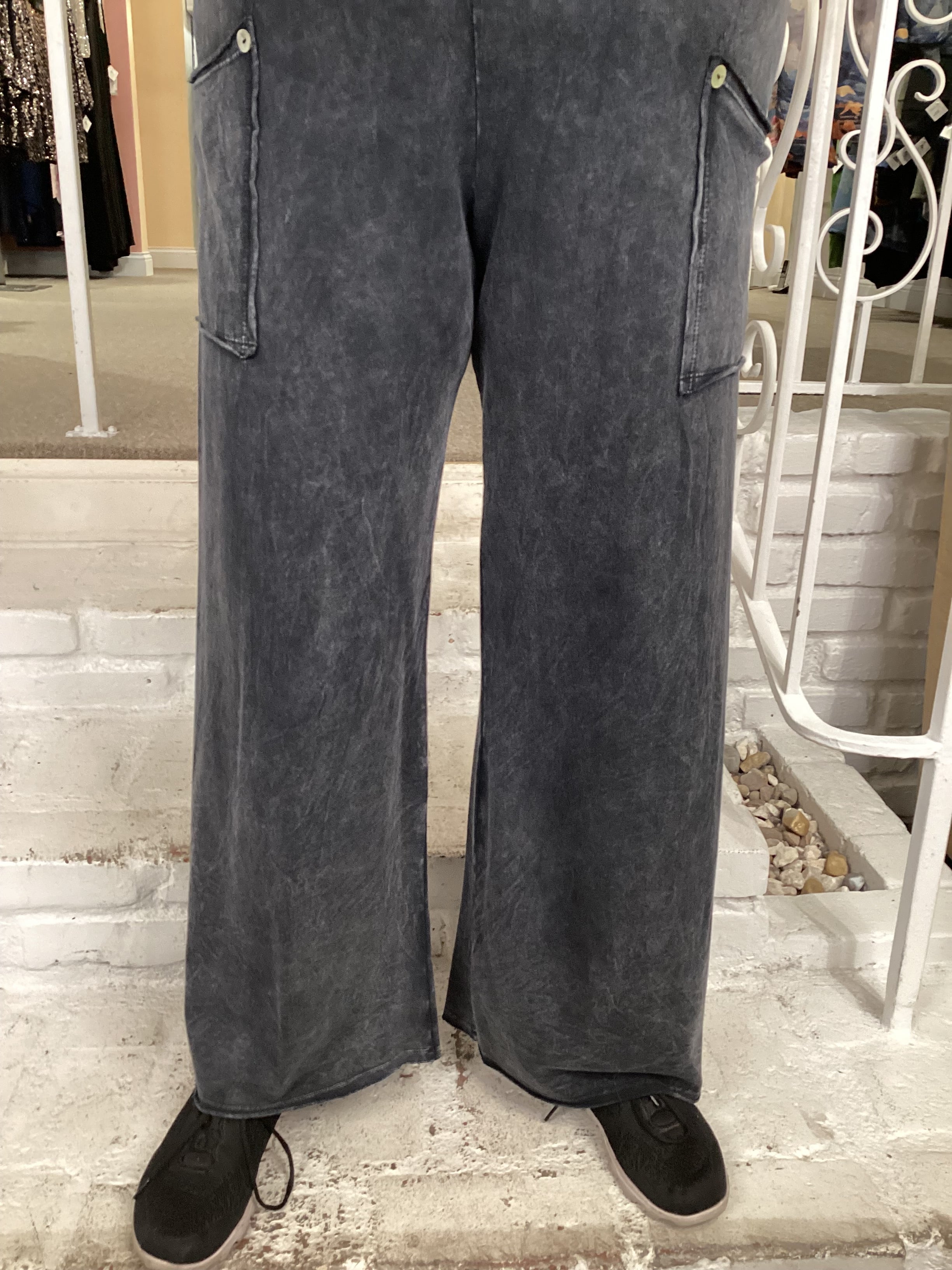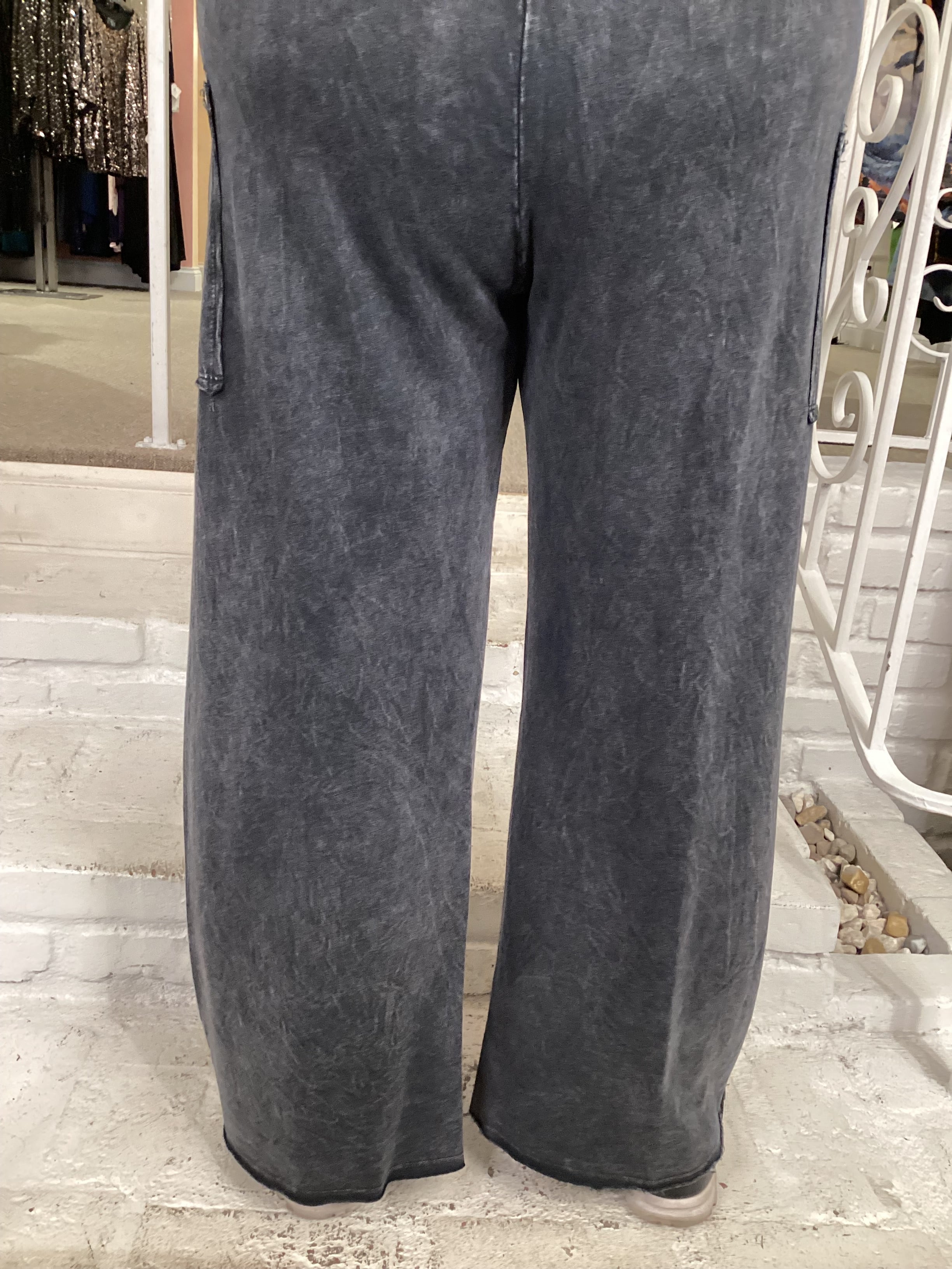 Comfortable cotton pants with a mineral-washed finish and wide-leg fit. Features a high-rise stretch waistband, pull-on design, and dual patch pockets with decorative shell buttons. The raw hemline and seams add a modern touch. Easy to wear, easy to style.
