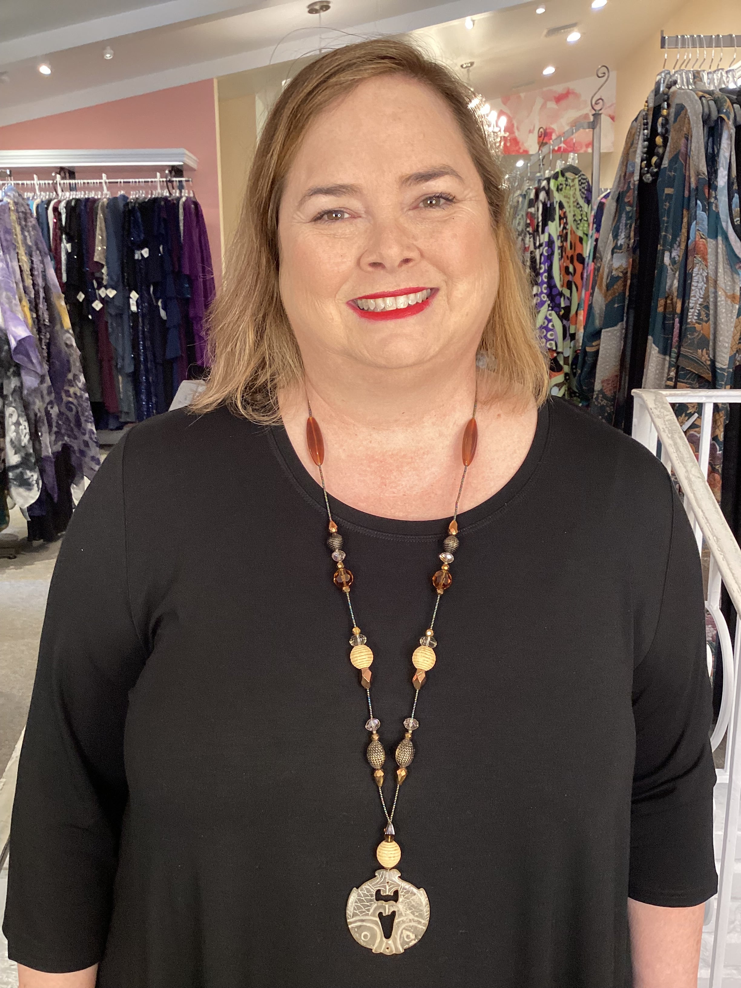 Elegant, one of a kind pendant necklace comprised of unique stone & glass beads and medallion. Individually made by local artist Sascha. 34" around.
