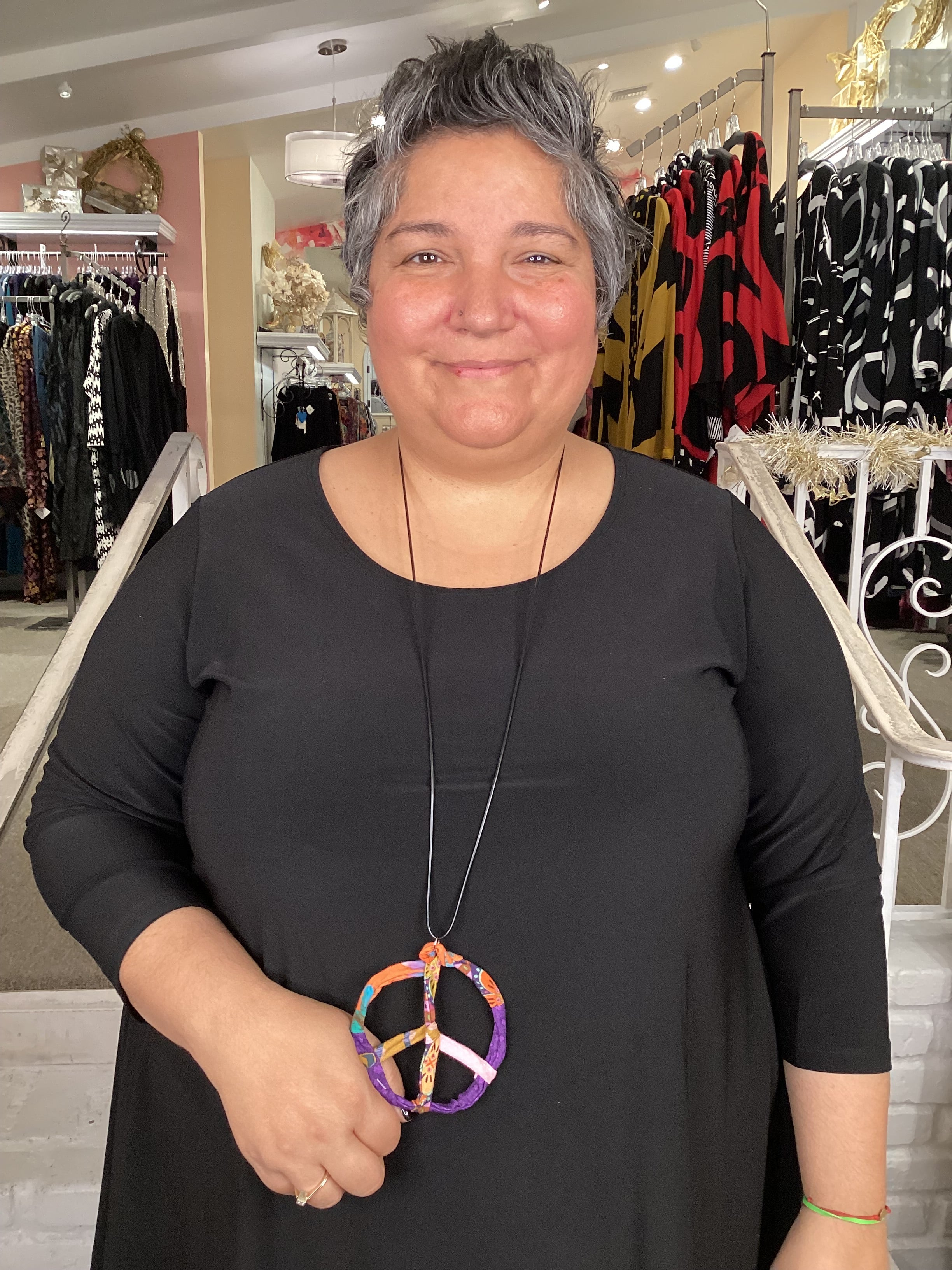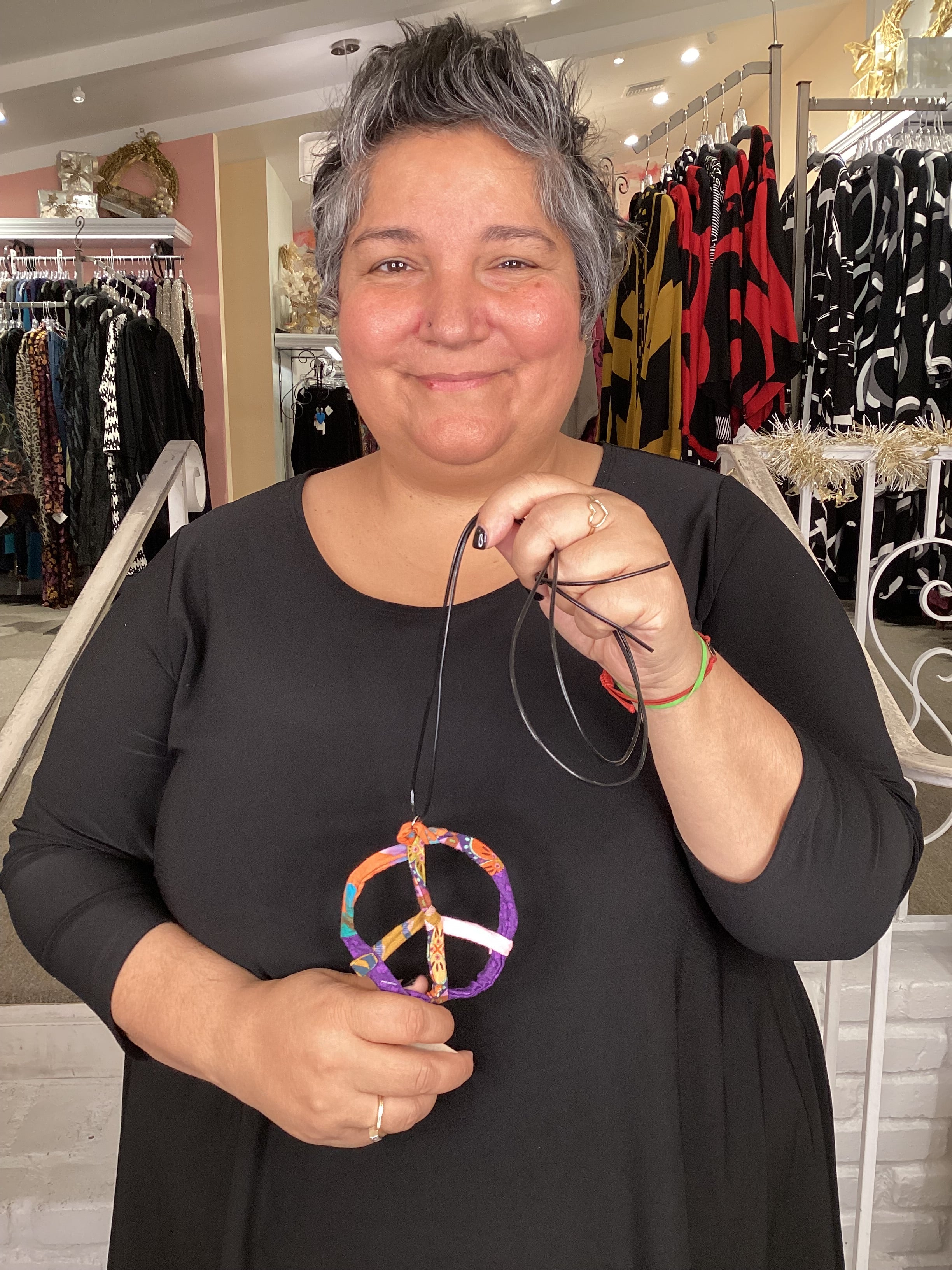 The Peace Sign pendant is always in style with different purple tone fabrics, and hangs from a thin, black cord. Approximately 20 inches long with a 40 inch circumference. The Peace sign is approximately 3.5 inches tall and 3.5 inches wide.