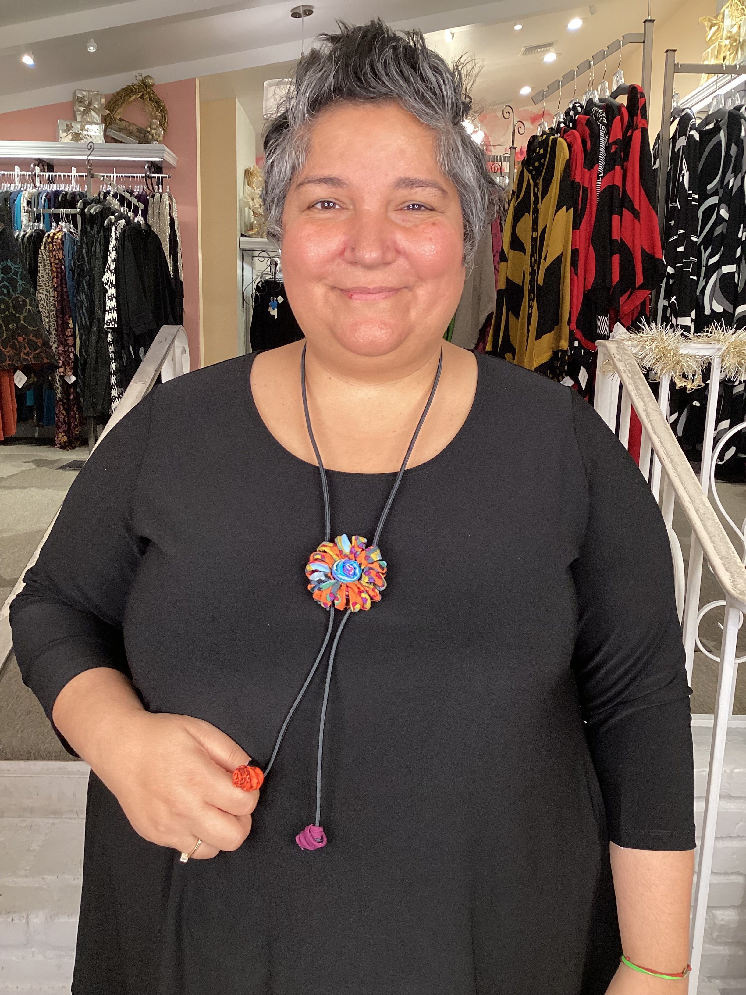 The new Mum design features twisted petals made from gorgeous fabrics on a black bungee cord base. The Mum moves up and down the cord, approximately 23 in. long (46 in. circumference).