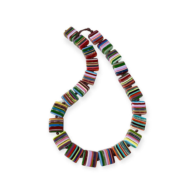 Unleash your bold side with this vibrant handcrafted resin necklace, where geometric squares pop with playful stripes in a rainbow of hues. Crafted by skilled Brazilian artisans, every necklace is a one-of-a-kind treasure . Mix and match it with your other favorites, wear it front and center, or let it be the witty accessory your style has been craving. Pure fun you can actually wear. Each necklace is a one of a kind. No two are alike so there may be minor differences in selected elements. total 24"