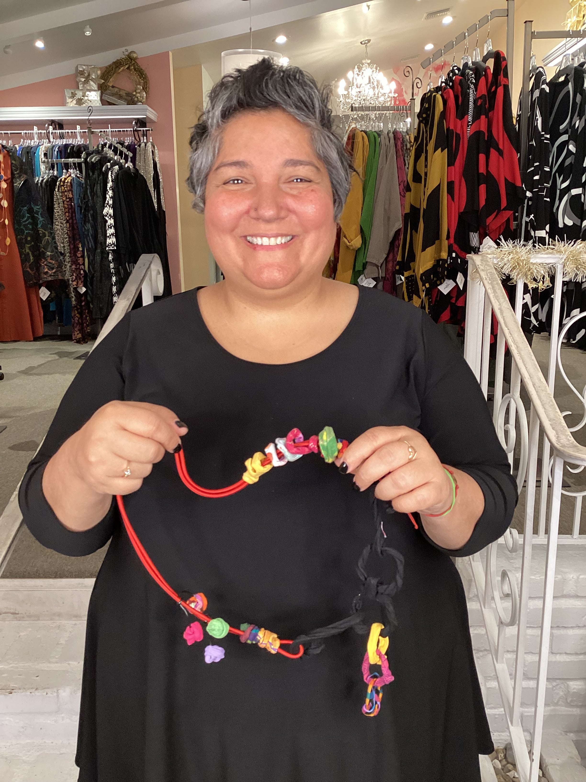 In a nod to Iris Apfel, Fickelstics has honored the amazing style icon with this necklace we named “Art Teacher”. She taught us all to be bold and colorful and fearless in what we wore! This necklace incorporated her famous round black glasses on a “chain” of Ficklesticks beads and baubles. Approximately 15 in. diameter, 31 in. circumference
